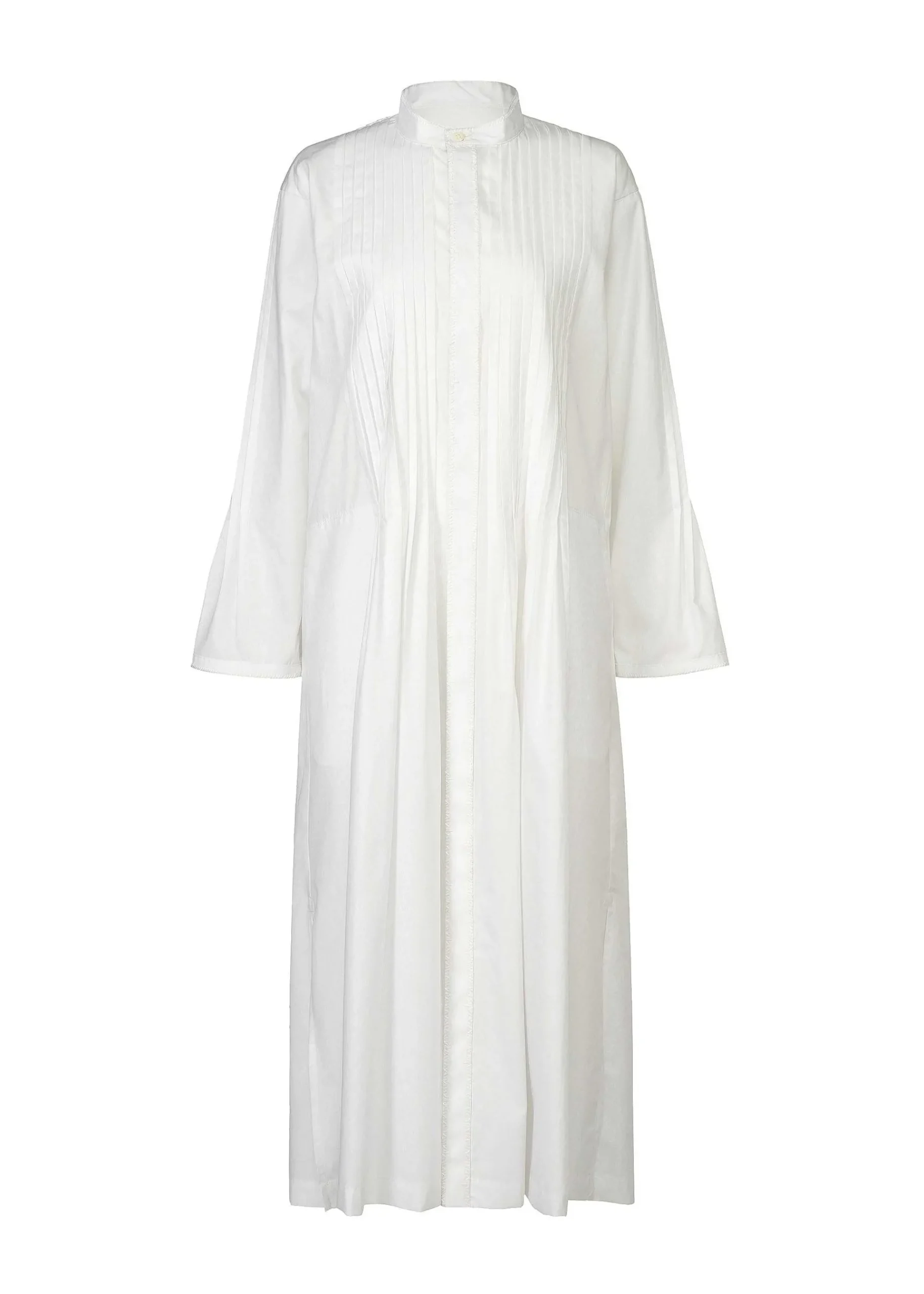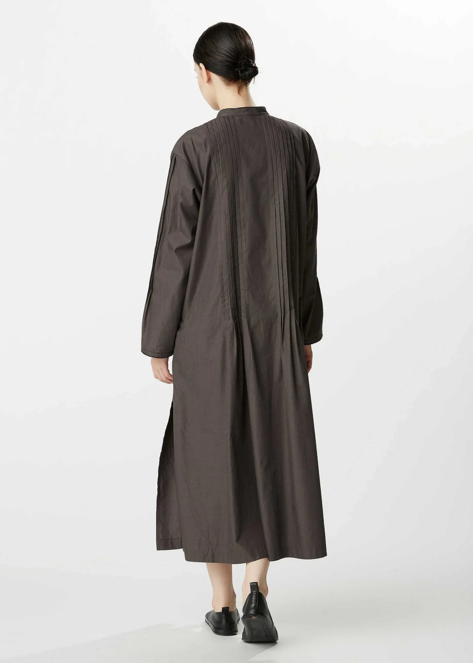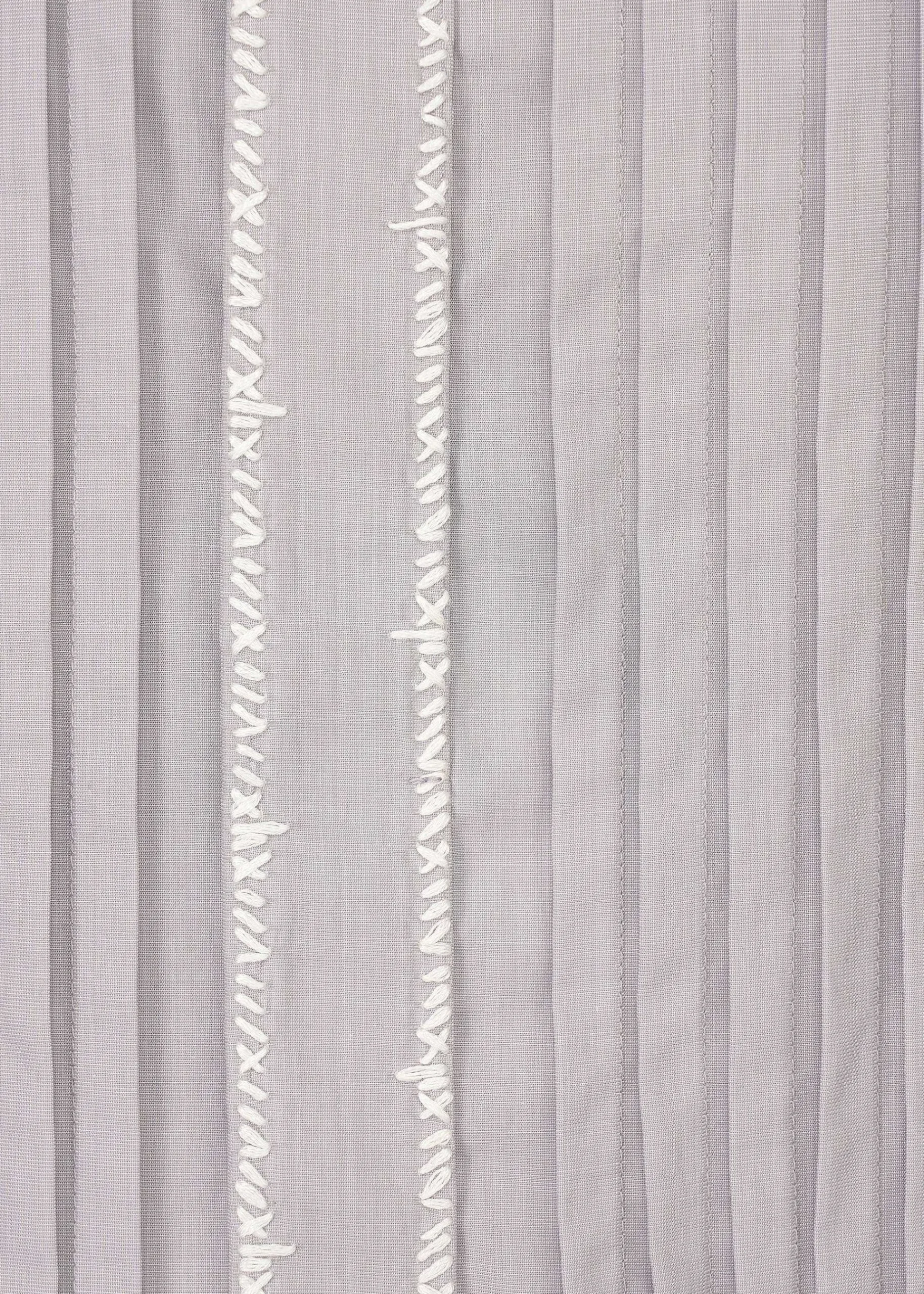 A Stand-Up Collar Long-Sleeved Long Shirt Made Of Cotton Broadcloth Material That Is Soft To The Touch. The Random Stitch Embroidery And Fine Pin Tucks Are Done By Hand Using Thick Thread.