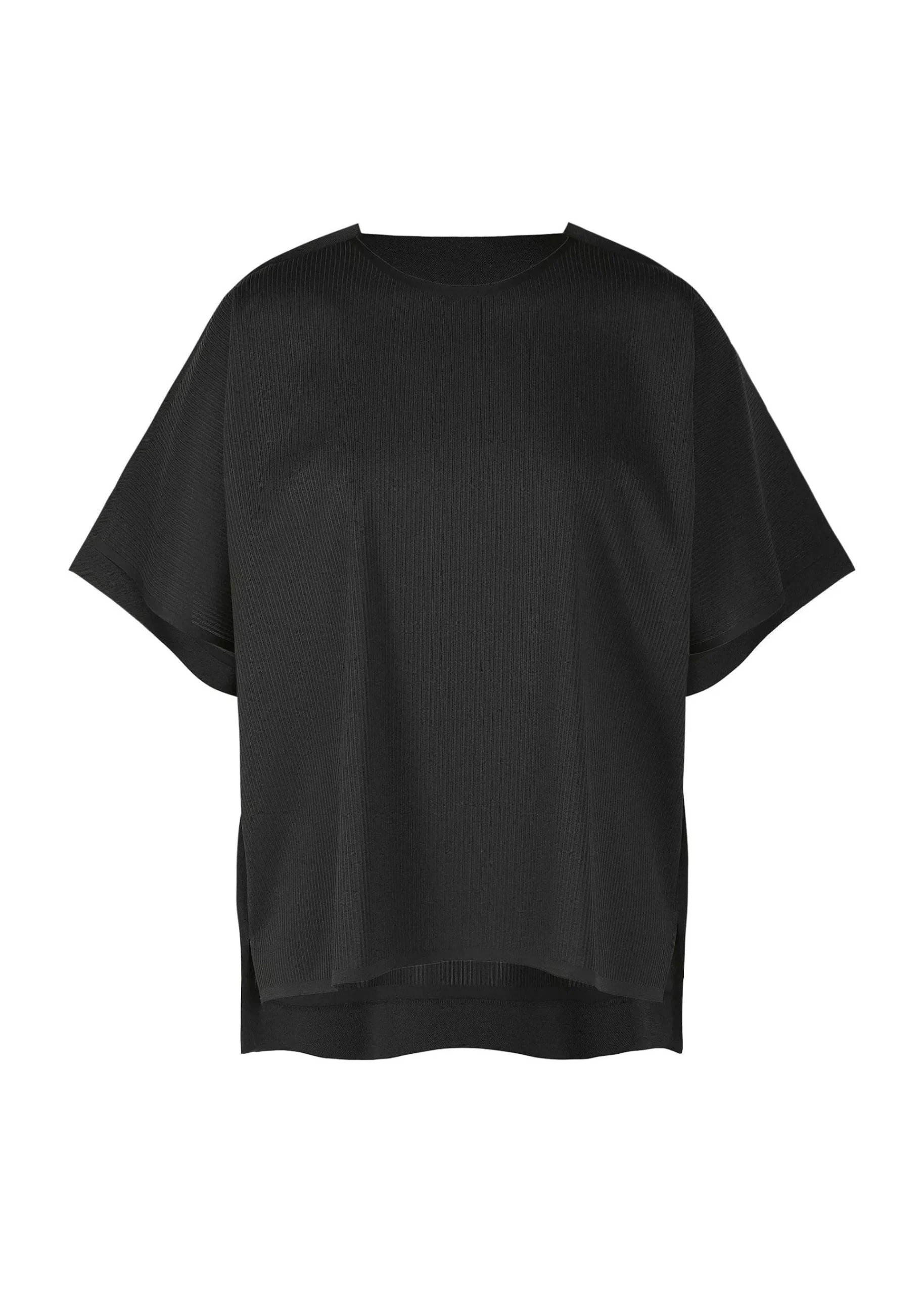 A Round Neck Short-Sleeved Shirt With Pleated Eyes Made Of A-Poc Fabric. The Edges At The Seams Of The Fabric Accent The Shoulders And Slits. There Are Slits On Both Sides.