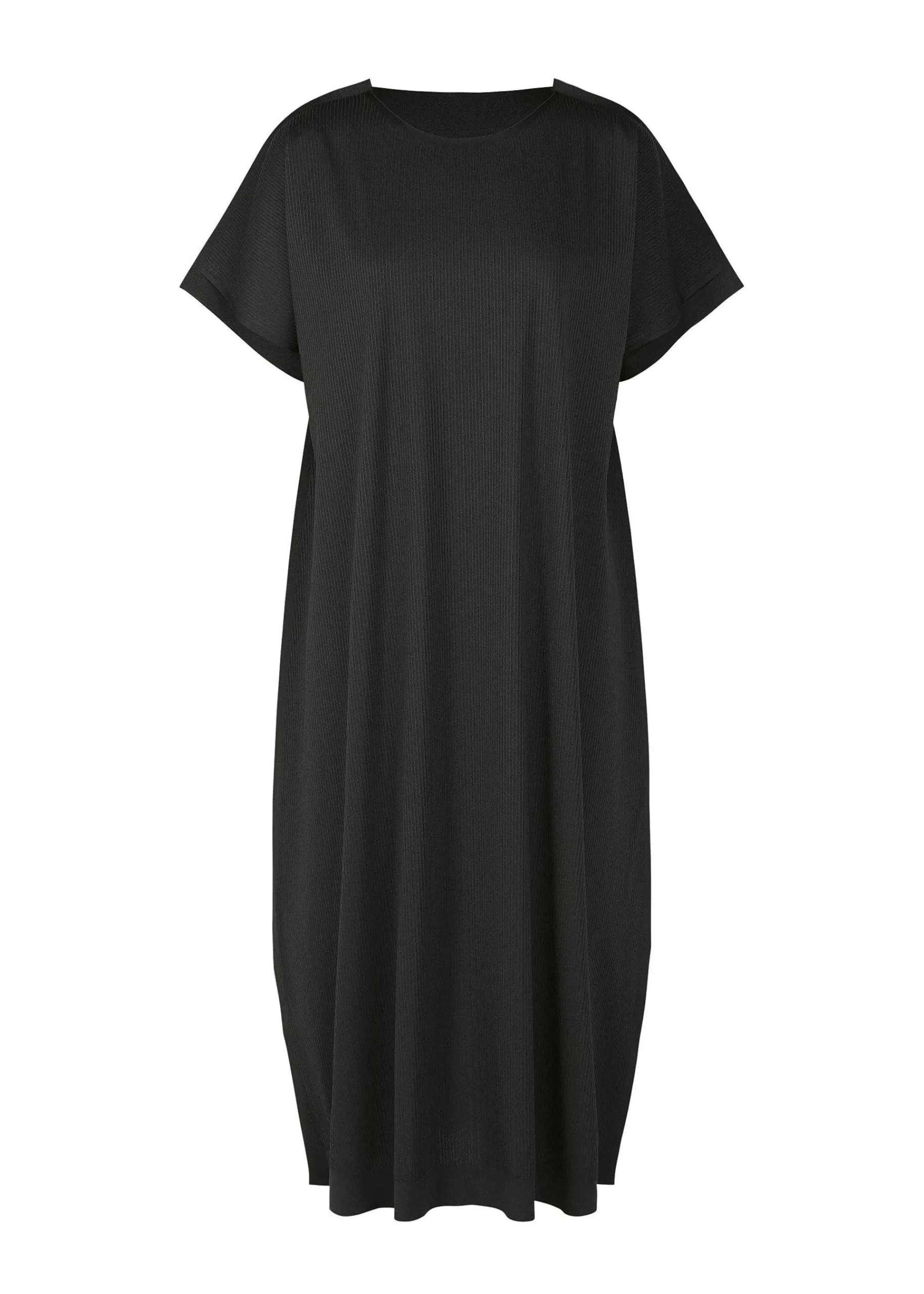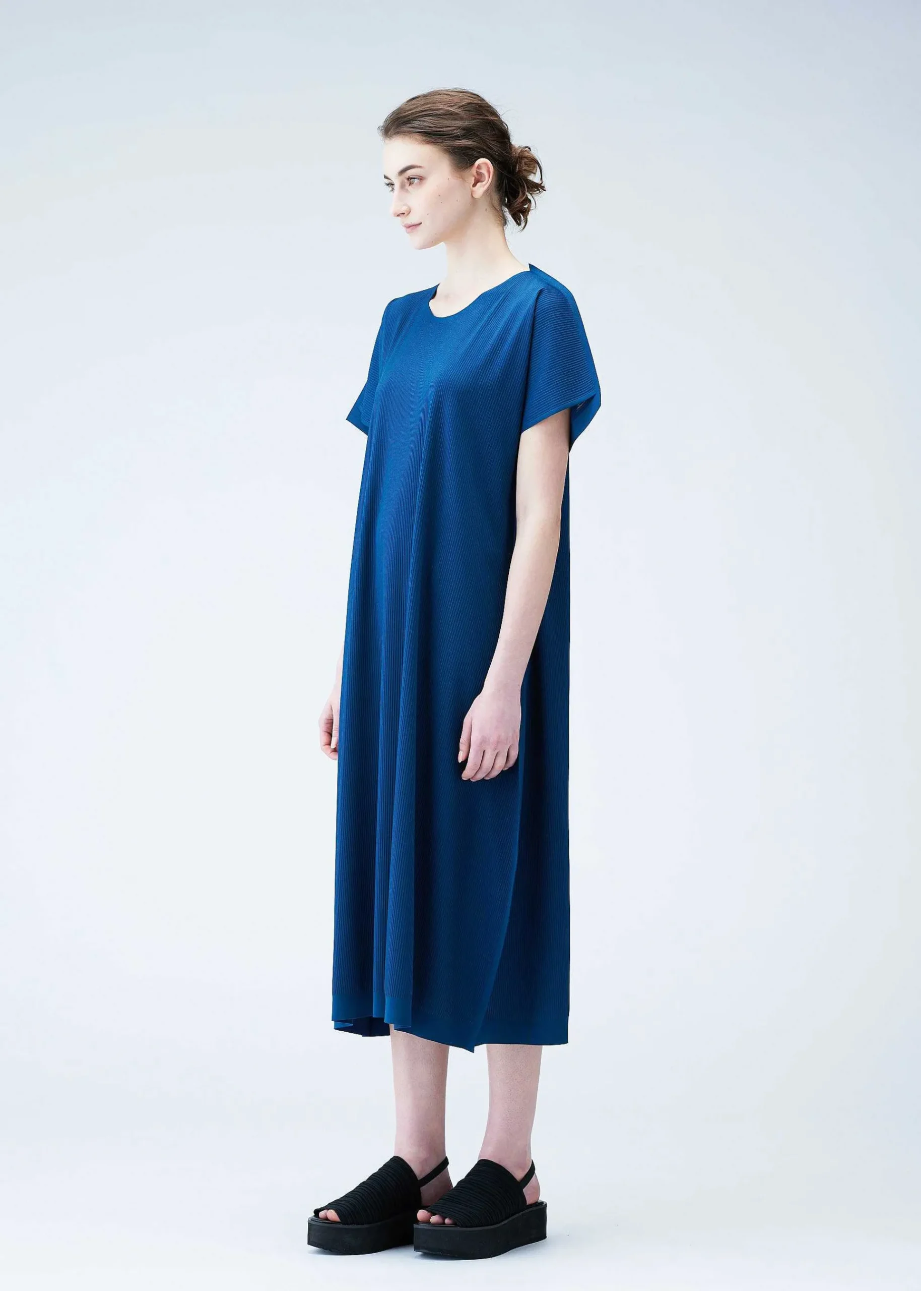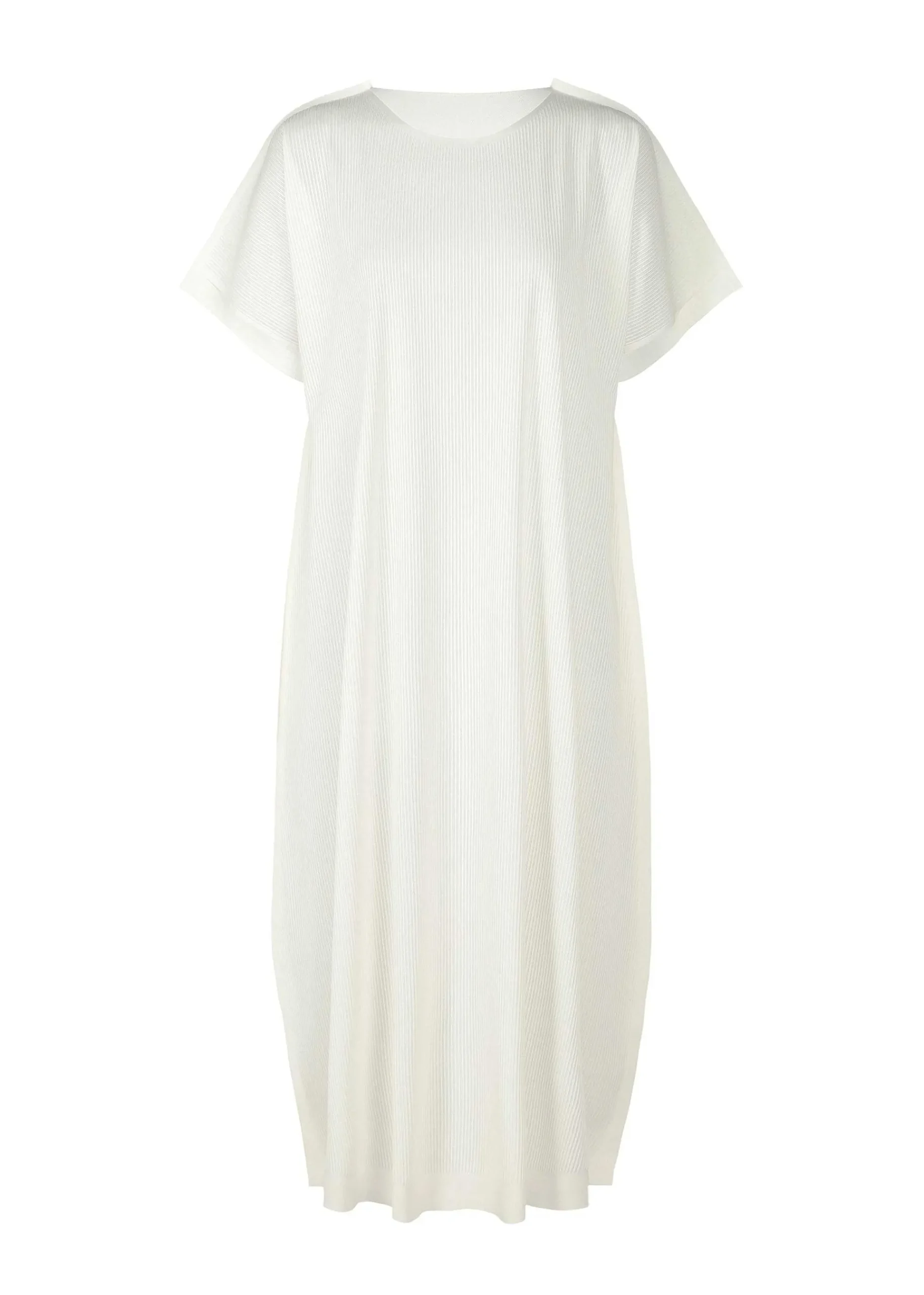 Pleated Crew Neck Short Sleeve Dress Made With A-Poc Fabric. The Edges Of The Fabric Seams Add An Accent To The Shoulders And Slits.