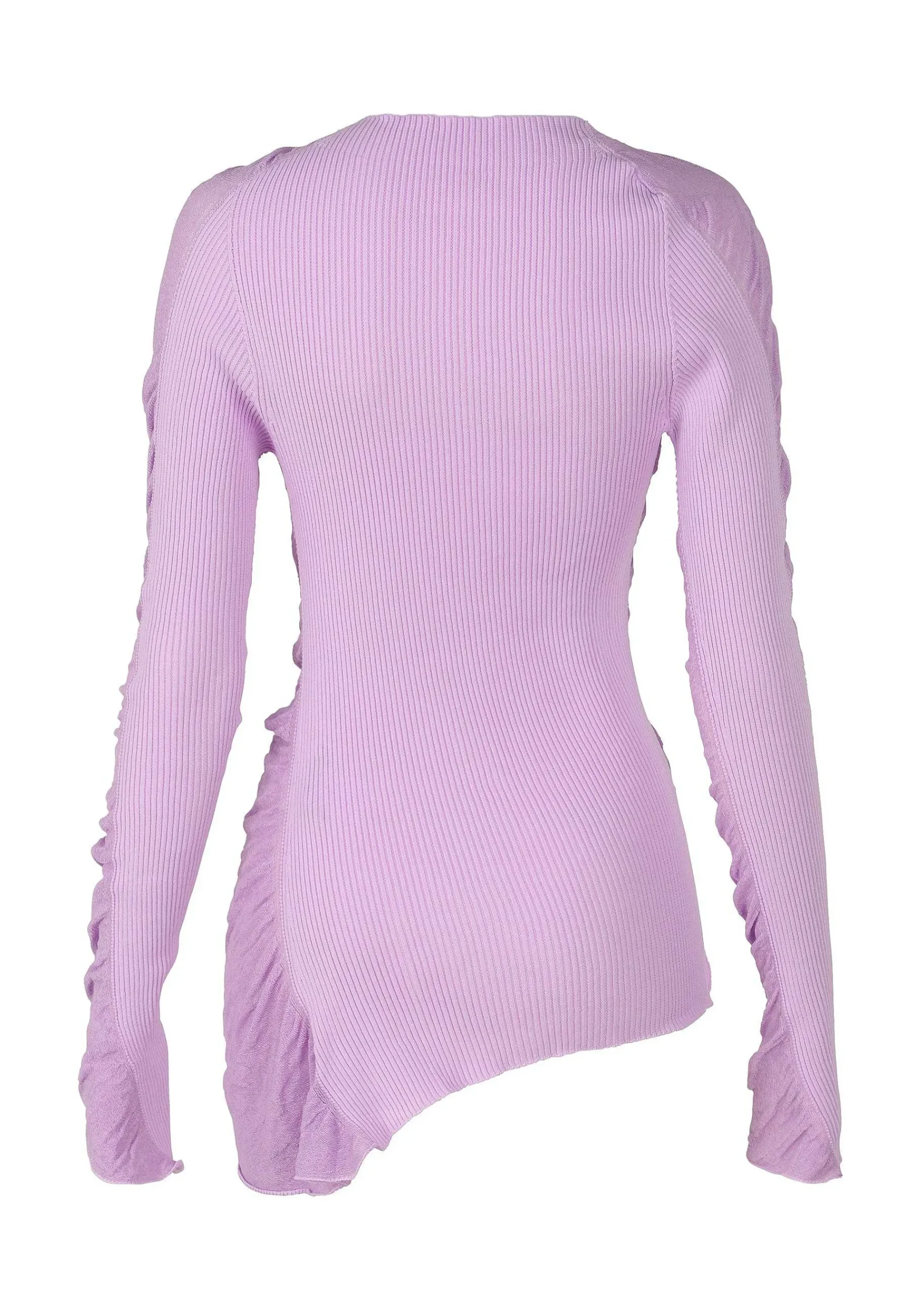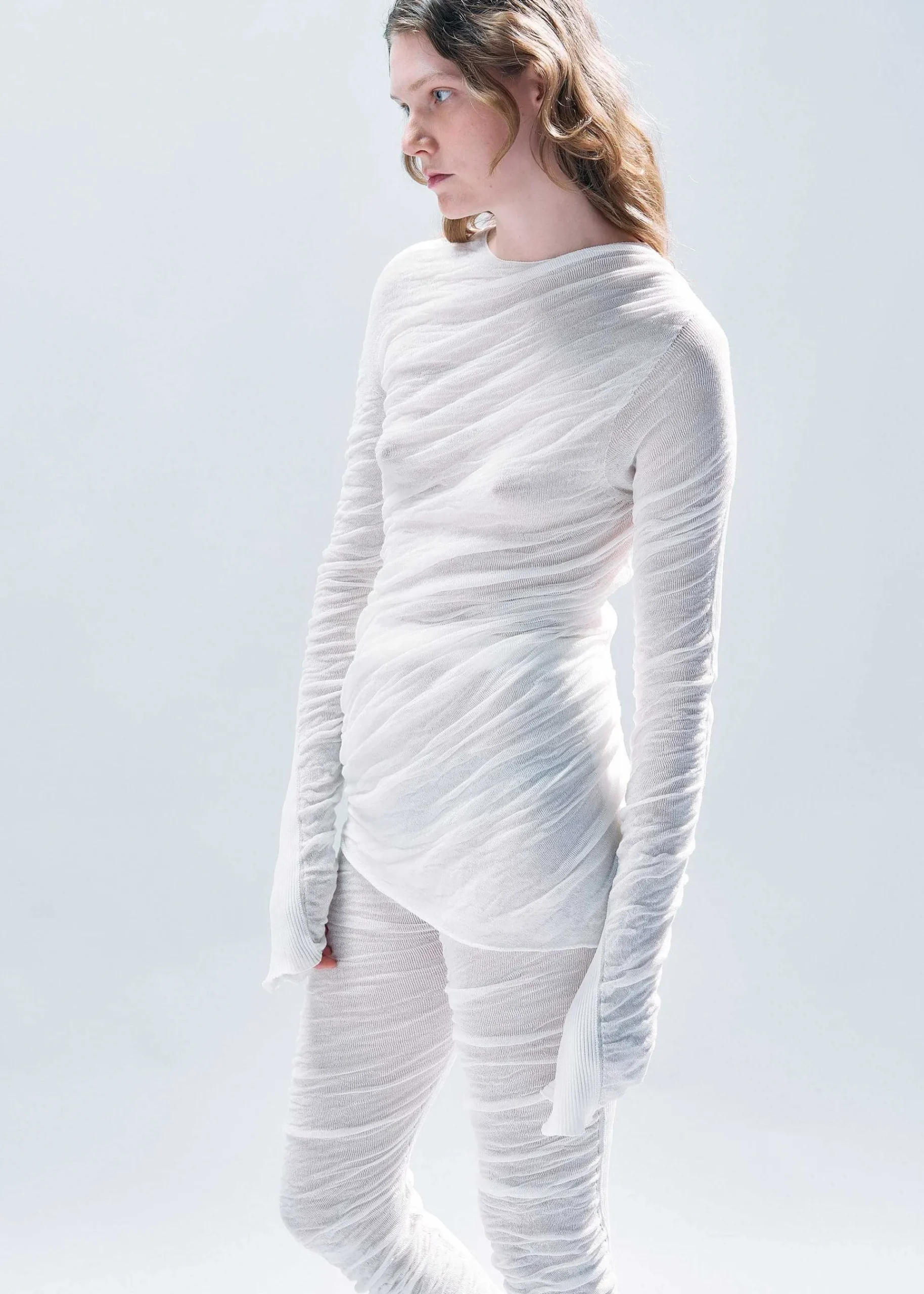 Long-Sleeved Knit Top With A Natural Twist Created By Twisting The Yarn, Evoking The Image Of A Delicate And Ambiguous Texture That Clings To The Body. The Front Of The Top Is Made Of A Sheer, Tightly Twisted Cotton Material With Only An S-Twist, Which Creates A Natural Twist In One Direction. In Contrast To The Delicate Impression Of The Front, The Back Is Made Of A Stretchy Polyester Ribbed Knit. By Changing The Material And Knitting Structure Between The Front And Back, The Twist Of A Single Tube Is Stopped At Both Sides. It Can Be Worn Alone, But Layered Coordination Is Also Recommended.