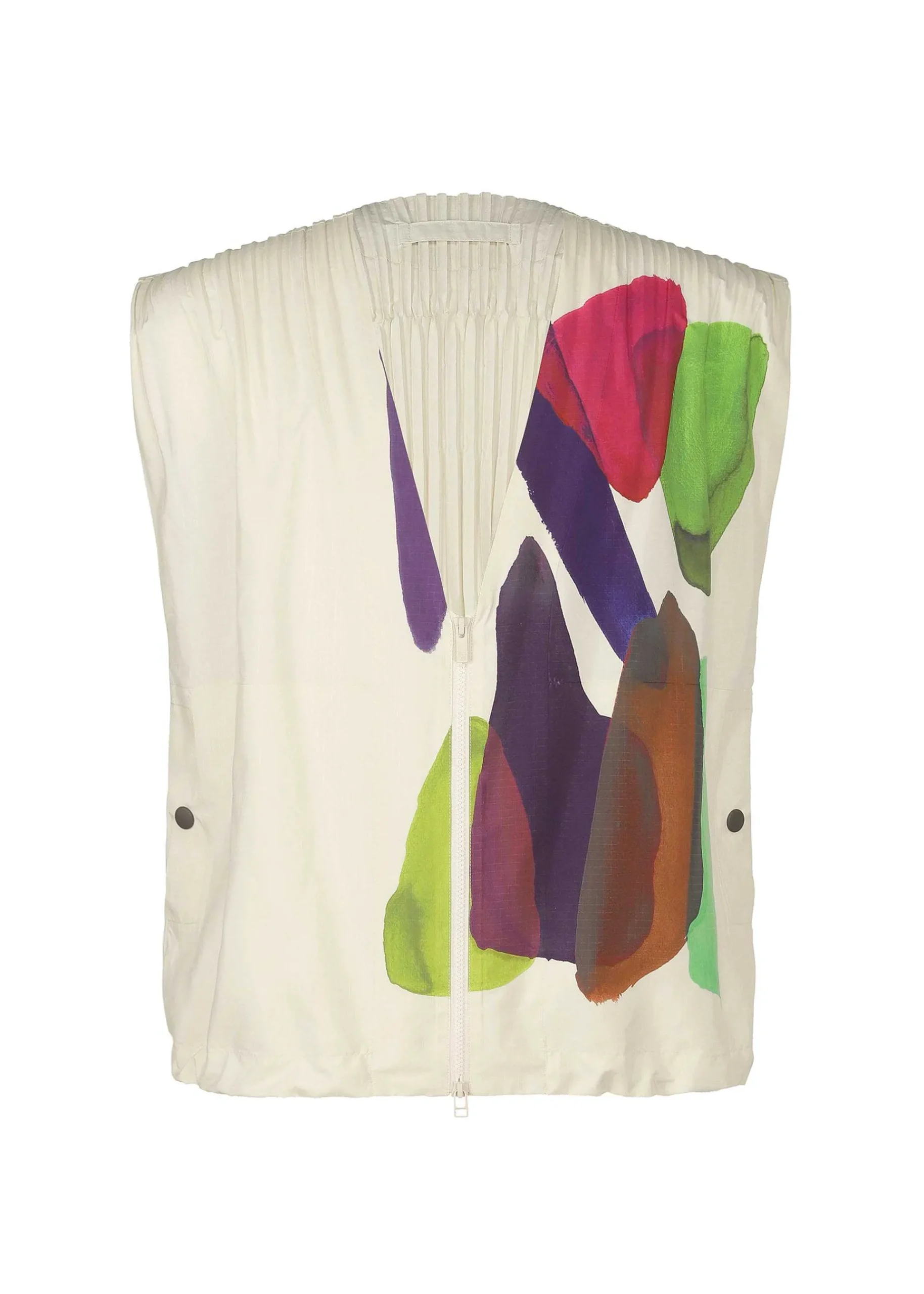 This Partially Pleated Zip-Up Vest Features A Print That Depicts Natural Scenes Such As Mountains, Wind, And Earth.