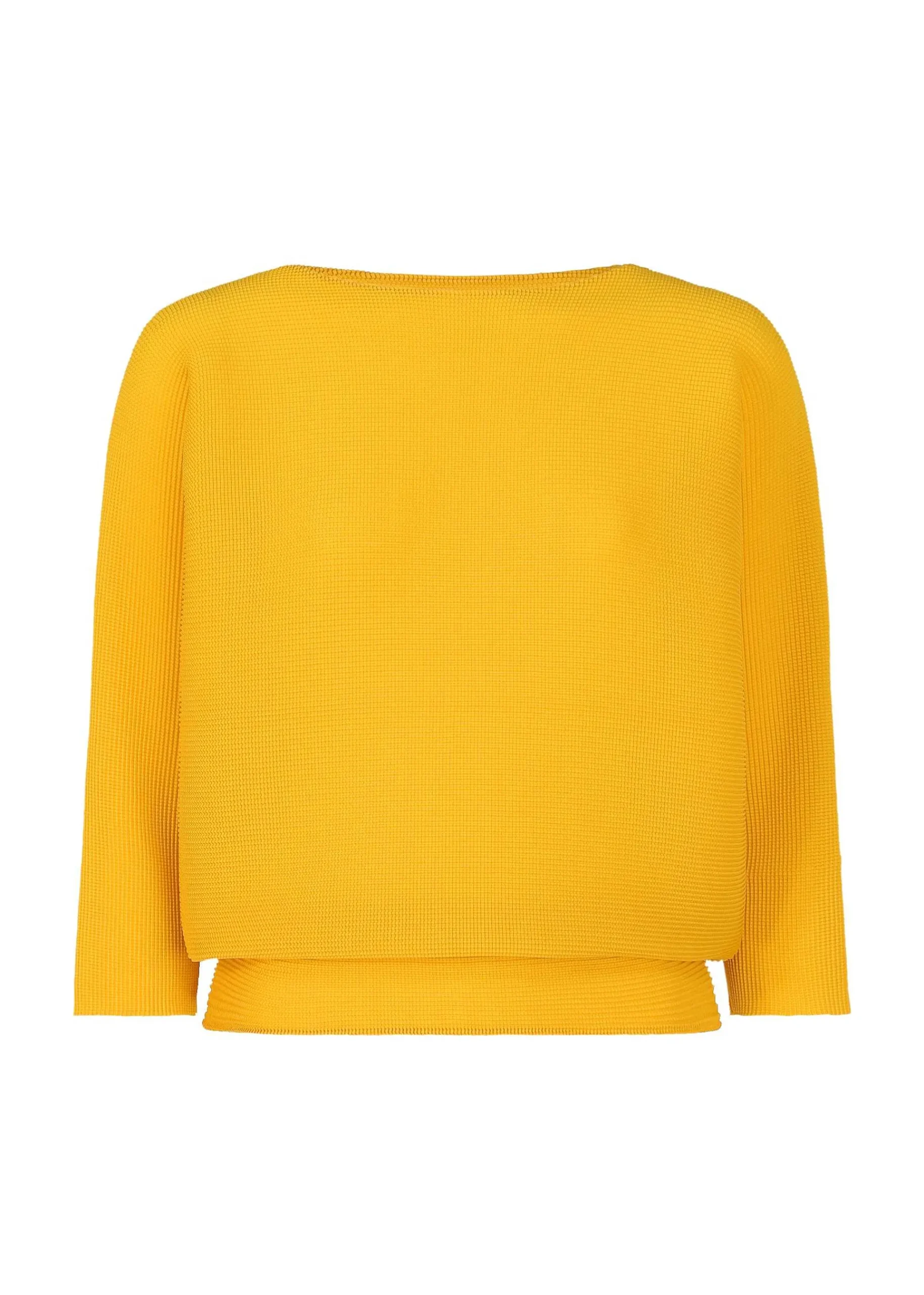A Round Neck 3/4 Sleeve Top With Elastic Stretch Pleats, Pleated Both Vertically And Horizontally. It Has A Relaxed Silhouette With Dolman Sleeves.