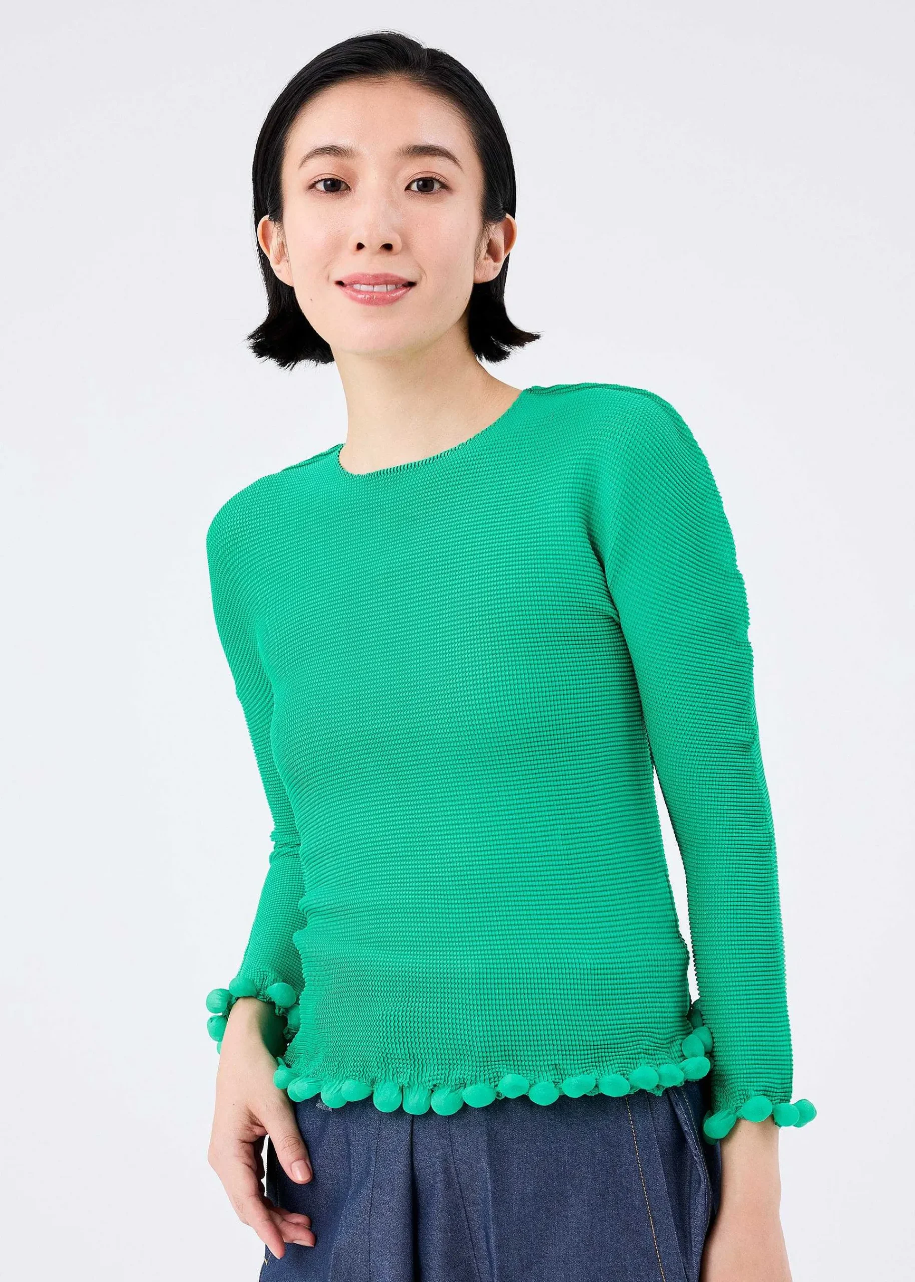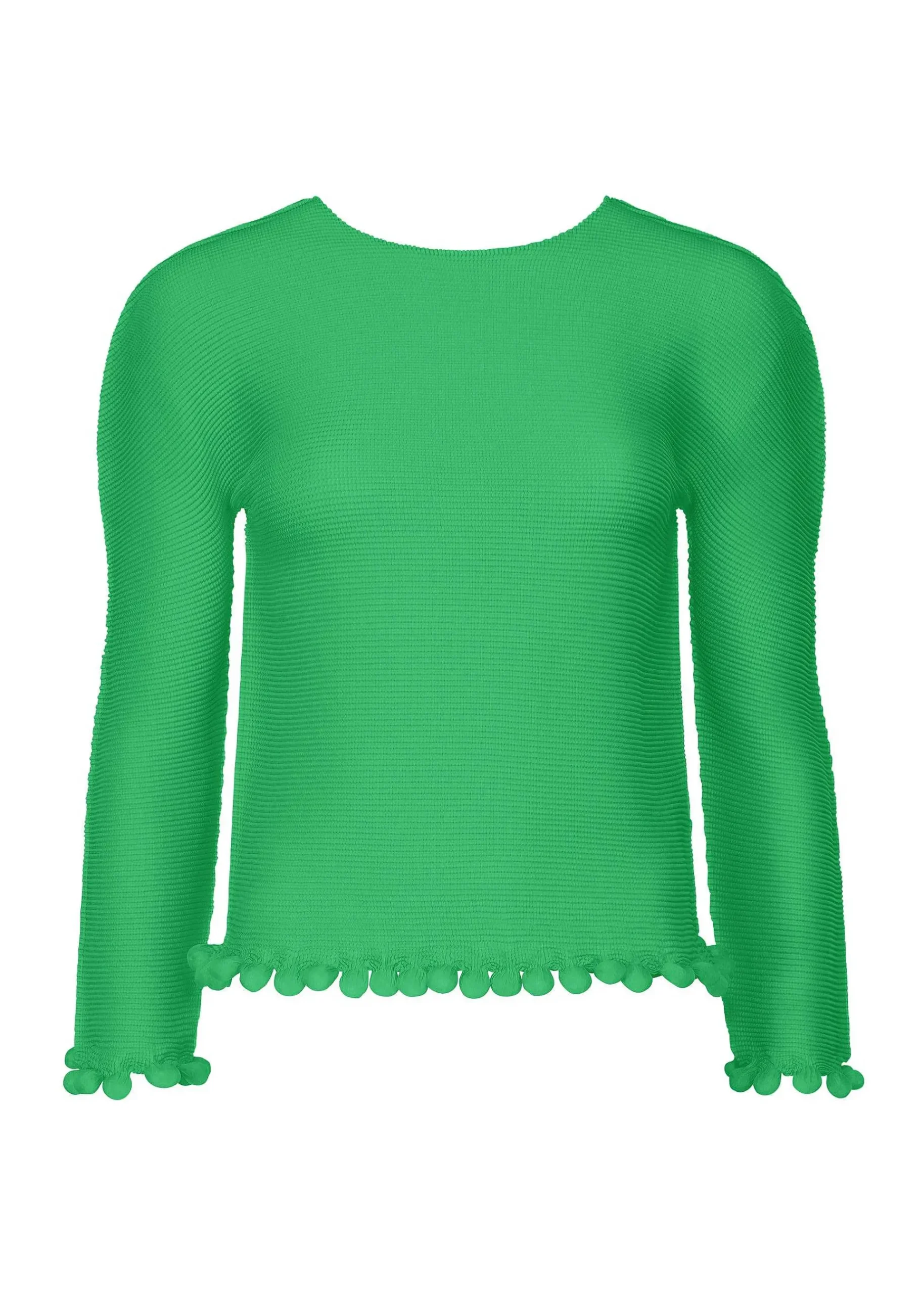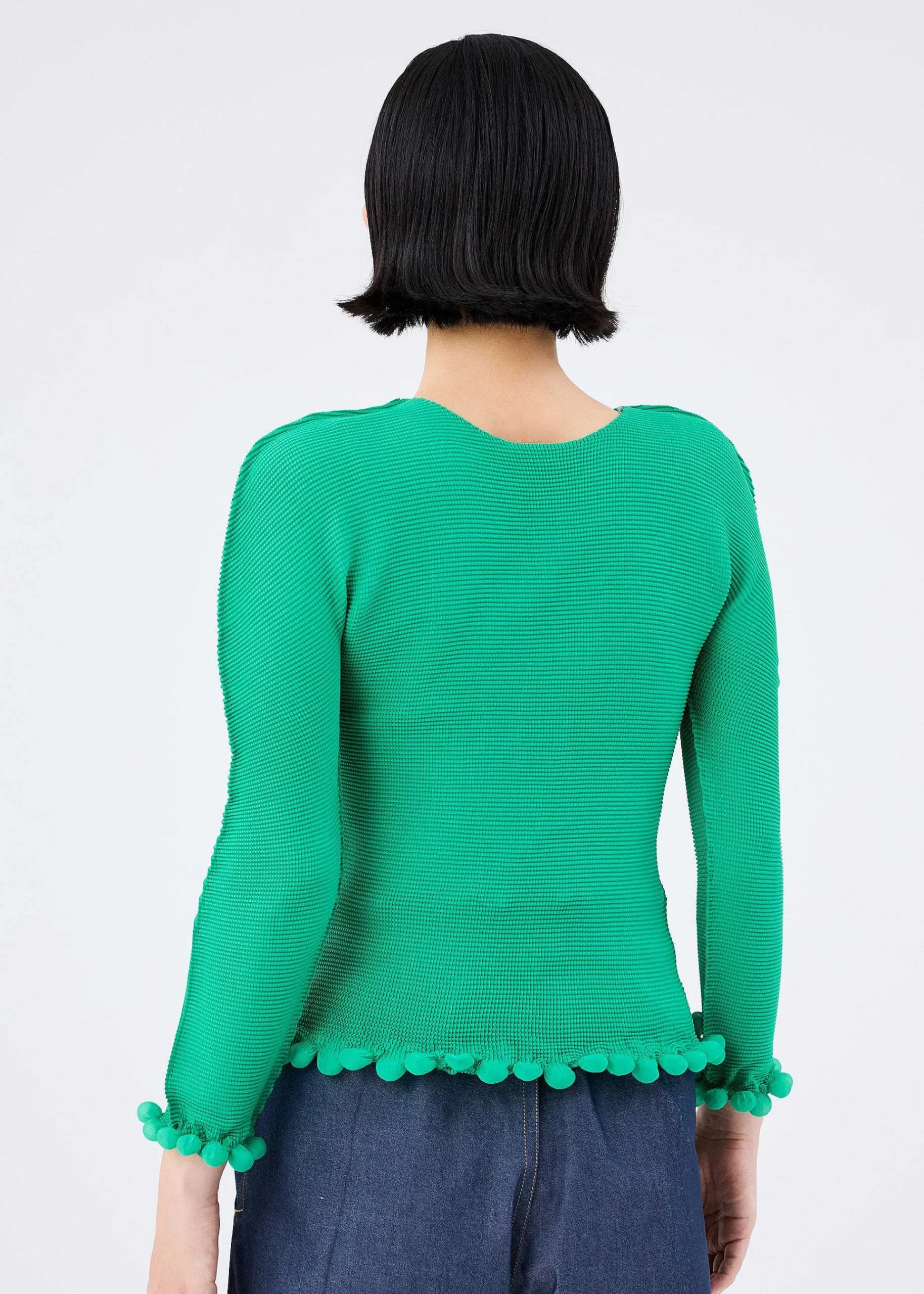 This Colorful Stretch Pleated Crew Neck Long Sleeve Top Is Made With Pleats Vertically And Horizontally, Then Each Piece Is Hand Tied With Beading And Placed In A High Temperature Kiln To Create A Three-Dimensional, Bumpy Texture.
