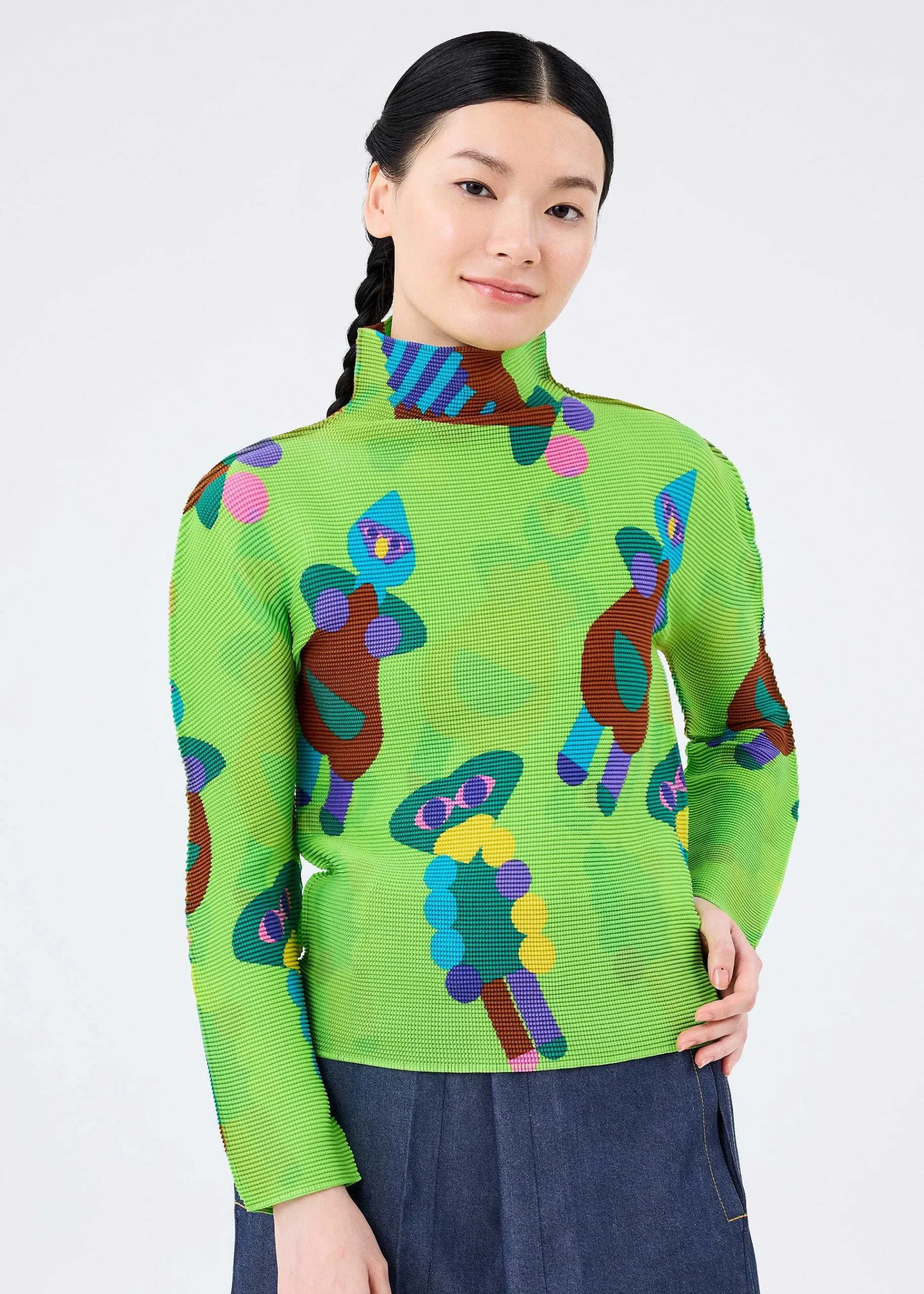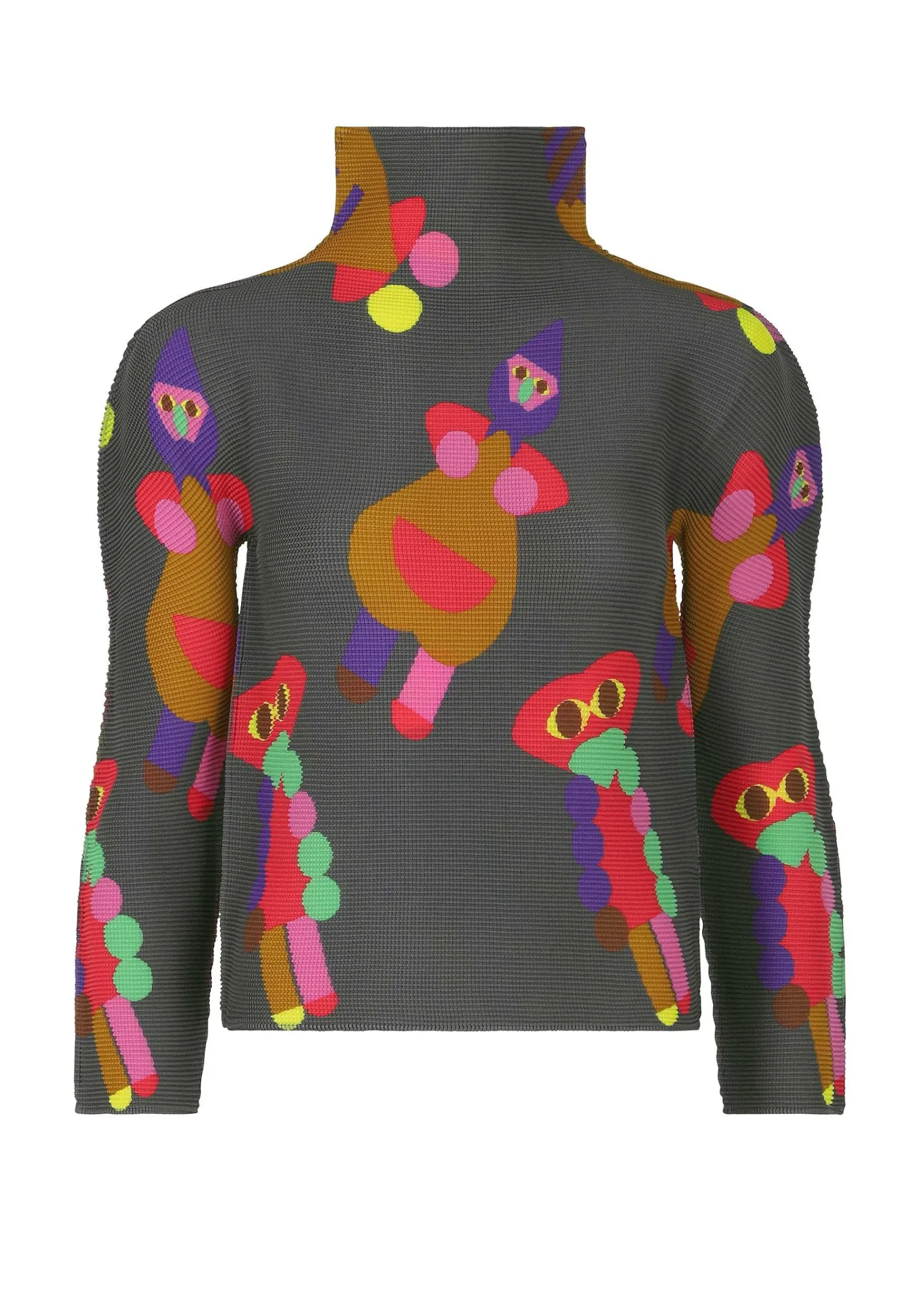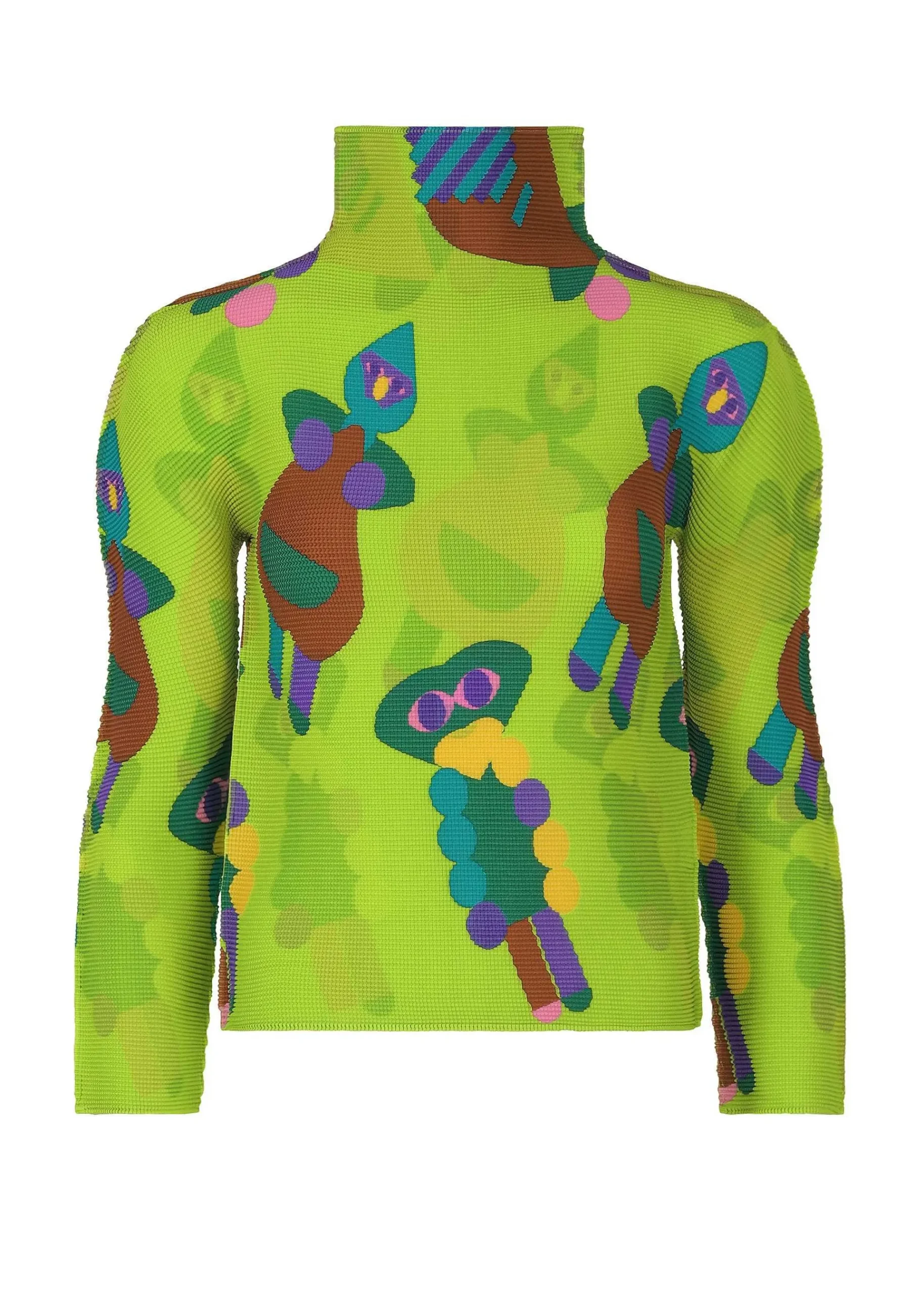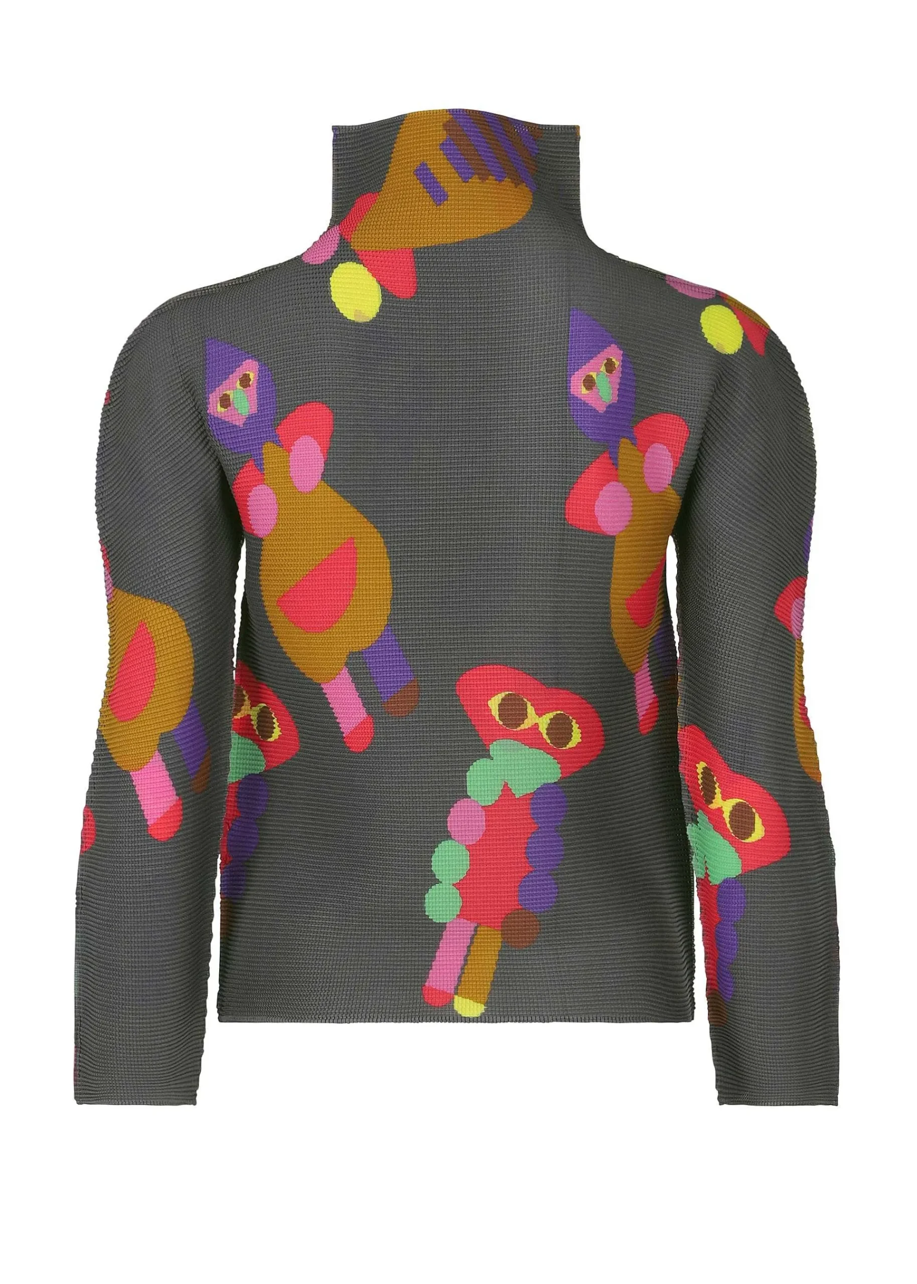 High-Neck Long-Sleeved Top With Stretch Pleats, Vertically And Horizontally. A Fun And Pop Colorful Pattern Inspired By Clay Clay. The Pattern Of This Product Is Different One By One. Please Note.