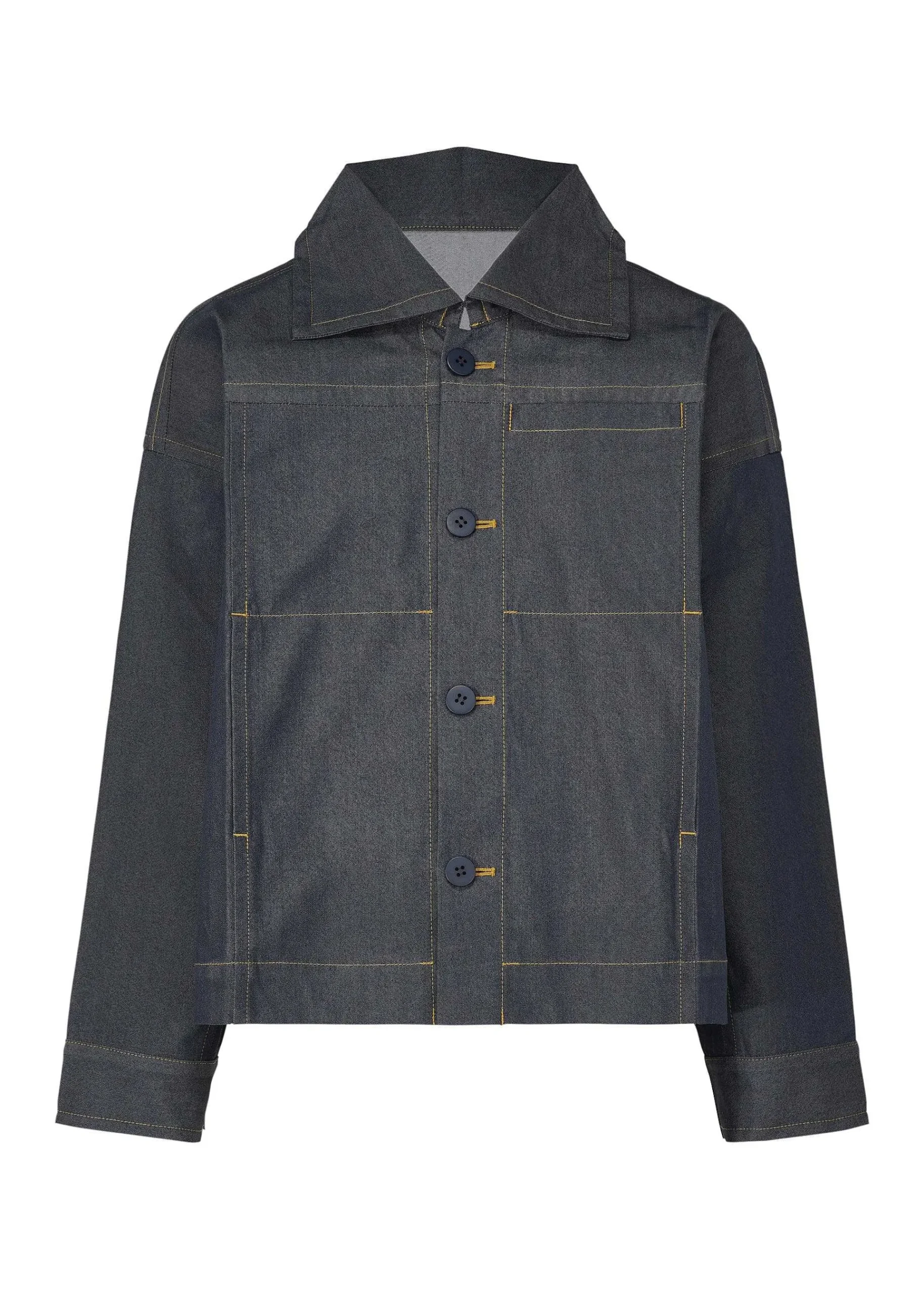 This Jacket Is Made Of Recycled Polyester Denim Fabric And Can Be Folded Along The Creases For Easy Carrying. In Order To Reproduce The Subtle Shades Of Denim, Recycled Polyester Dyed Yarns Made By Mixing Colors At The Cotton Stage Are Used For The Warp Threads, And The Jacket Is Washed To Give It A Realistic Denim Texture. There Are Pockets On Both Sides And On The Left Chest.