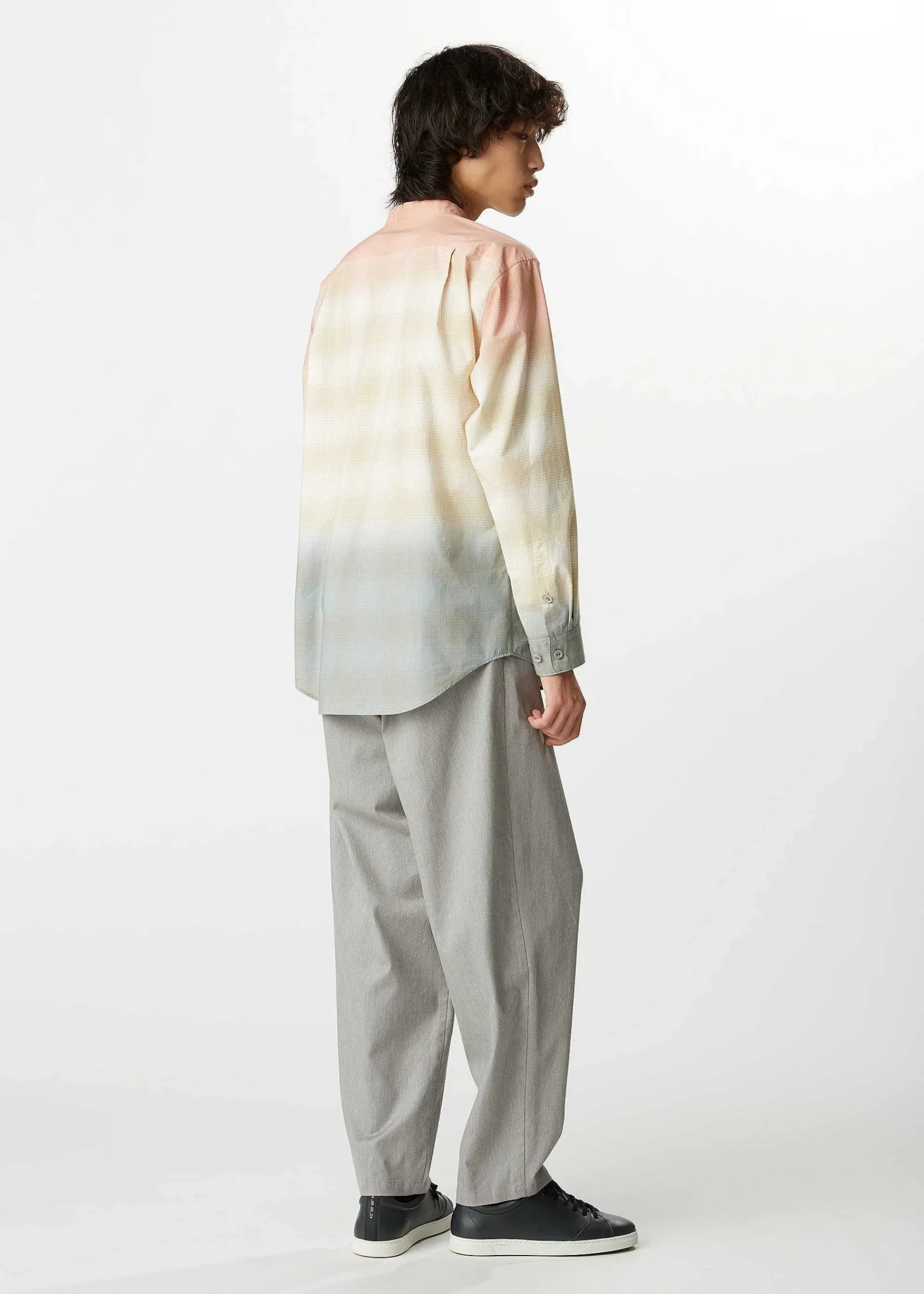 This Stand-Up Collar Long-Sleeve Shirt Is Made Of 100% Organic Cotton Checkered Broadcloth With A Three-Color Gradation Print That Resembles A Horizon, Creating A Gorgeous Impression. The Vibrant Gradation Colors Are Printed Using A Special Technique By Skilled Craftsmen At A Historic Dyeing Factory In Kyoto. This Item Is Available In A Size That Can Also Be Worn By Men. Due To The Nature Of The Dyeing Process, The Color Will Vary From Item To Item. Please Note This In Advance.