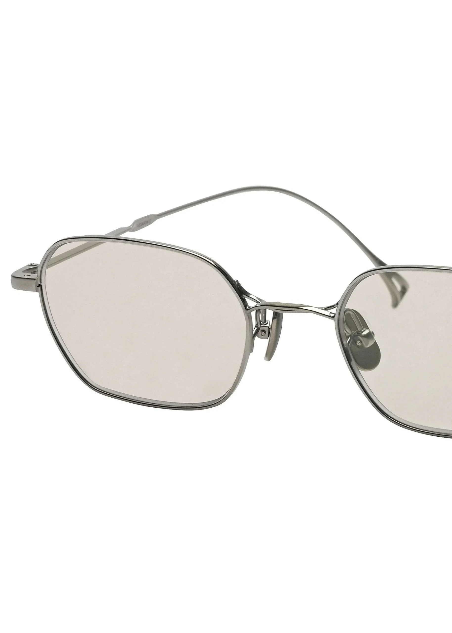 Hexagon-Shaped Sunglasses Featuring A Bridge Where Two Lines Intersect. By Making The Metal Parts Such As The Rim, Bridge, And Temples Thinner, And Having Two Lines Intersect At The Bridge, We Have Achieved A Delicate Yet Lightweight And Highly Rigid Structure. The Frame Pursues A Geometric, Distinctive Form And A Familiar Shape. [Color Details] Front: Silver Metal: Silver Lens: Light Gray [Visible Light Transmittance] 60%≫≫”Bone Series Ⅸ”