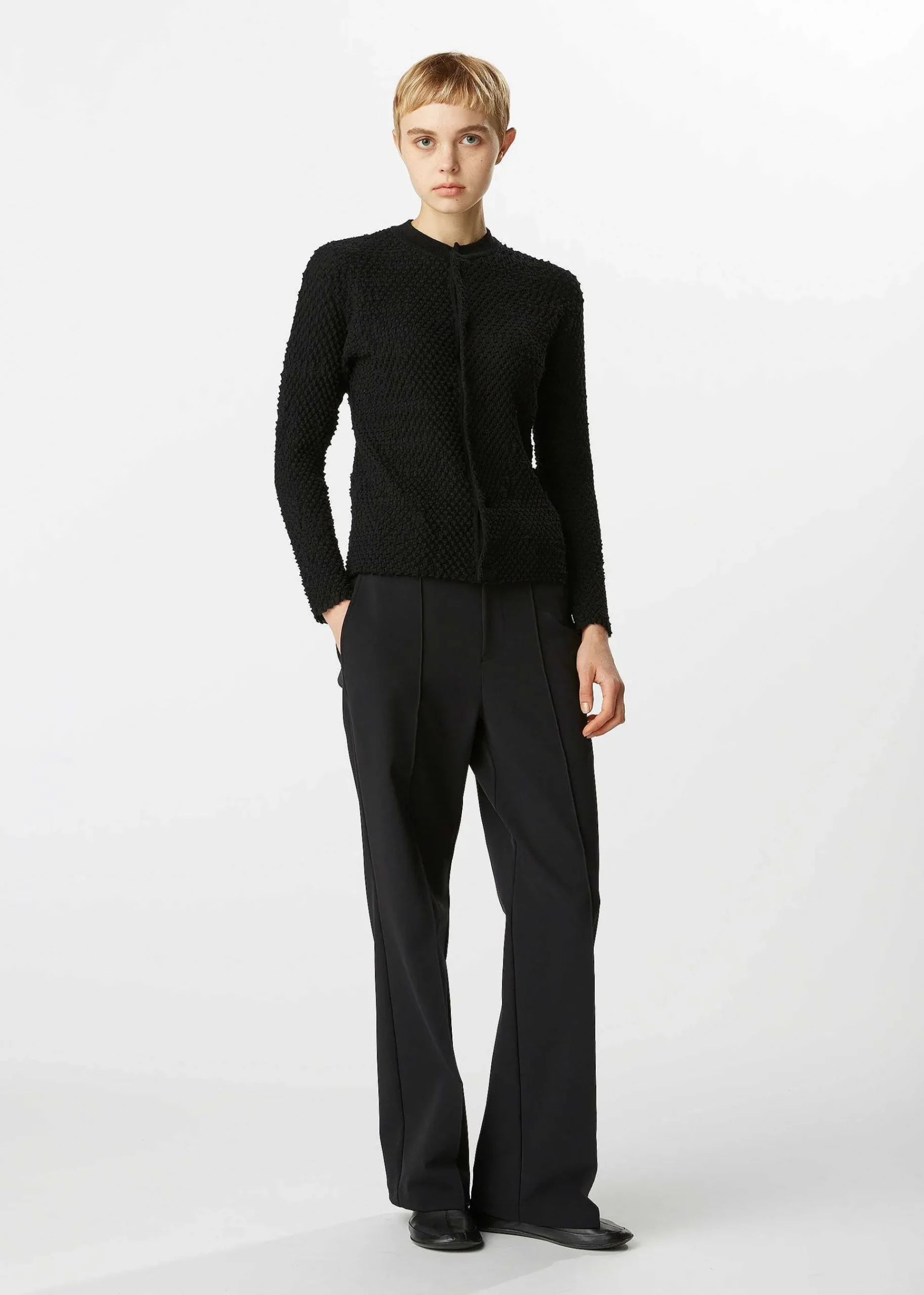 A Round, Long-Sleeve Cardigan Knitted In Niigata Prefecture That Uses The Front And Back Stitches Of The S-Twist And Z-Twist Yarn To Create An Uneven Pattern. It Is Characterized By Its Smooth Texture Due To The Strong Twist Of Wool Yarn.