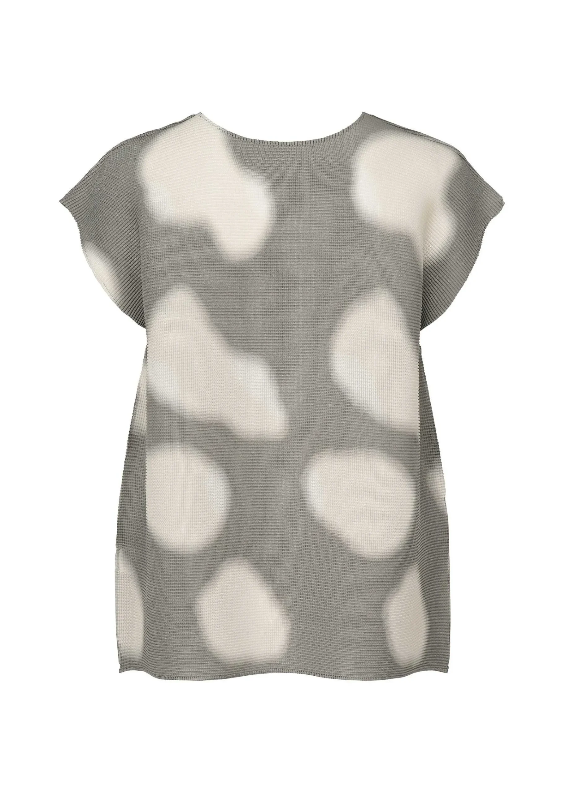 Stretch Pleated Round Neck French Sleeve Top With Vertical And Horizontal Pleats. The Pattern Is A Refreshing Color Of Clouds Drifting In The Sky, Changing Shape. Please Note That The Pattern Of This Product May Vary From Piece To Piece.