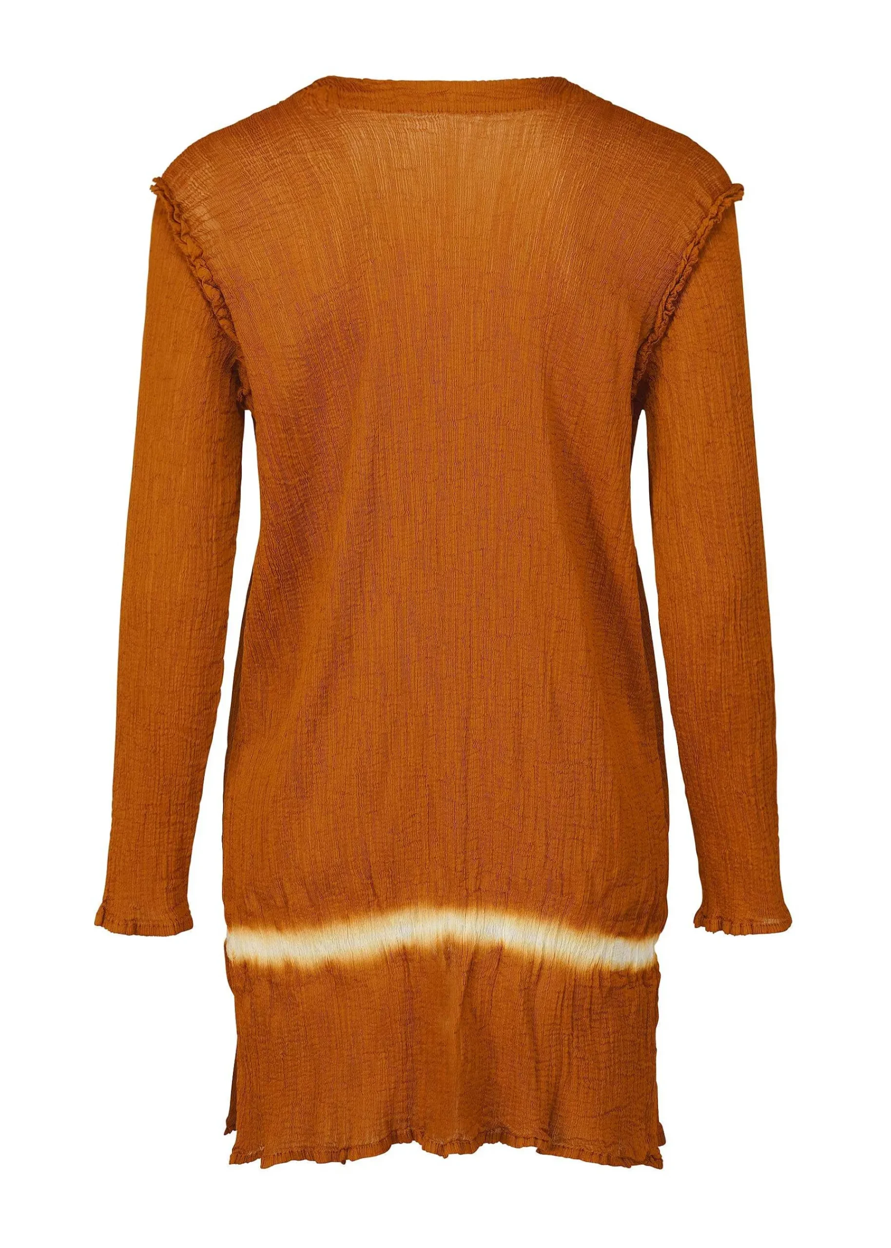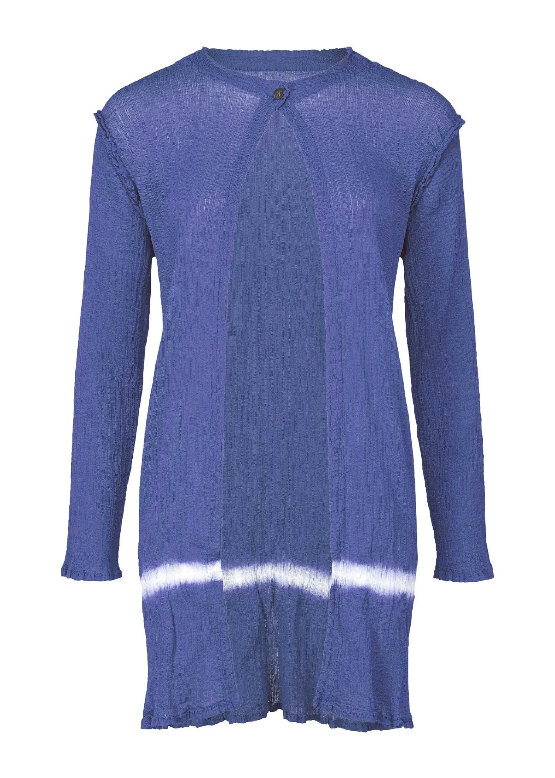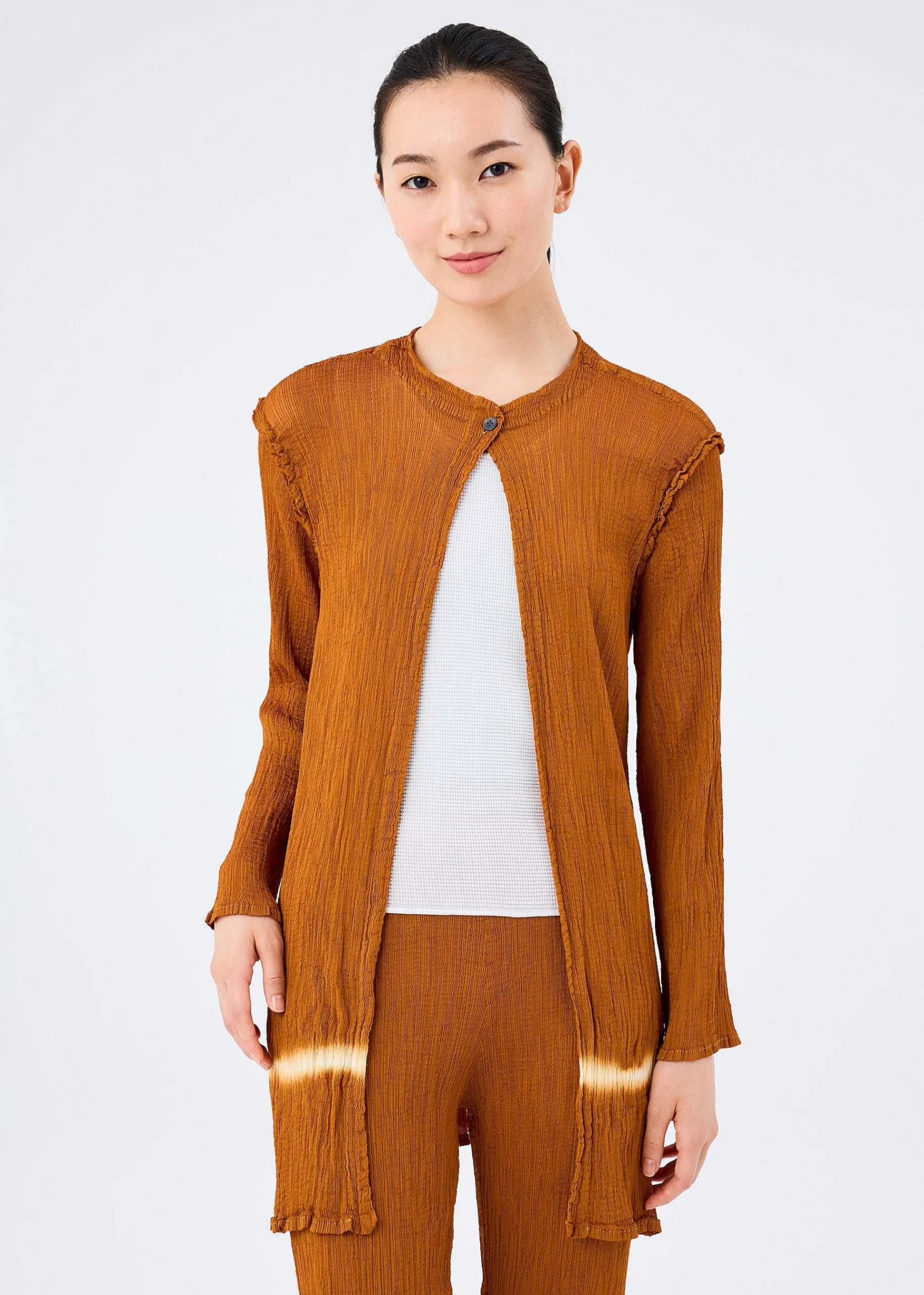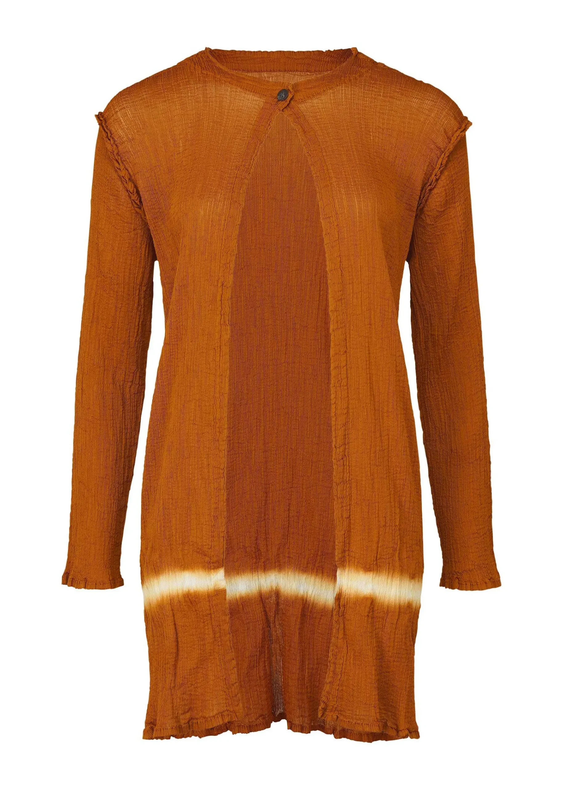 A Long Cardigan Made Of See-Through Crepe That Is Product-Dyed And Made Of Fabric With Strong Twist Yarn Woven Into The Weft. During The Dyeing Process, The Weft Threads Are Untwisted, Creating A Vertical Grain, Creating The Unique Look Of Yoryu. The Key Point Is The Line-Shaped Design By Tying Down Part Of The Hem To Create A Part That Will Not Be Dyed. The Pattern Of This Product Is Different One By One. Please Note.