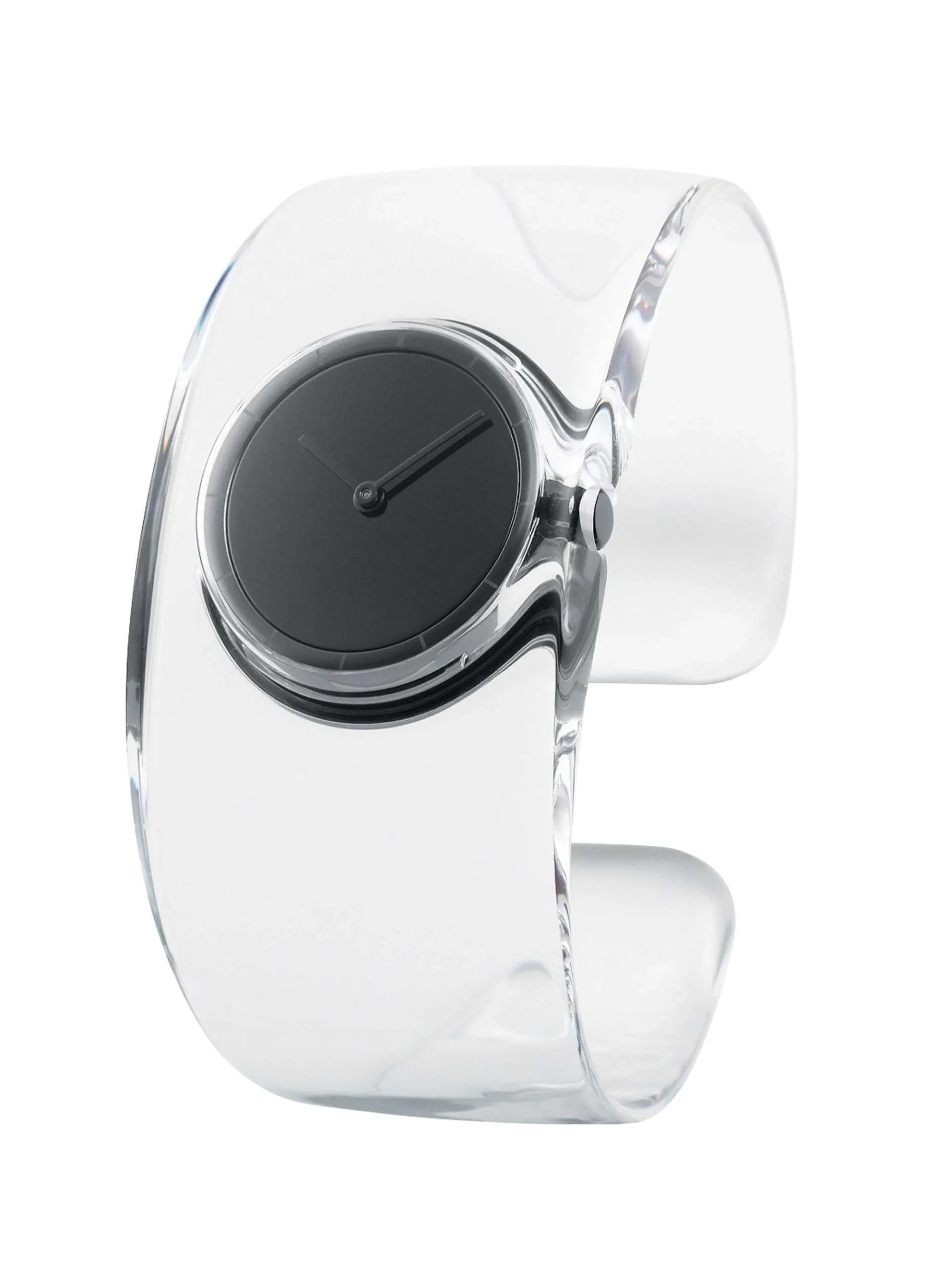 The Shape Of Water. A Transparent Ticking Clock “O” (French Word For Water = Eau). Based On The Concept Of “The Shape Of Water. A Clock That Ticks Transparent Time,” Tokujin Yoshioka Uses A Transparent Material That He Specializes In To Create An “O” That Has No “Shape” Like Water But Has A Momentary Brilliance Like Light. Series. It Is A Lightweight Bangle Type Model That Weighs Only 25G And Can Be Used Like An Accessory. [Color Details] Band: Clear Case: Black Dial: Black