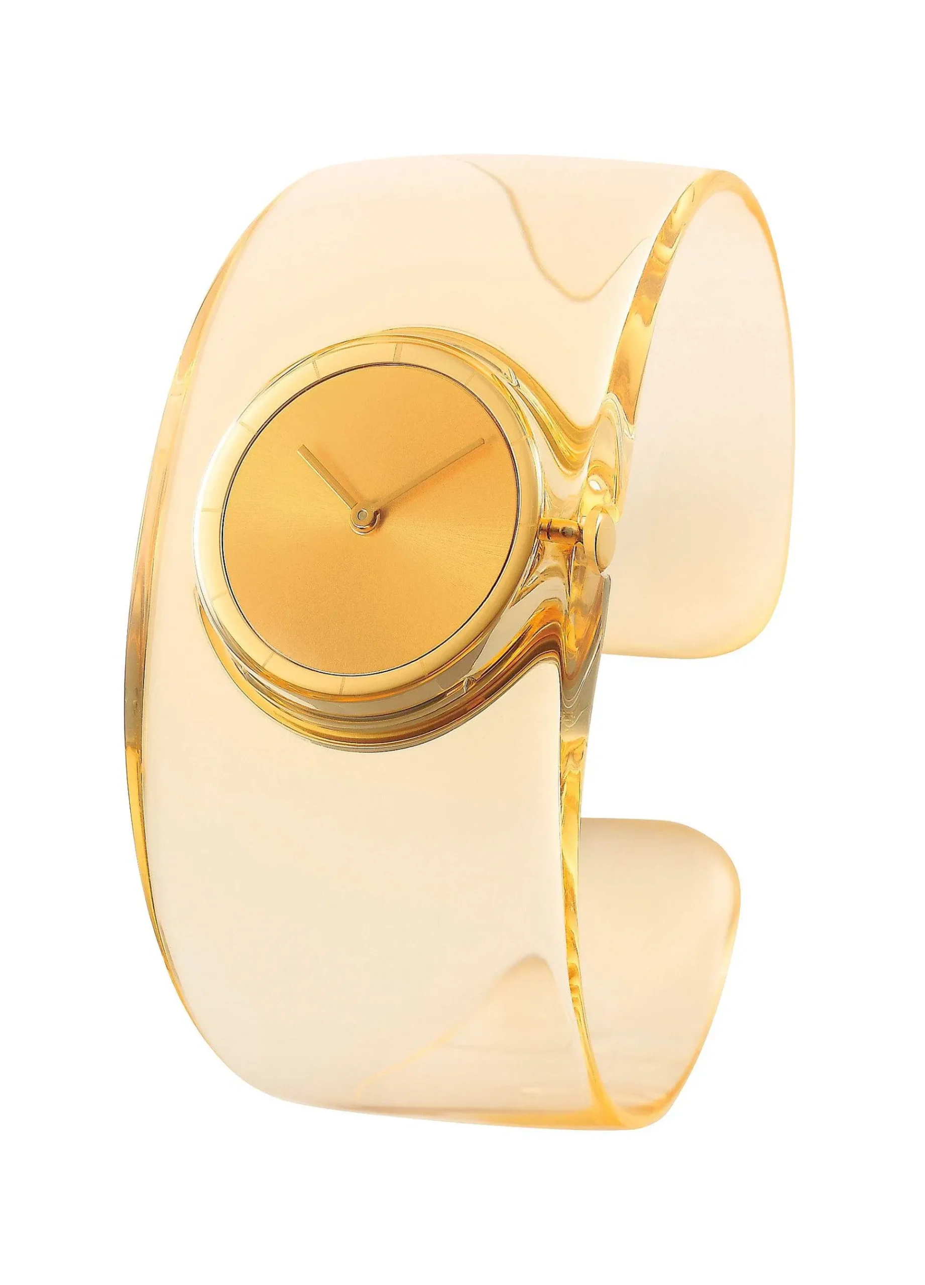 The Shape Of Water. A Transparent Ticking Clock “O” (French Word For Water = Eau). Based On The Concept Of “The Shape Of Water. A Clock That Ticks Transparent Time,” Tokujin Yoshioka Uses A Transparent Material That He Specializes In To Create An “O” That Has No “Shape” Like Water But Has A Momentary Brilliance Like Light. Series. It Is A Lightweight Bangle Type Model That Weighs Only 25G And Can Be Used Like An Accessory. The O Series Was Developed To Commemorate The Project’S 10Th Anniversary. In The Year Of Our 20Th Anniversary, We Will Propose A New Interpretation Of Color Tones. [Color Details] Band: Lemon Case: Gold Dial: Gold