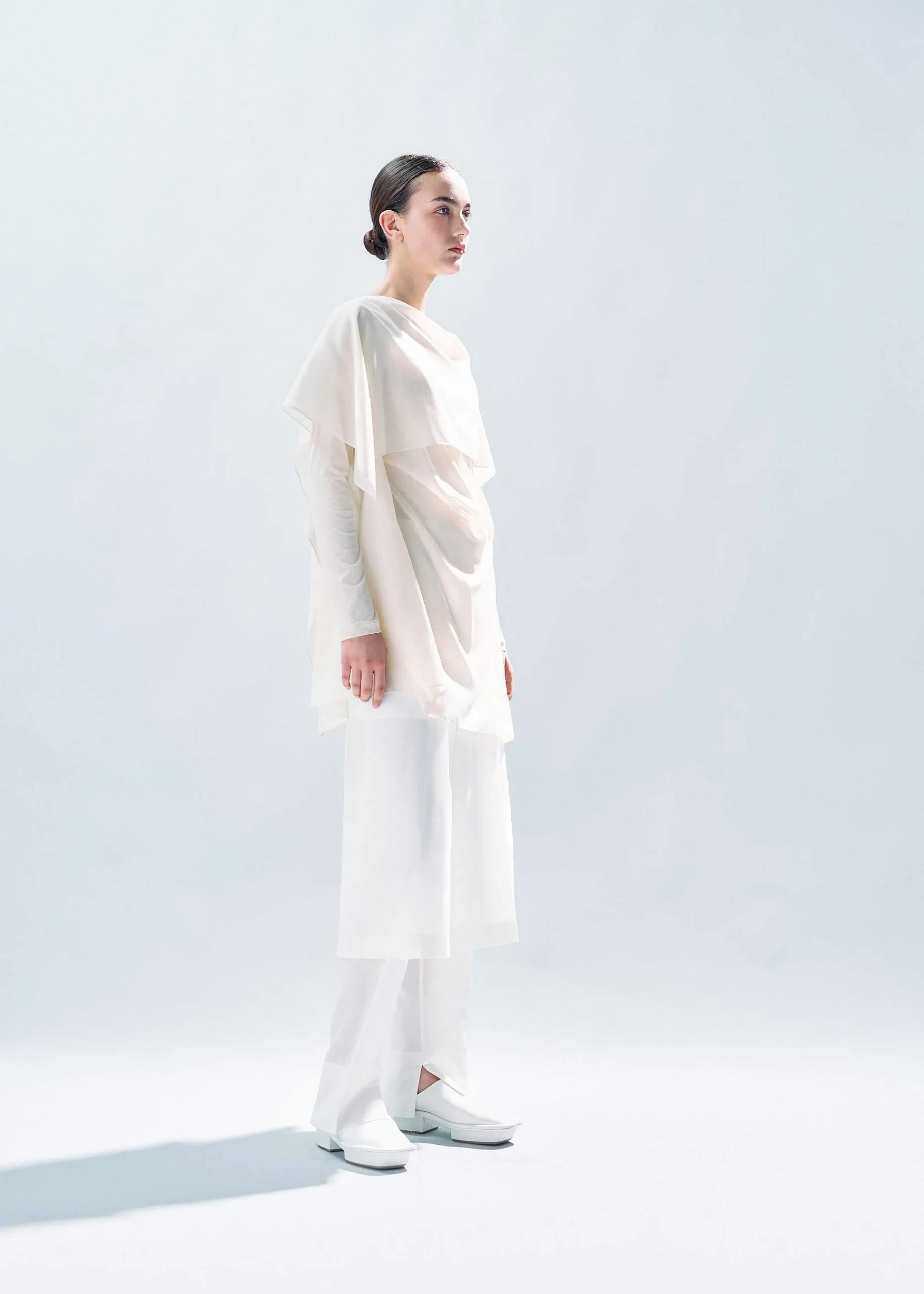 Long-Sleeved Top That Combines Different Materials To Create A Contrast Between The Body And A Single Piece Of Cloth. For The Base, We Use A Very Thin Jersey Material With Good Kickback That Resembles A Second Skin, And A Piece Of Sheer Material Is Docked To It. This Item Feels Like Wearing A Piece Of Cloth And Has An Elegant Sheer Feel. Although It Has A Delicate Appearance, It Is An Easy-To-Handle Item That Can Be Washed With Water.