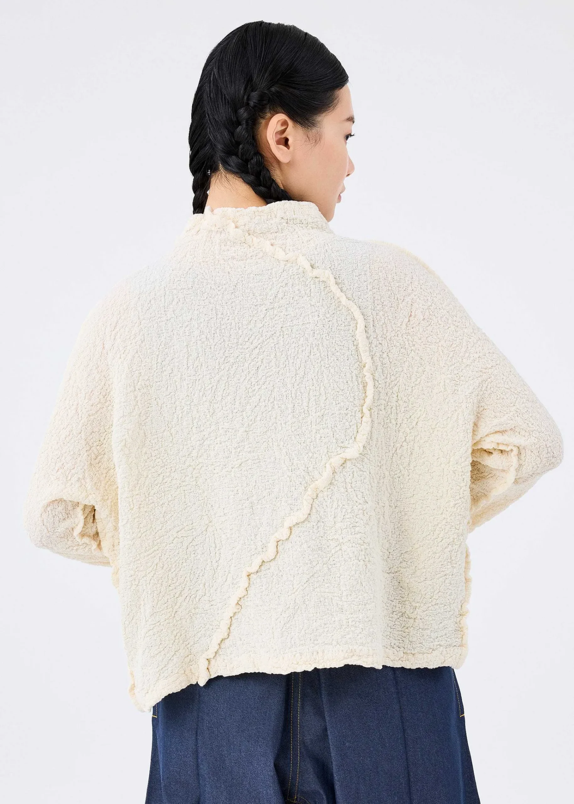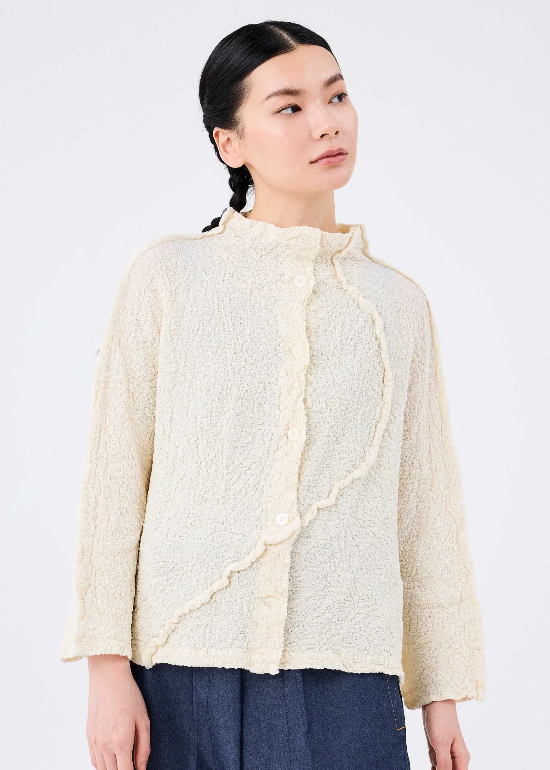 A Long-Sleeved Cauliflower Cardigan With The Unique Comfort Of Cotton And The Stretchy, Uneven Texture Of The Material. The Seams Are Exposed To Create A Soft Curve That Resembles The Stem Of A Plant.