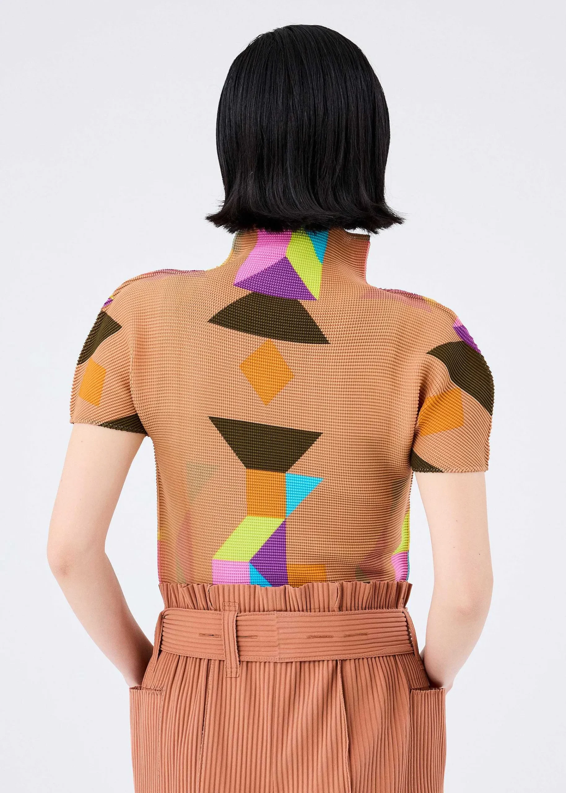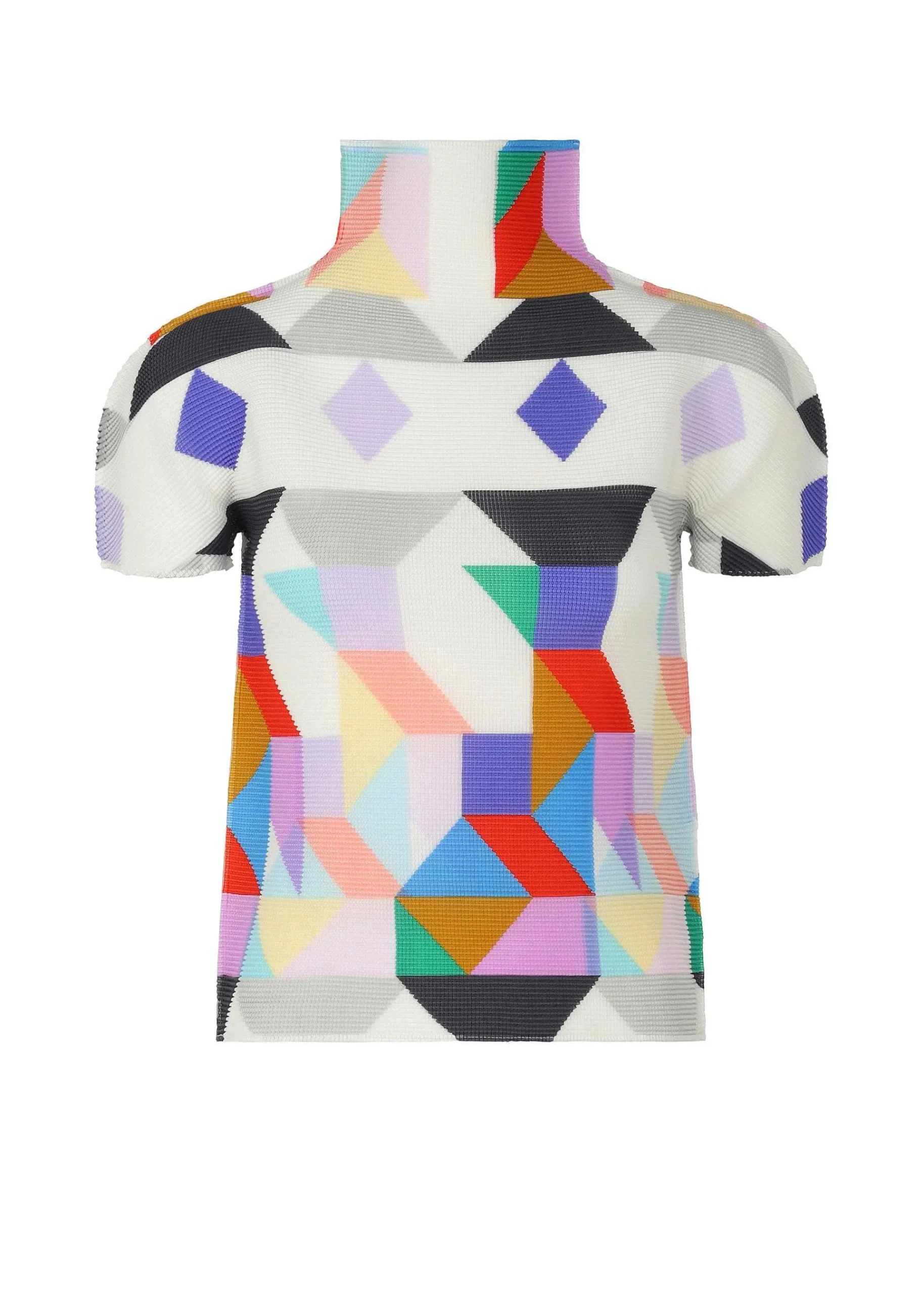 A High-Neck Short-Sleeved Top With Stretch Pleats That Are Pleated Vertically And Horizontally. The Pattern Is Inspired By A Rocket Taking Off Into Space, With Various Shapes Cut Out Of A Square Reconstructed And Arranged. Please Note That The Pattern On This Product May Vary From Piece To Piece.
