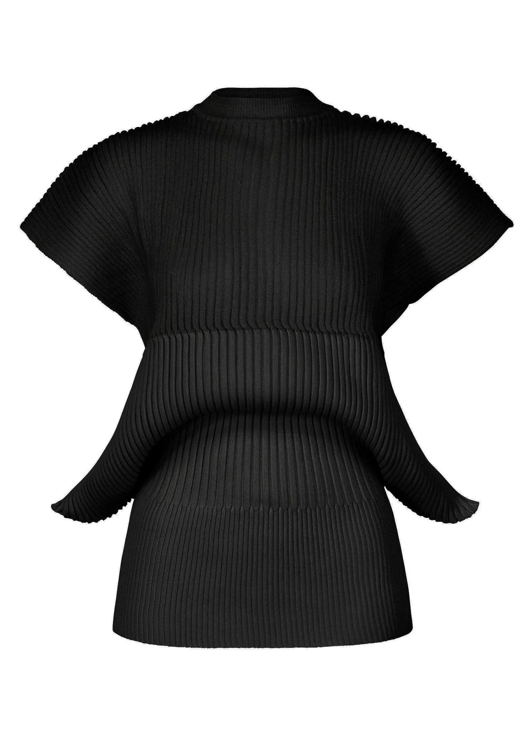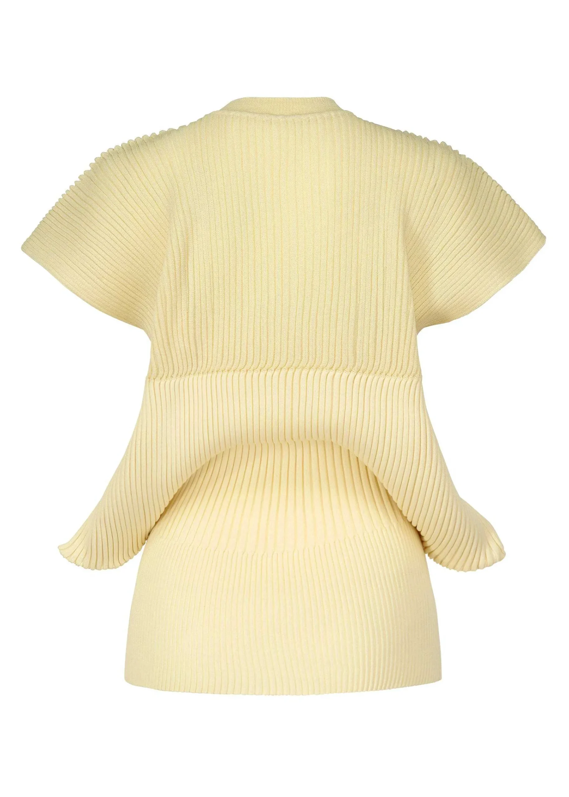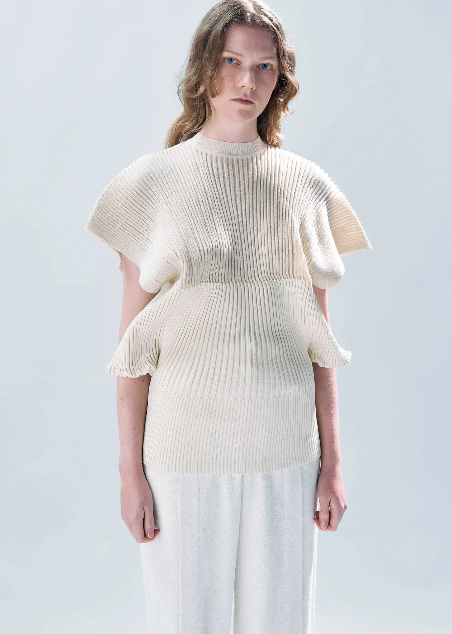 An Unsewn Knit Short-Sleeved Top Created With A Fan-Like Shape Using The “Fleshback Knitting” Technique. The Flechage Knitting Part Is Made Of A Blend Of Ramie And Polyester Yarn Combined With Cupro, Resulting In A Moderately Loose Feel And Soft Texture.