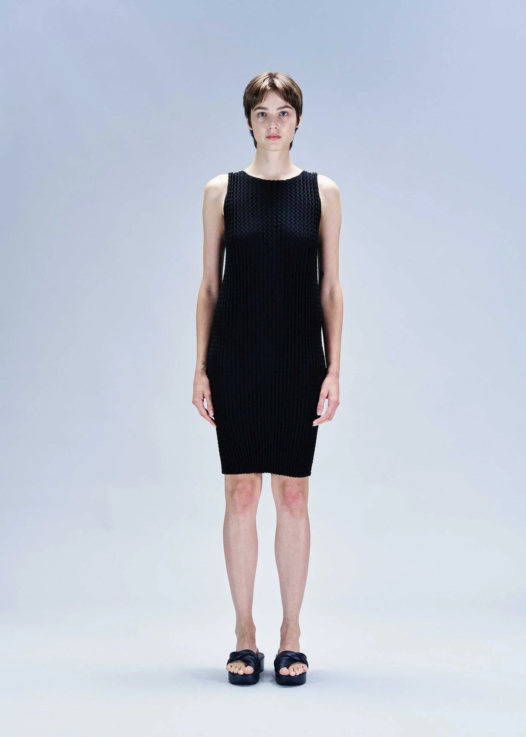 Sleeveless Dress Made Of Expressive Knit That Stretches And Contracts Like A Sponge. The Material Is Woven With Highly Twisted Yarn And Has A Lot Of Kickback, And Although It Looks Compact At First Glance, It Transforms Into A Silhouette That Fits Perfectly To Your Body When You Wear It. This Item Is Made From Cotton Polyester Material With A Soft Texture That Is Easy To Care For, And Is Perfect For Everyday Use.