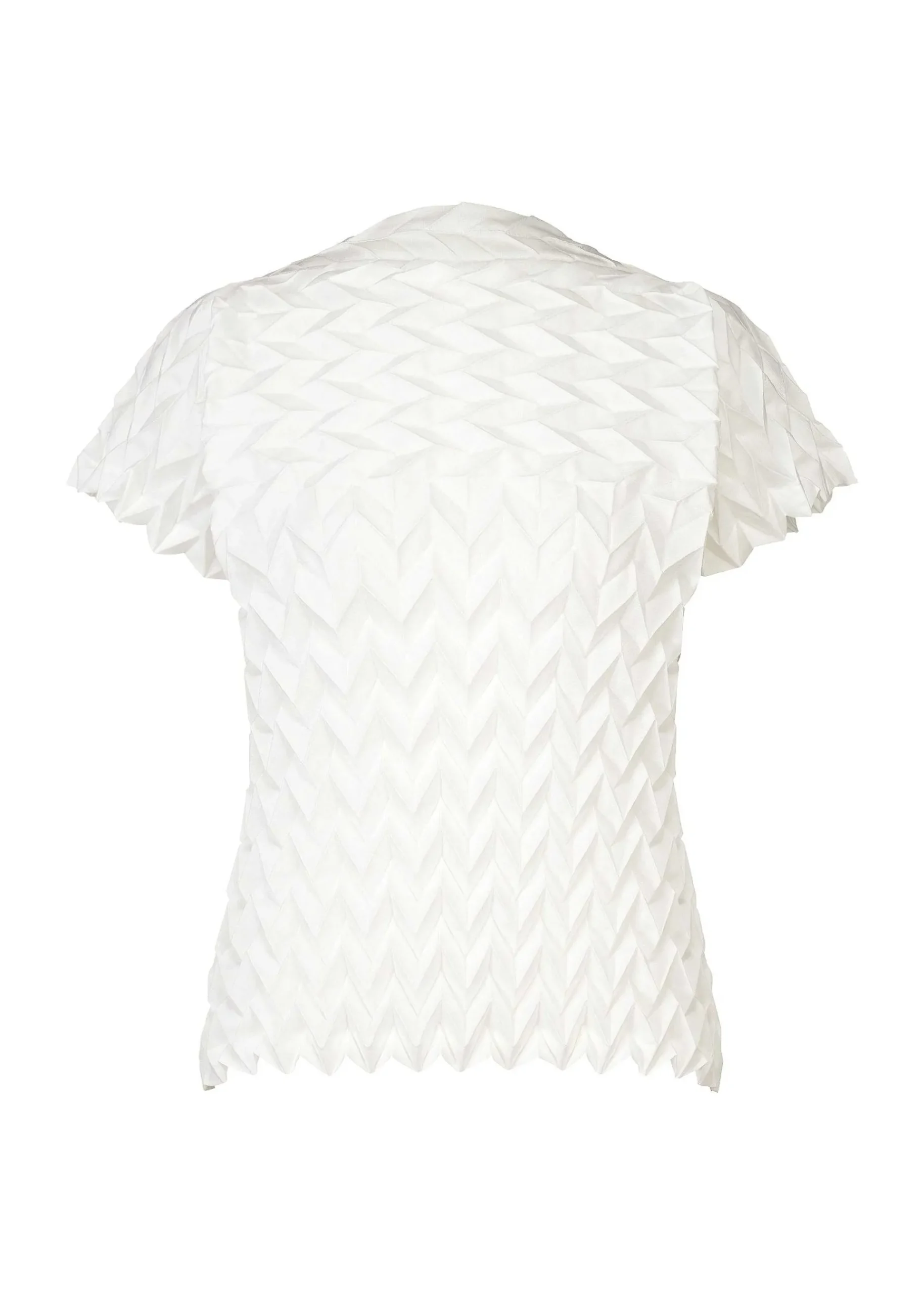 Short-Sleeved Top With A Geometric Pleated Shape, Featuring Steam Stretch*. The Simple Square Pattern Is Made By Combining Vertically And Horizontally Shrinking Patterns Using Steam Stretch. It Is Designed To Fit Neatly When Worn, And Its Unique Shape Is Eye-Catching When Laid Out. *A Manufacturing Method That Shrinks The Fabric By Applying High-Temperature Steam, Creating A Unique Stretch Material. A Thread That Shrinks When Heated Is Woven Together With Other Threads, And Only The Part Of That Thread Shrinks When Steam Is Applied. By Shrinking Only The Intended Parts Of A Woven Piece Of Fabric, A Three-Dimensional Pattern And Shape Are Created And The Garment Is Completed.