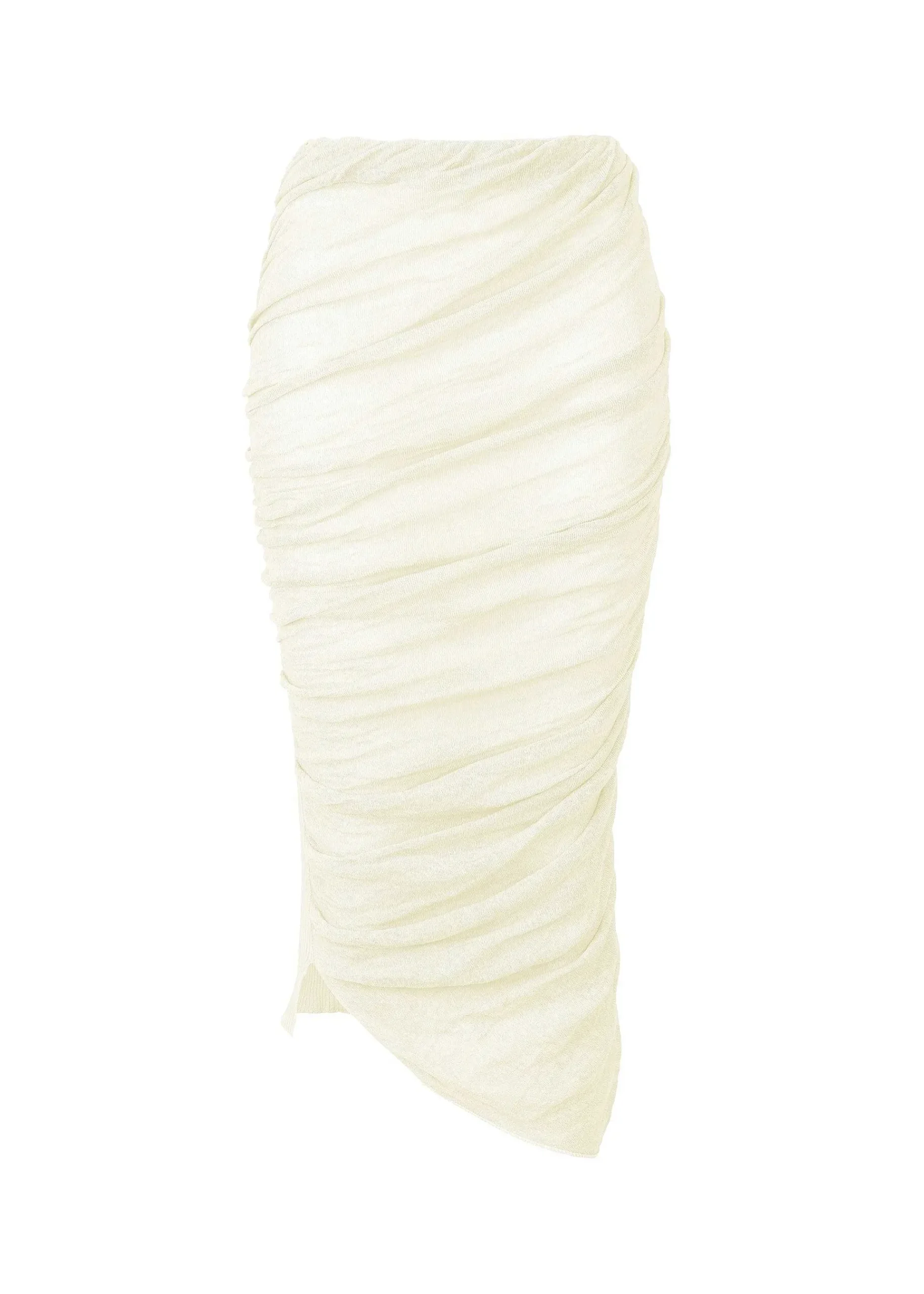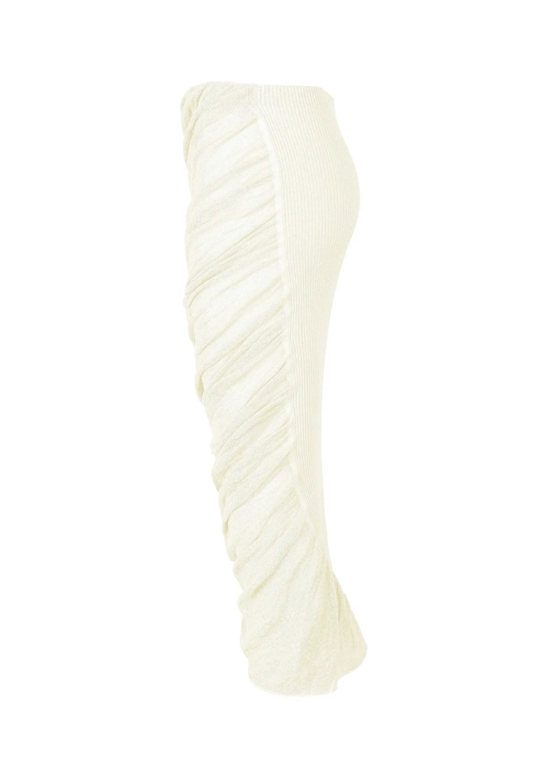 This Narrow Knit Skirt Is Inspired By The Delicate And Ambiguous Texture That Clings To The Body, With A Natural Twist Created By Twisting The Yarn. The Front Body Is Made Of A Sheer, Tightly Twisted Cotton Material With Only An S-Twist, Which Creates A Natural Twist In One Direction. In Contrast To The Delicate Impression Of The Front Body, The Back Body Is Made Of A Stretchy Polyester Ribbed Knit. By Changing The Material And Knitting Structure Between The Front And Back, The Twist Of A Single Tube Is Stopped At Both Sides. It Can Be Worn Alone, But We Also Recommend Layering It.