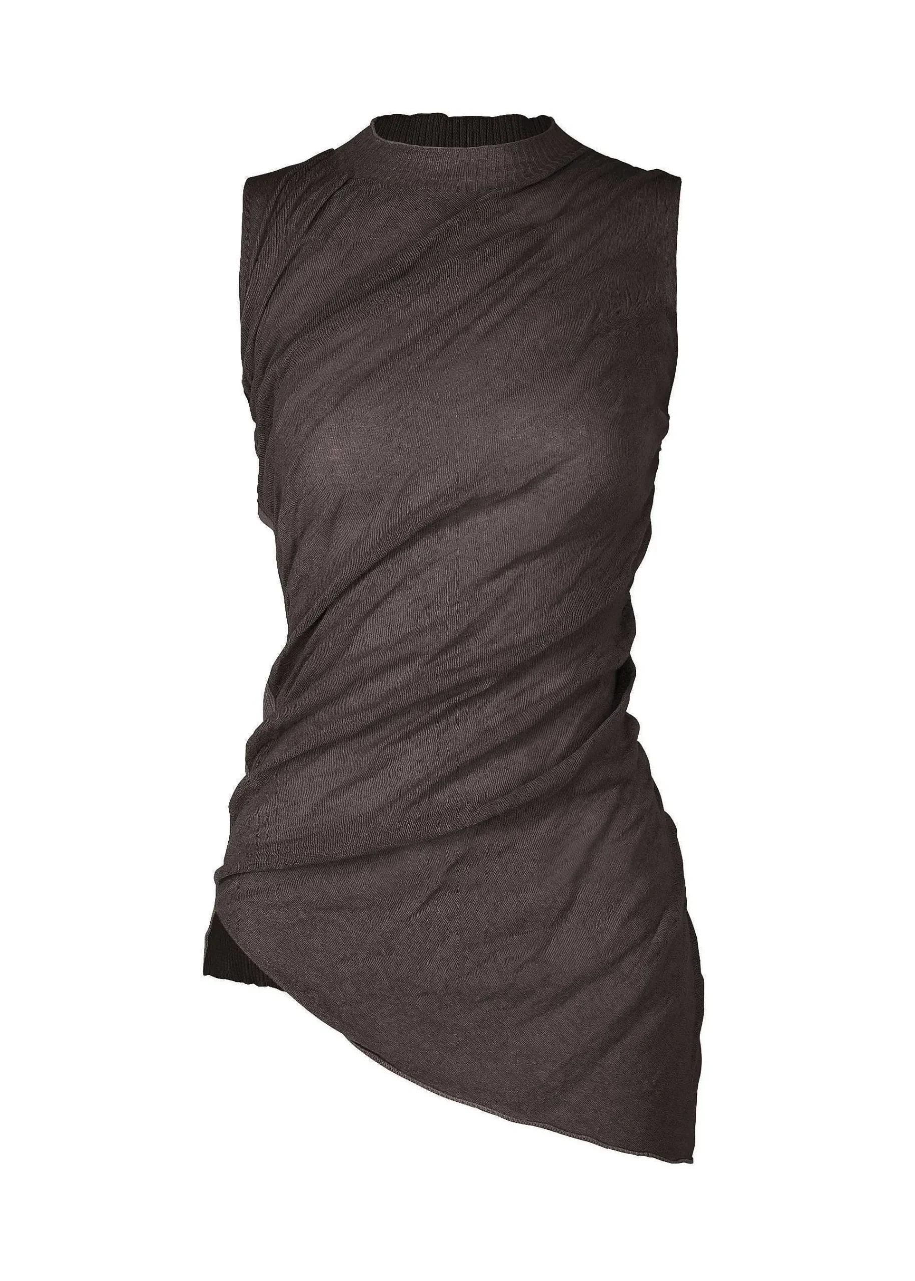 Knitted Sleeveless Top Created With The Image Of A Delicate And Ambiguous Texture That Clings To The Body, Created By Twisting The Threads To Create A Natural Twist. By Using Only The S-Twist Of Transparent, Highly Twisted Cotton Material For The Front Section, A Natural Twist Is Created In One Direction. In Contrast To The Delicate Front Section, The Back Section Is Made Of Stretchy Polyester Ribbed Fabric. By Changing The Material And Knitting Structure At The Front And Back, The Twist Of A Single Tube Is Stopped On Both Sides. Not Only Can You Wear It Alone, But We Also Recommend Layering It With A Layered Outfit.