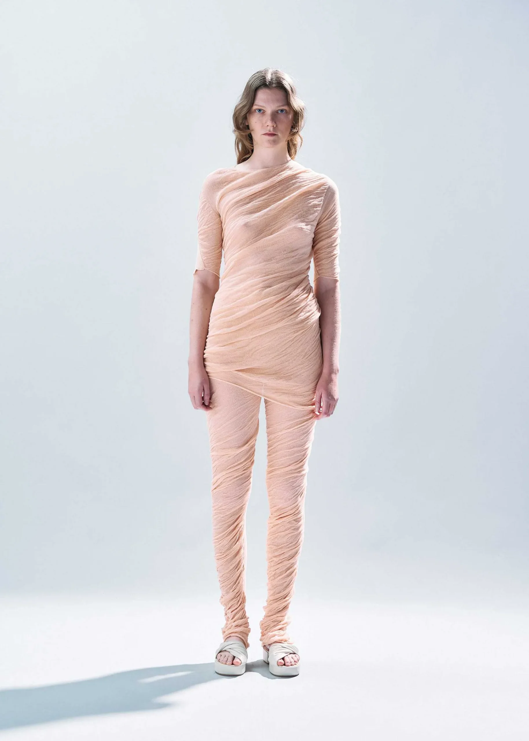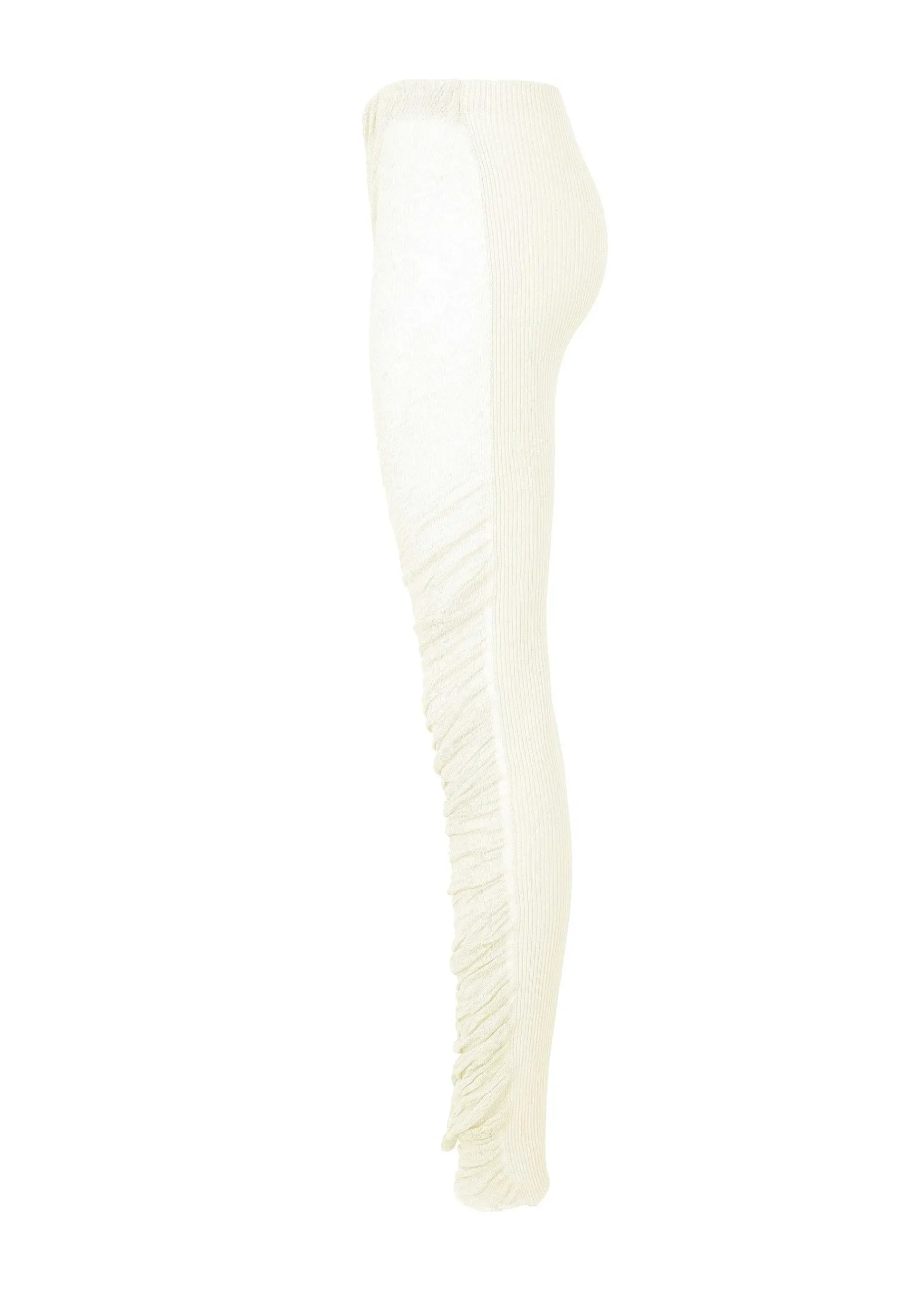These Knit Pants Are Created With A Natural Twist Created By Twisting The Threads, With The Image Of A Delicate And Ambiguous Texture That Clings To The Body. By Using Only The S-Twist Of Transparent, Highly Twisted Cotton Material For The Front Section, A Natural Twist Is Created In One Direction. In Contrast To The Delicate Front Section, The Back Section Is Made Of Stretchy Polyester Ribbed Fabric. By Changing The Material And Knitting Structure At The Front And Back, The Twist Of A Single Tube Is Stopped On Both Sides. Not Only Can You Wear It Alone, But We Also Recommend Layering It With A Layered Outfit.