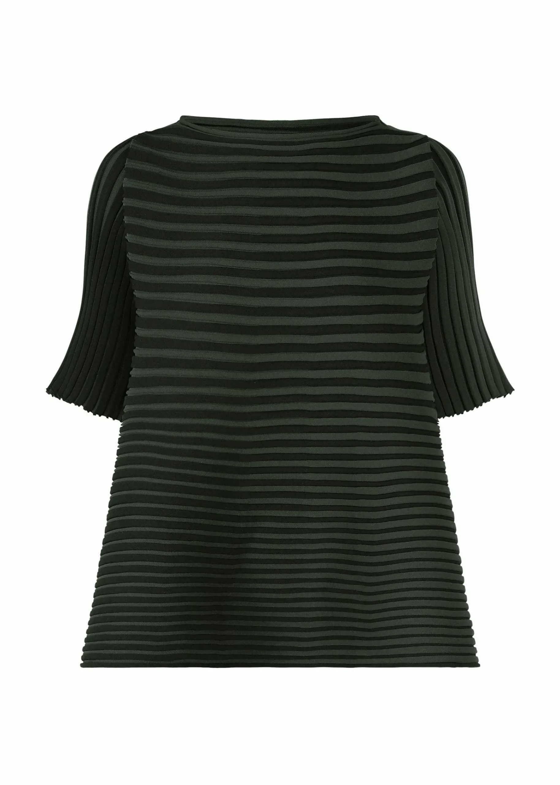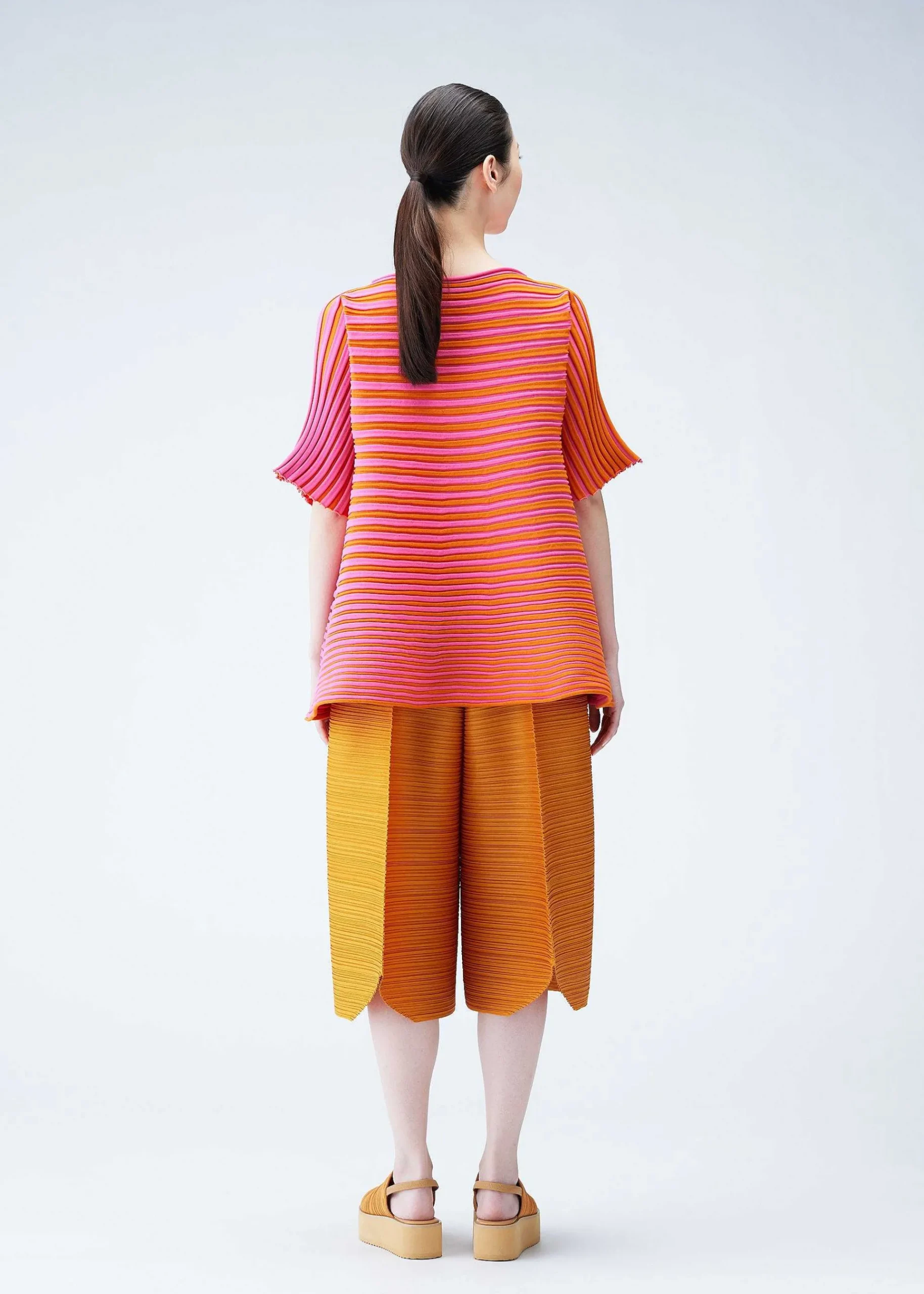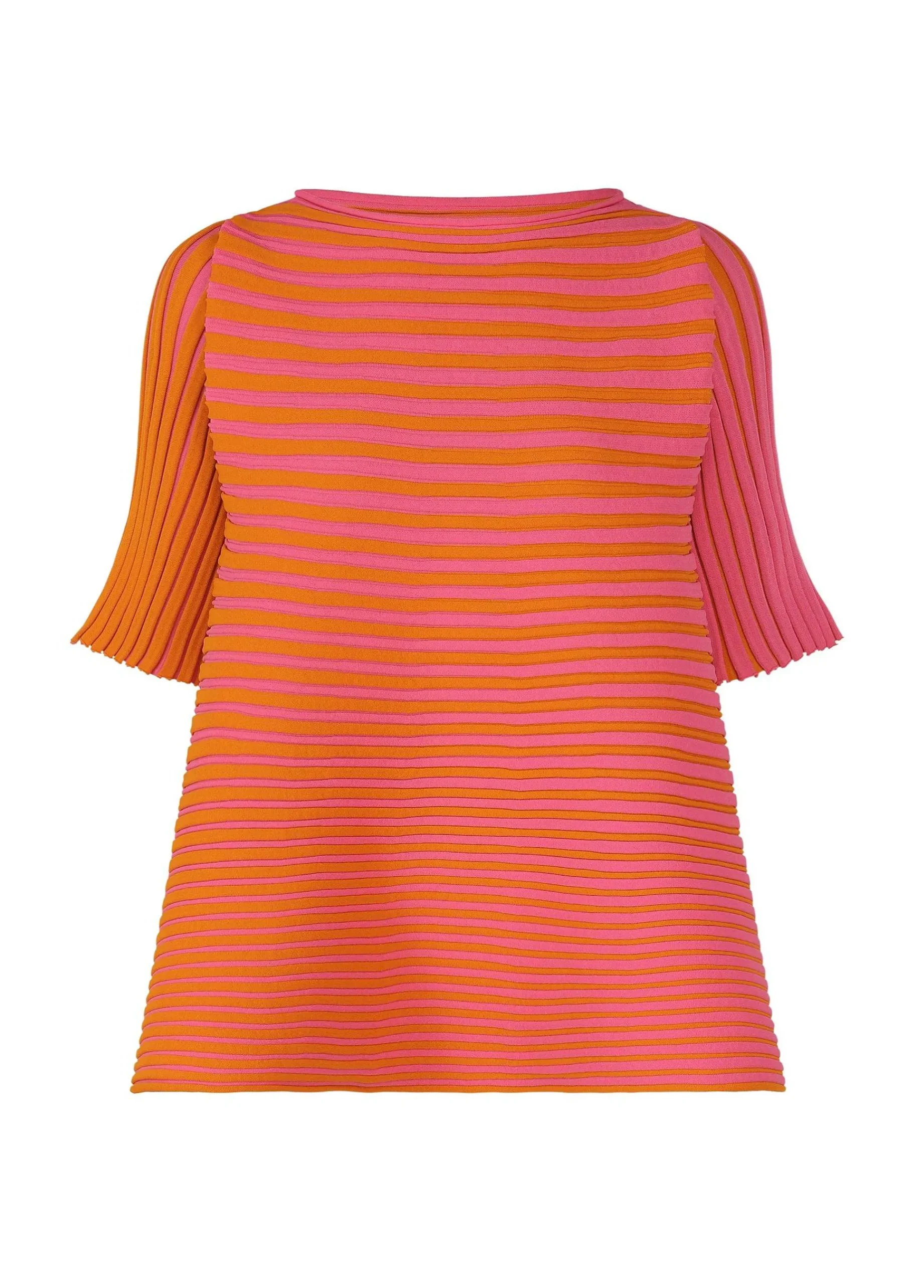 A Seamless Knit That Expresses Horizontal Pleats With A Knitted Structure That Bounces With Movement. By Adjusting The Thickness Of The Border, This Design Gives The Appearance Of A Horizontal Color Gradation. Made From Recycled Polyester Yarn, This Easy-Care Textile Is Machine Washable.