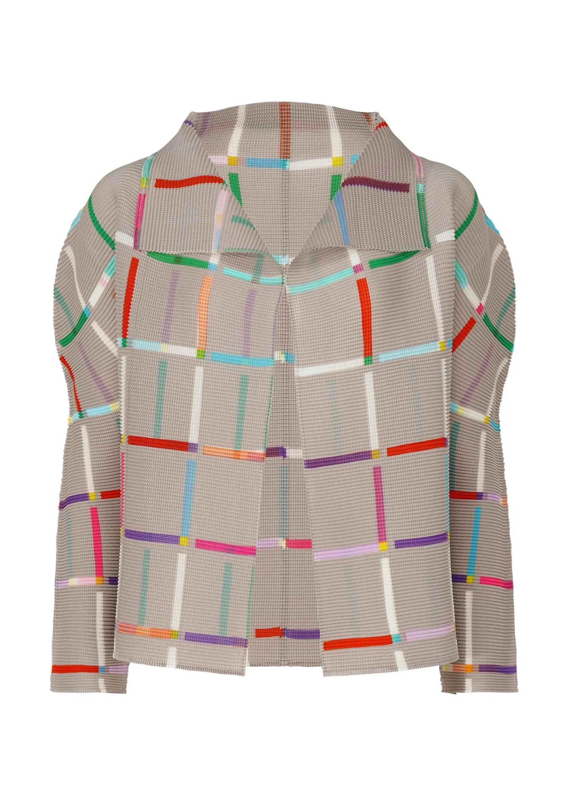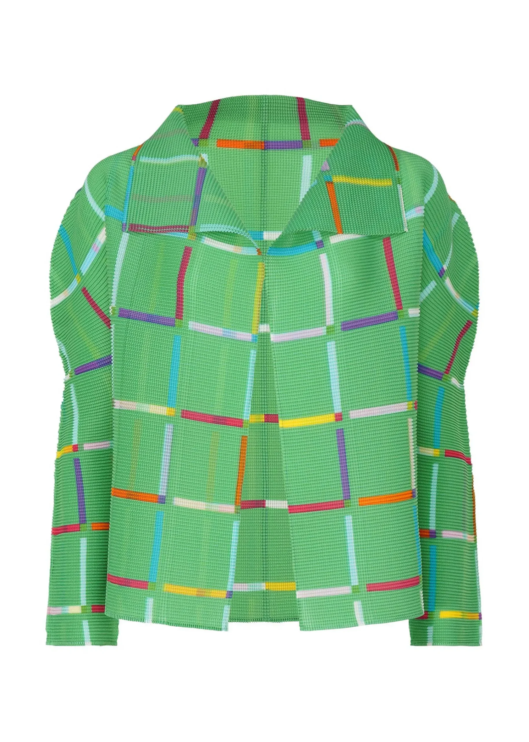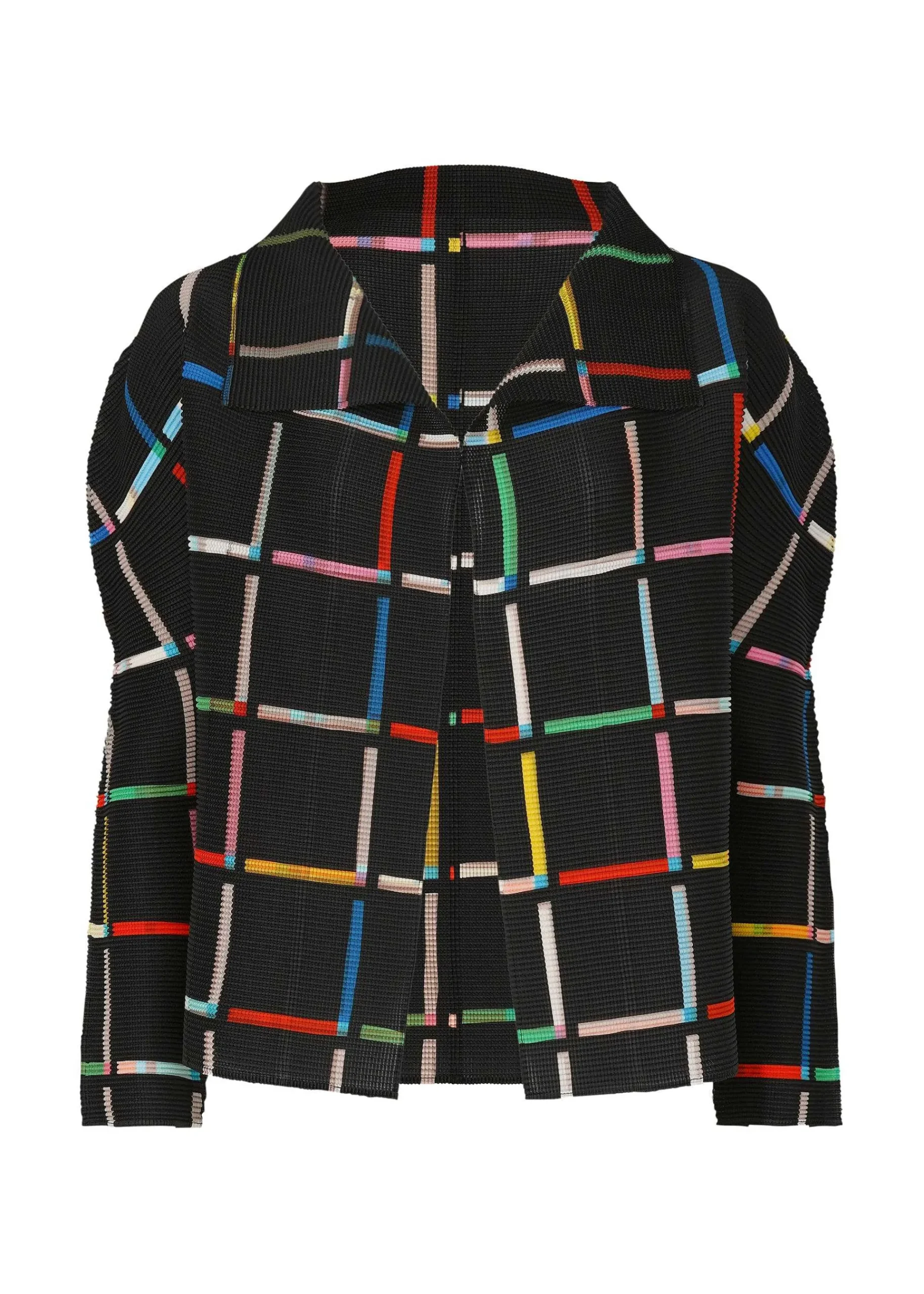 Long-Sleeved Cardigan With Stretch Pleats, Vertically And Horizontally Pleated. This Pattern Is Created By Arranging Colorful Toy Sticks In A Square Pattern To Create A Lattice Pattern. The Pattern Of This Product Is Different One By One. Please Note.