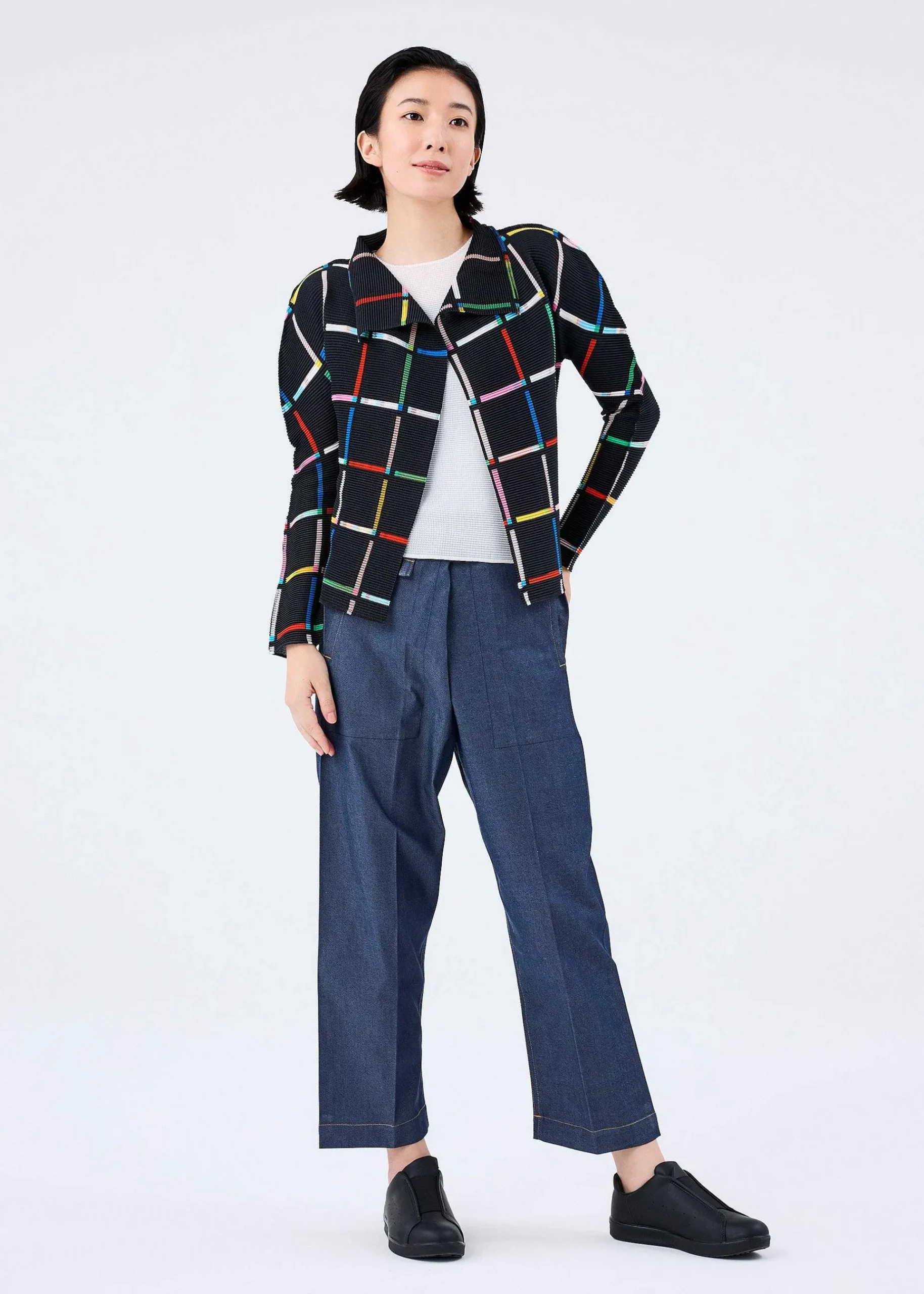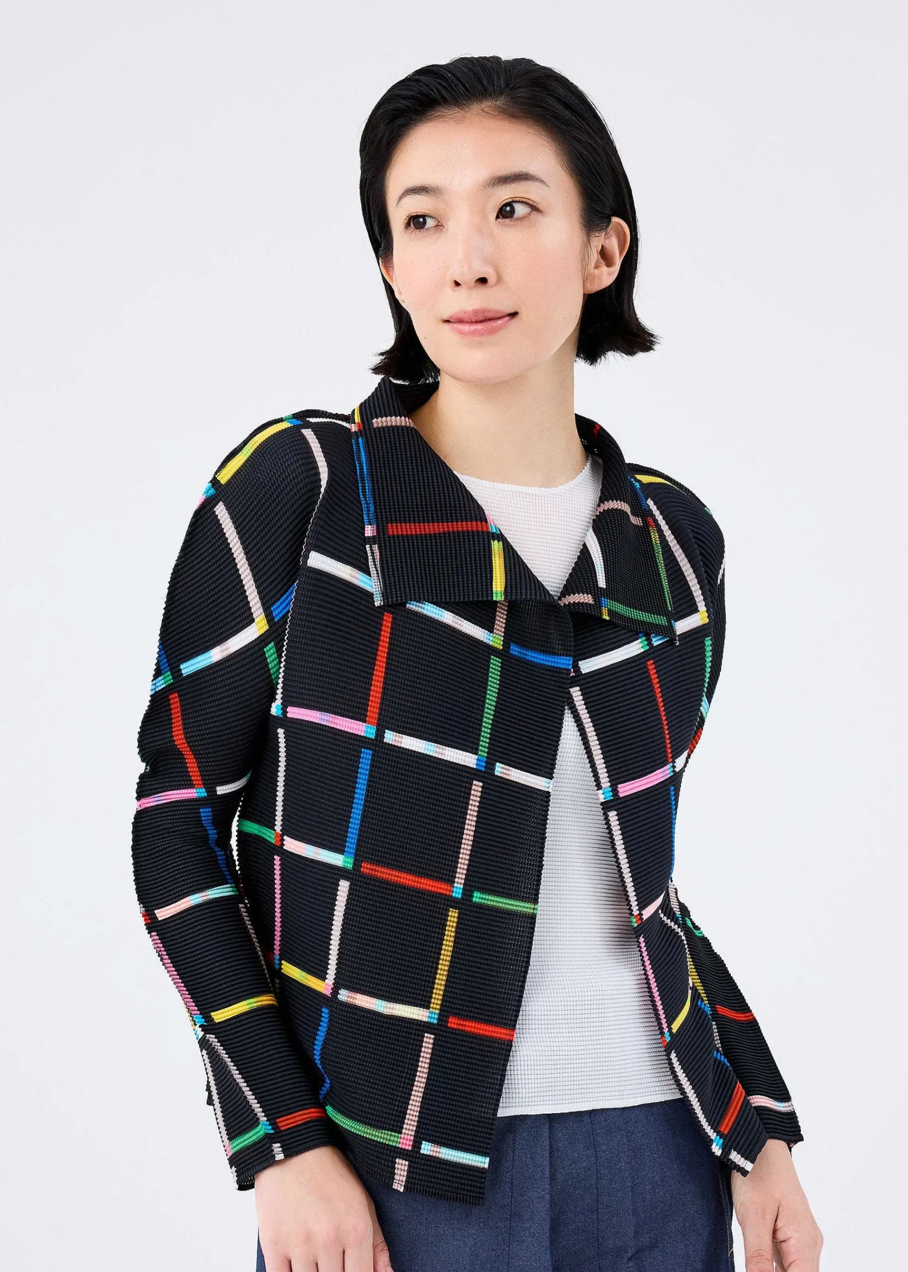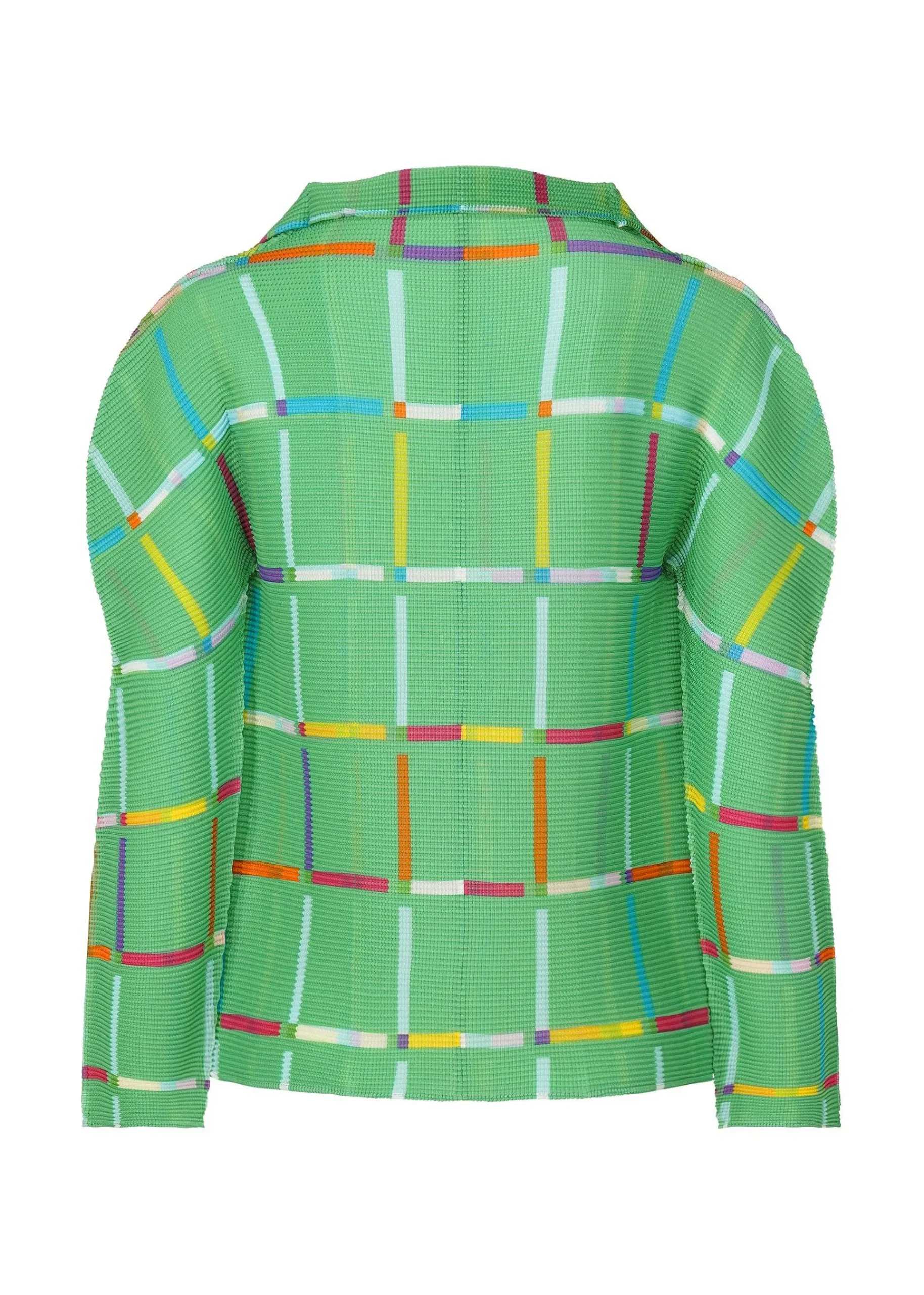 Long-Sleeved Cardigan With Stretch Pleats, Vertically And Horizontally Pleated. This Pattern Is Created By Arranging Colorful Toy Sticks In A Square Pattern To Create A Lattice Pattern. The Pattern Of This Product Is Different One By One. Please Note.