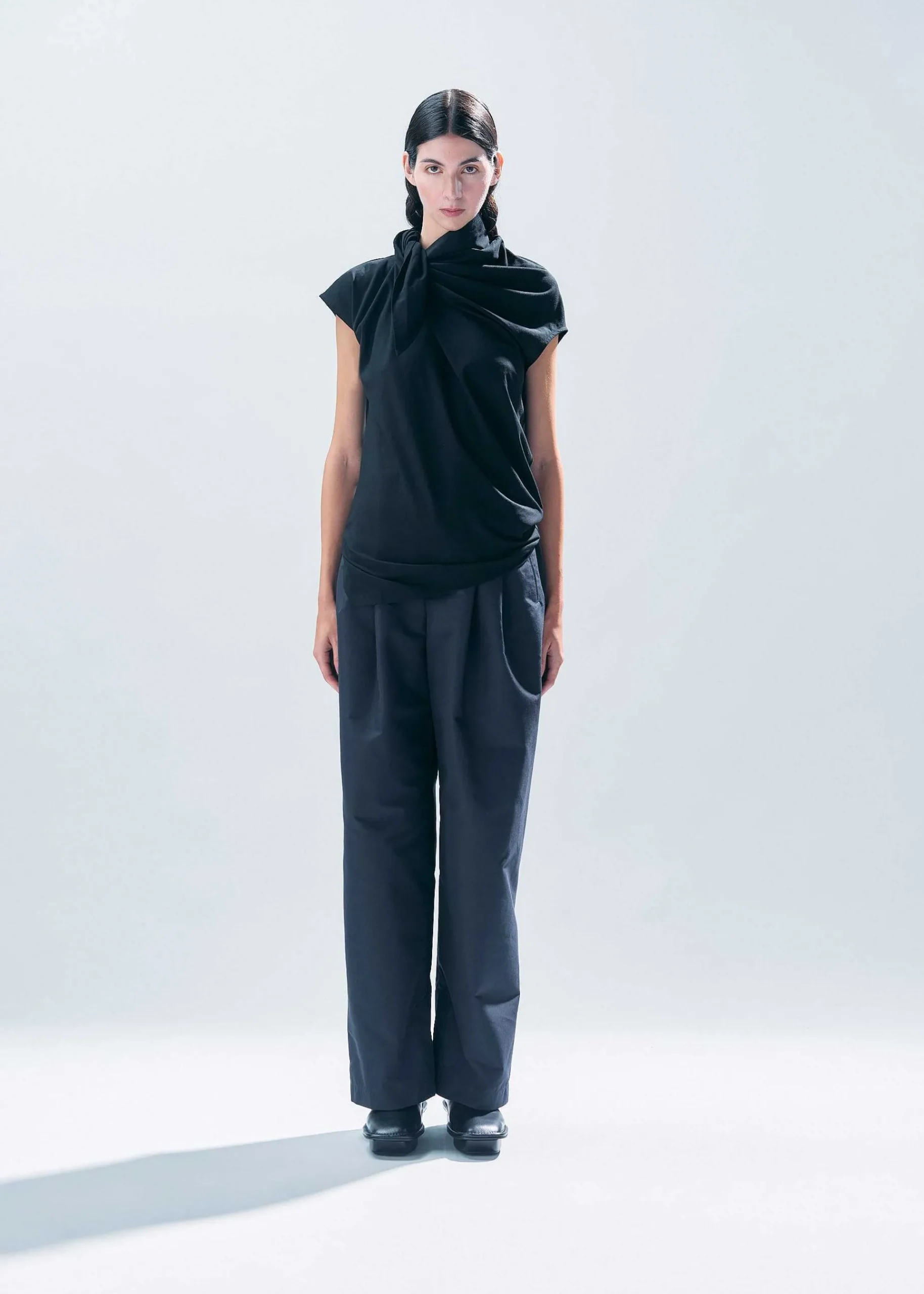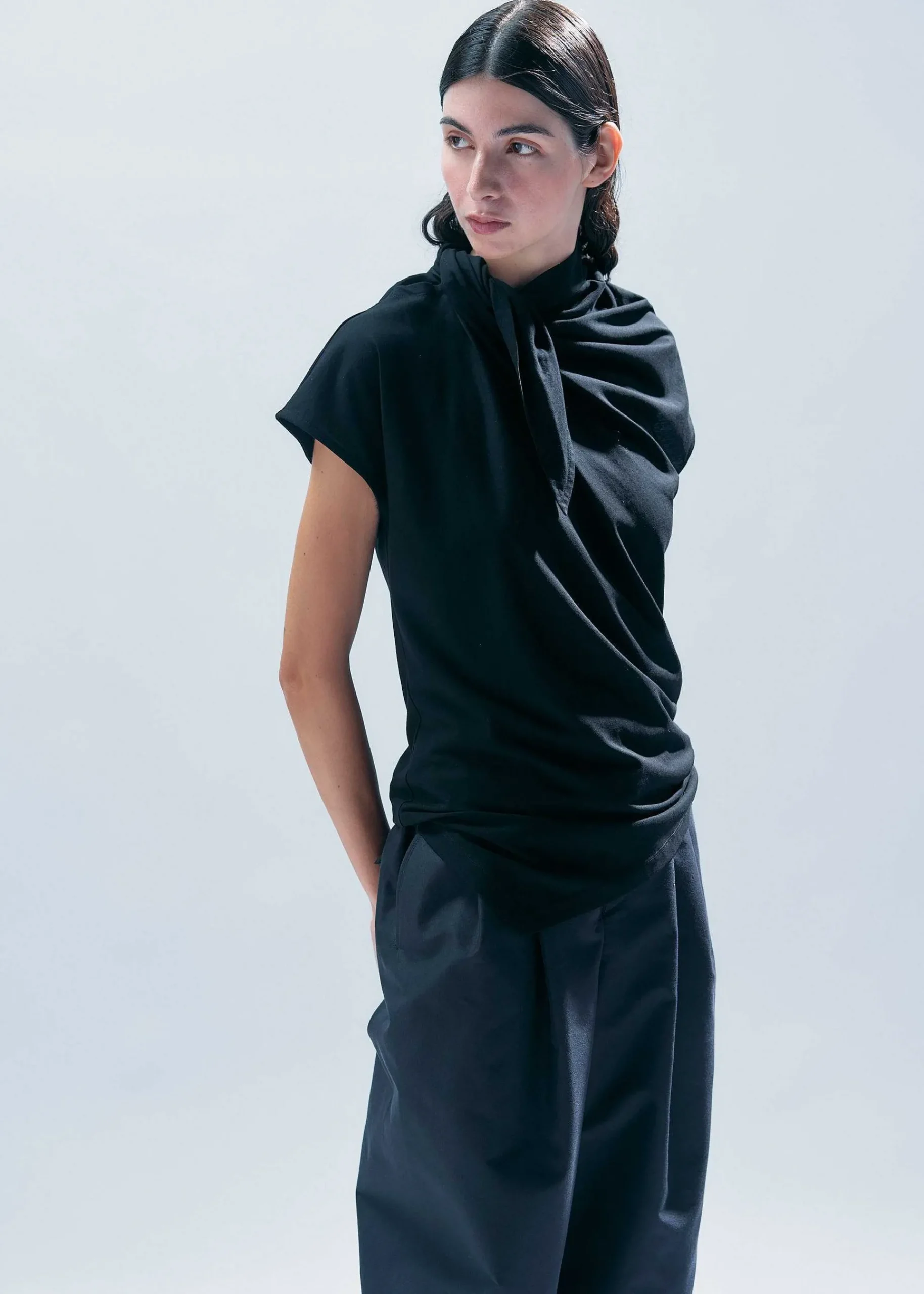 French Sleeve Top With A Voluminous Design At The Neck. We Use A Strong Twist Jersey Cotton Jersey That Eliminates The Fluff Of The Yarn To The Maximum And Has A Fullness That Makes It Easy To Release From The Skin. It Is Made With A Flat Pattern, But By Tying The Collar And Wearing It, A Beautiful Drape Is Created.