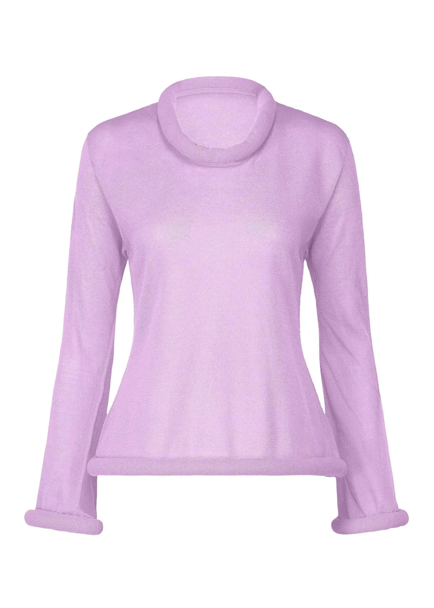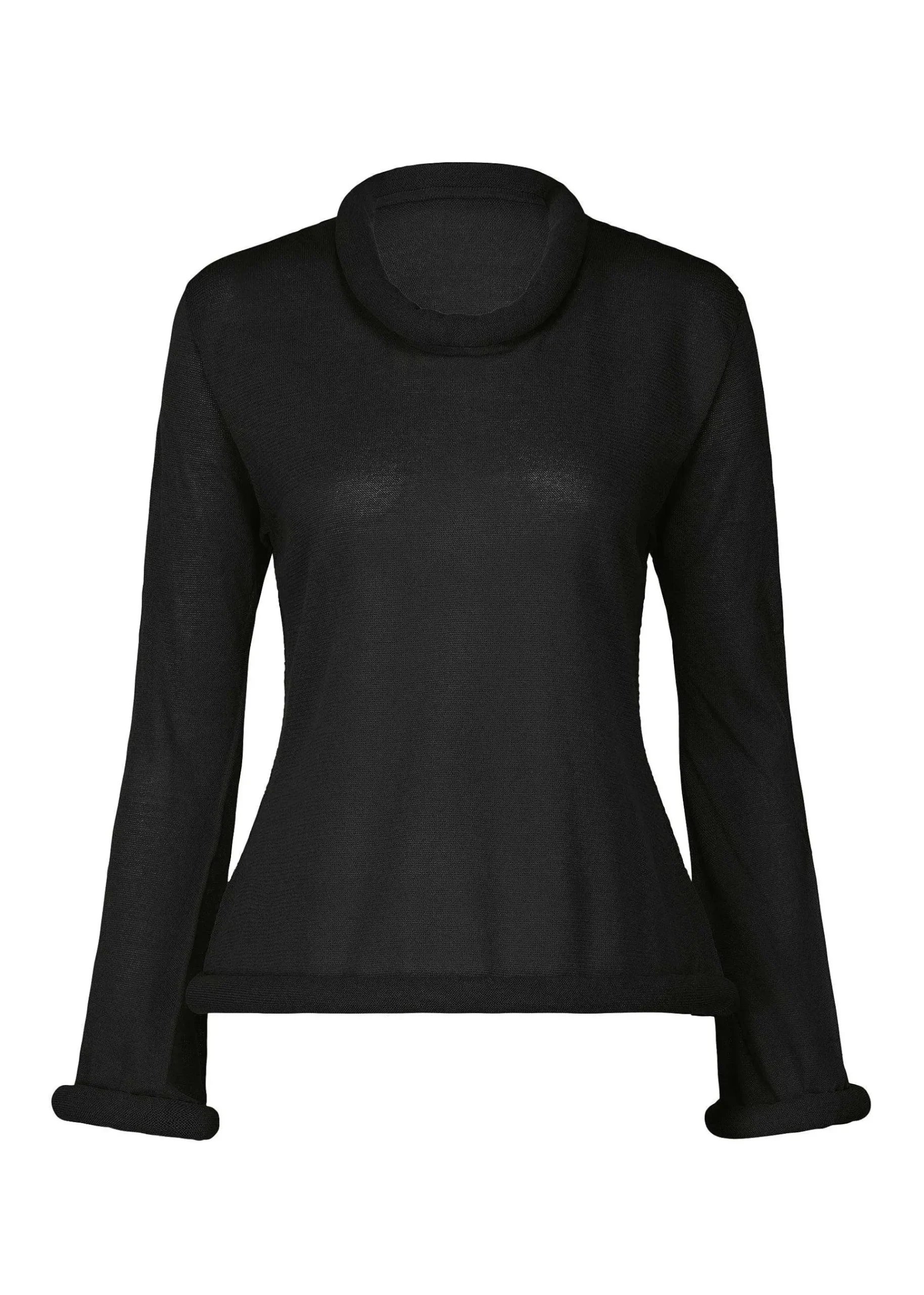 Long-Sleeved Knit Top Featuring A Bold Curled Neckline And Hem. The Use Of Firm Yarn Made From A Combination Of Cotton And Polyester Emphasizes The Natural Curling, Making This A Pop And Catchy Item. It Has A Dry Texture That Feels Cool To The Touch.