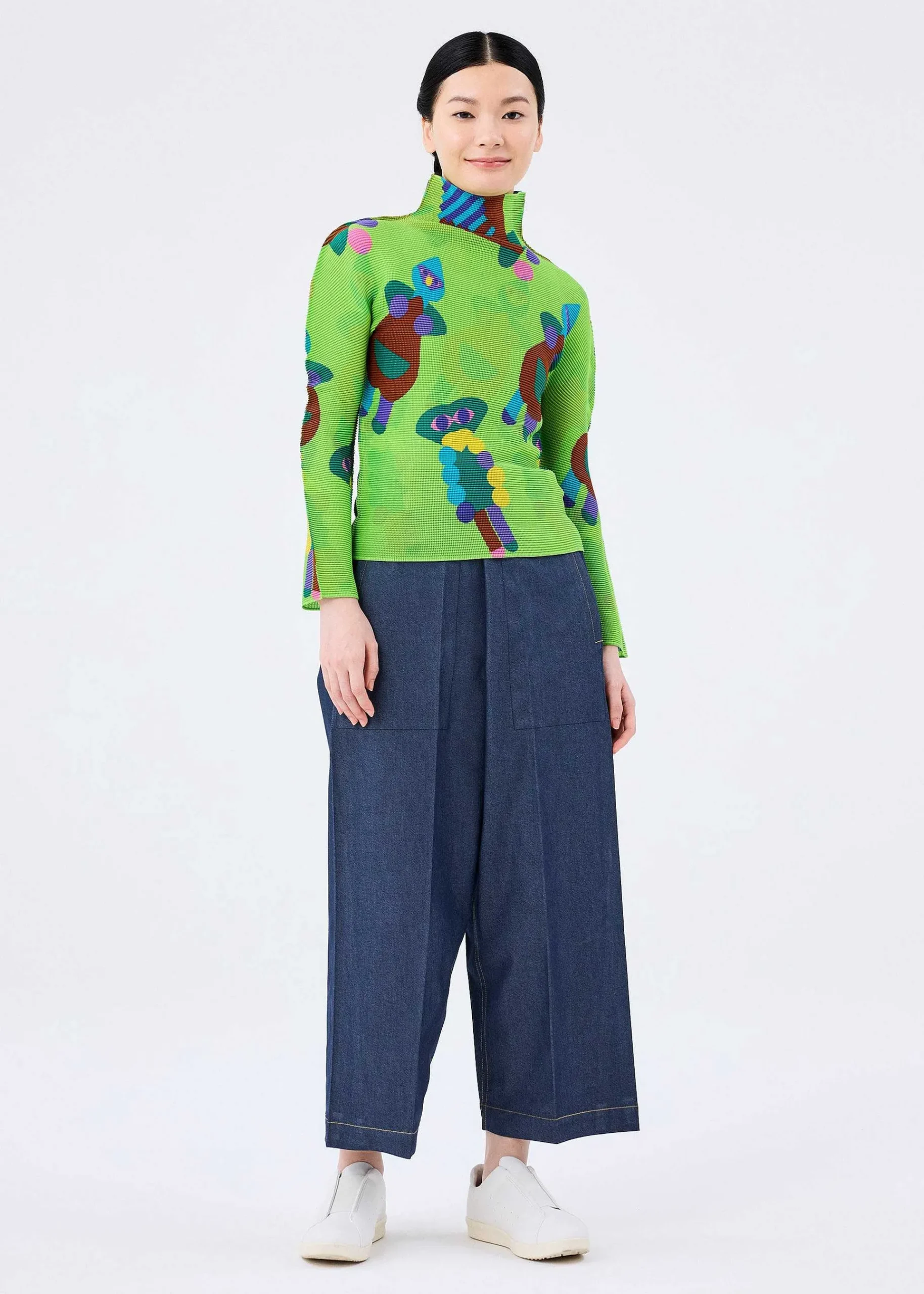 High-Neck Long-Sleeved Top With Stretch Pleats, Vertically And Horizontally. A Fun And Pop Colorful Pattern Inspired By Clay Clay. The Pattern Of This Product Is Different One By One. Please Note.