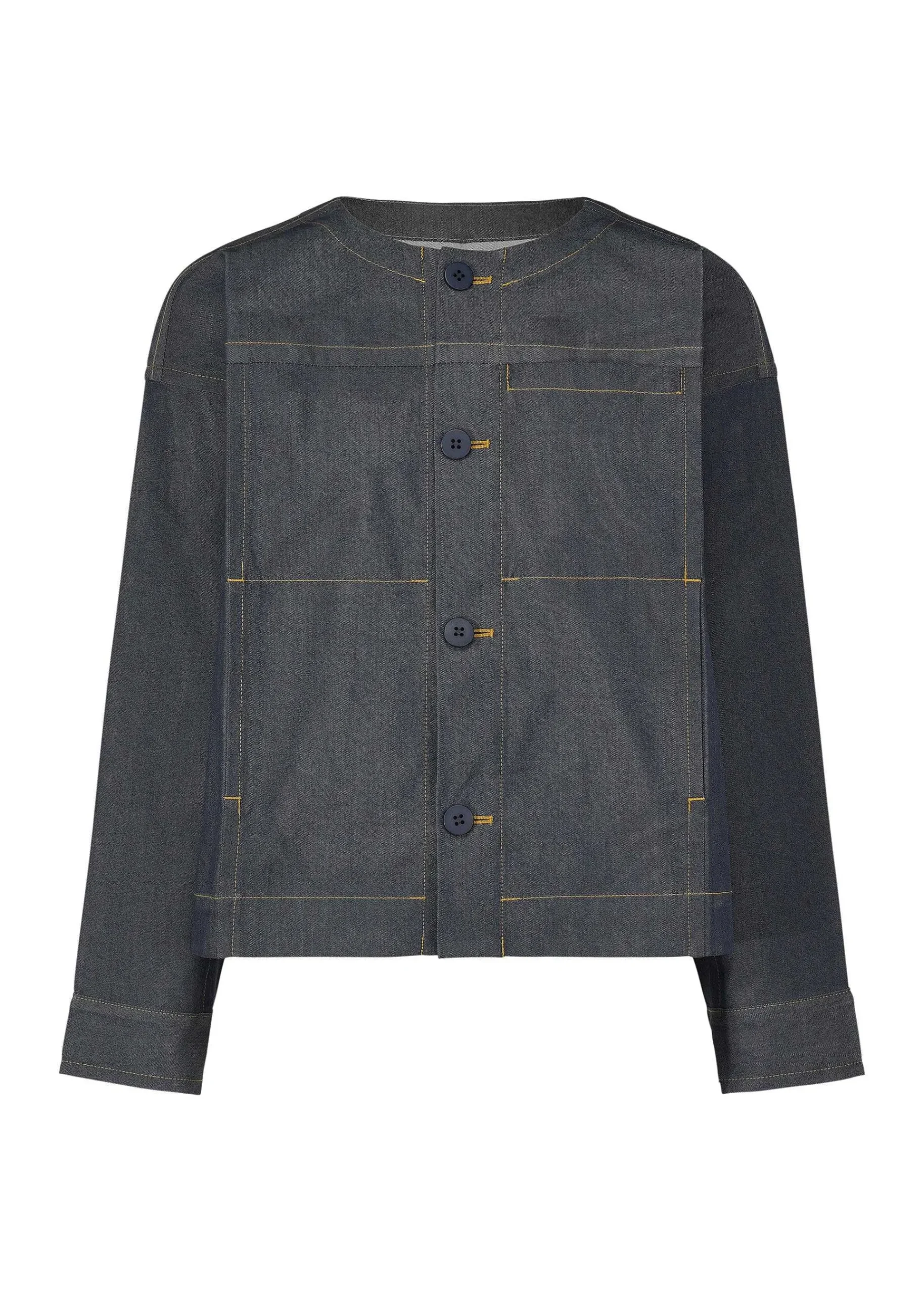 This Collarless Jacket Is Made Of Recycled Polyester Denim Fabric And Can Be Folded Along The Creases For Easy Carrying. In Order To Reproduce The Subtle Shades Of Denim, Recycled Polyester Dyed Yarns Made By Mixing Colors At The Cotton Stage Are Used For The Warp Threads, And The Jacket Is Washed To Give It A Realistic Denim Texture. There Are Pockets On Both Sides And On The Left Chest.
