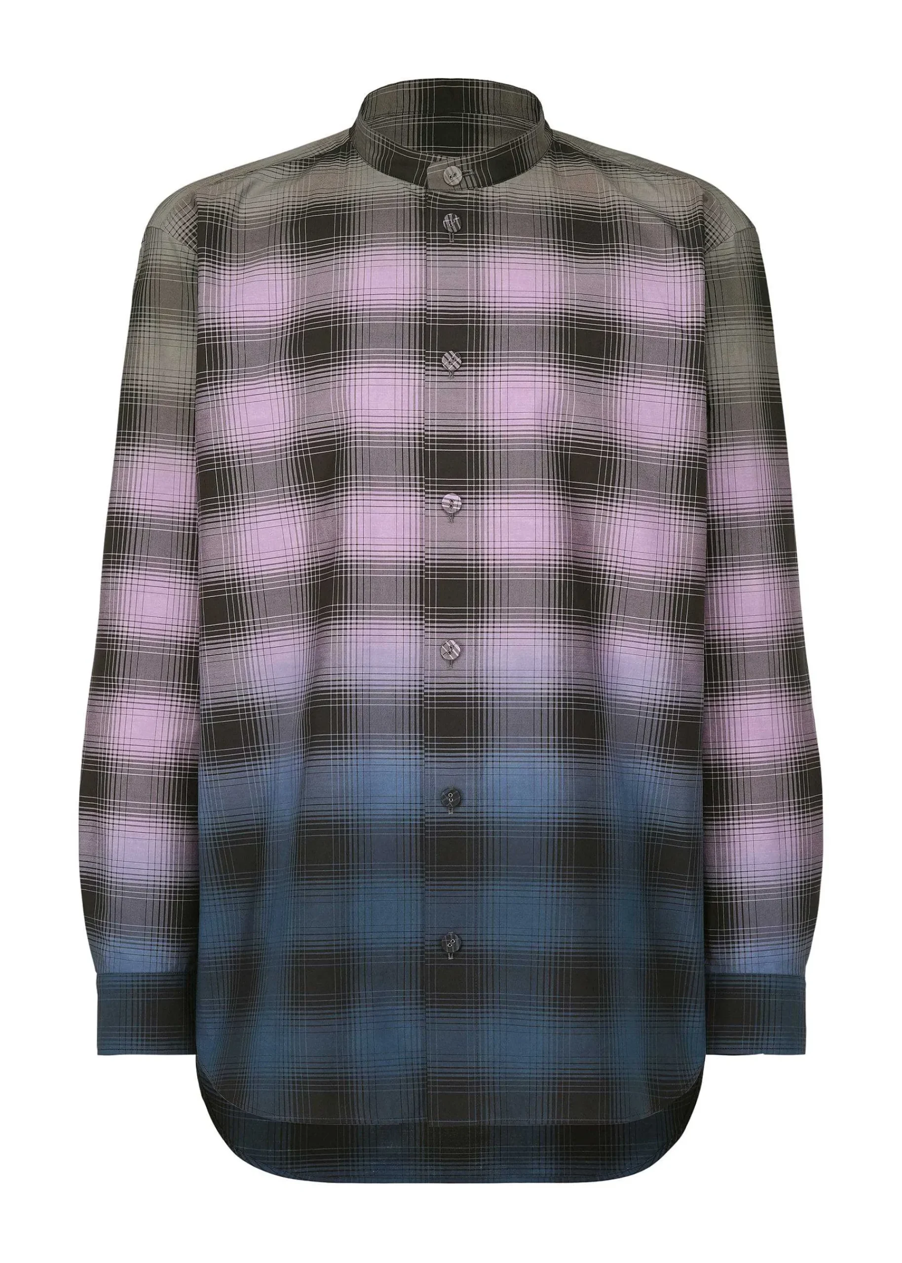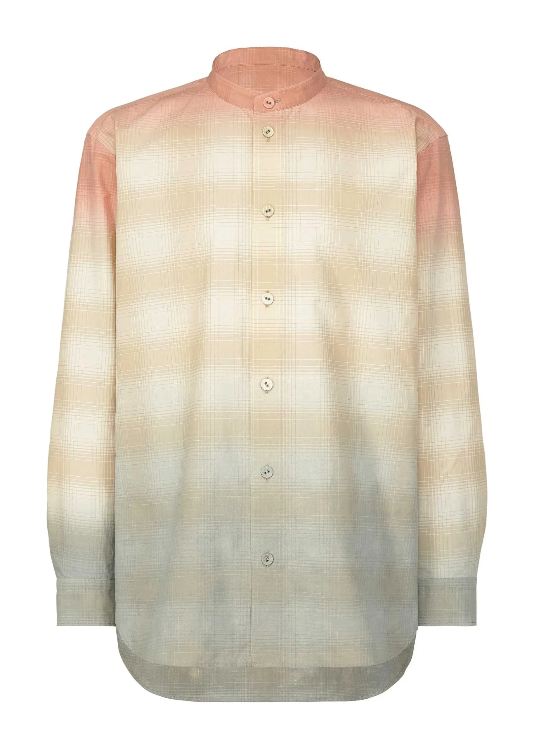This Stand-Up Collar Long-Sleeve Shirt Is Made Of 100% Organic Cotton Checkered Broadcloth With A Three-Color Gradation Print That Resembles A Horizon, Creating A Gorgeous Impression. The Vibrant Gradation Colors Are Printed Using A Special Technique By Skilled Craftsmen At A Historic Dyeing Factory In Kyoto. This Item Is Available In A Size That Can Also Be Worn By Men. Due To The Nature Of The Dyeing Process, The Color Will Vary From Item To Item. Please Note This In Advance.