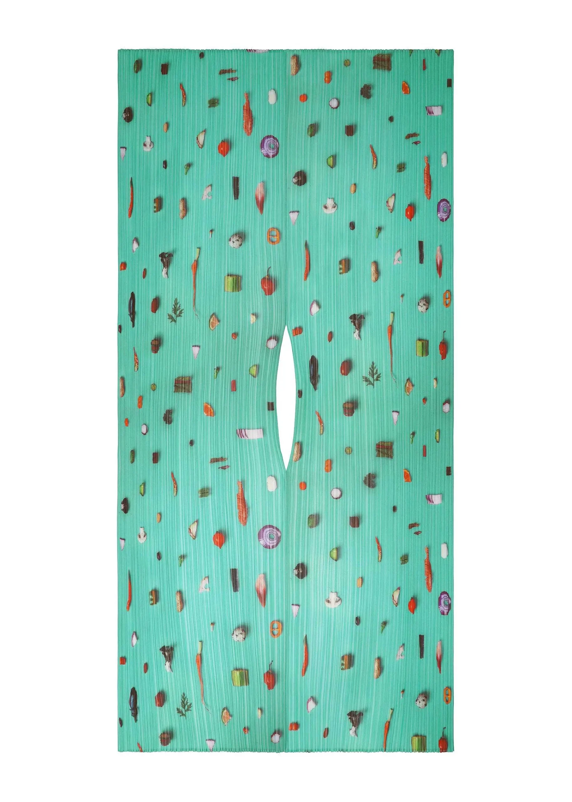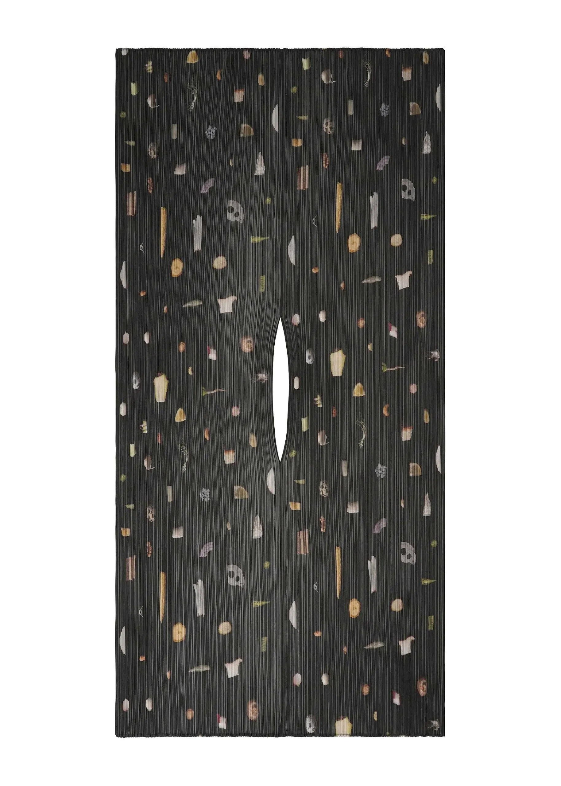 A Large Pleated Scarf With A Print Of Various Ingredients, Expressing The Excitement Of Cooking. There Is A Hole In The Center So You Can Wear It Over Your Head.