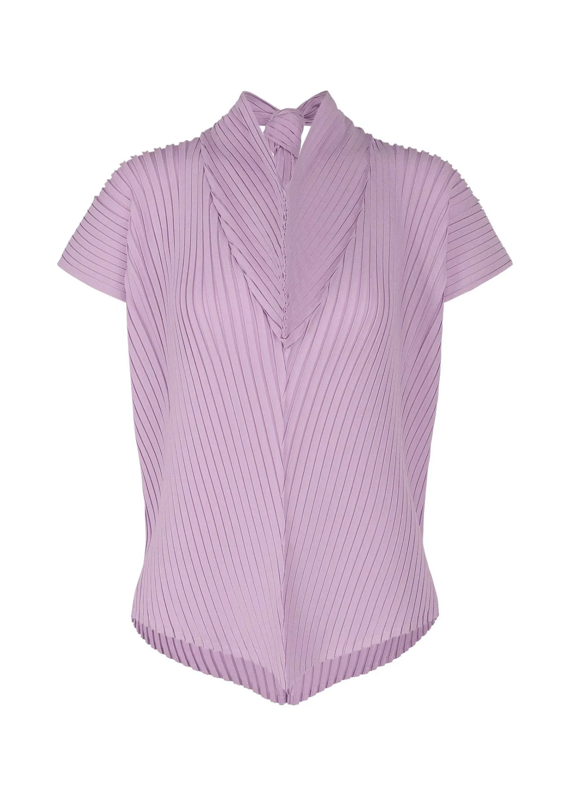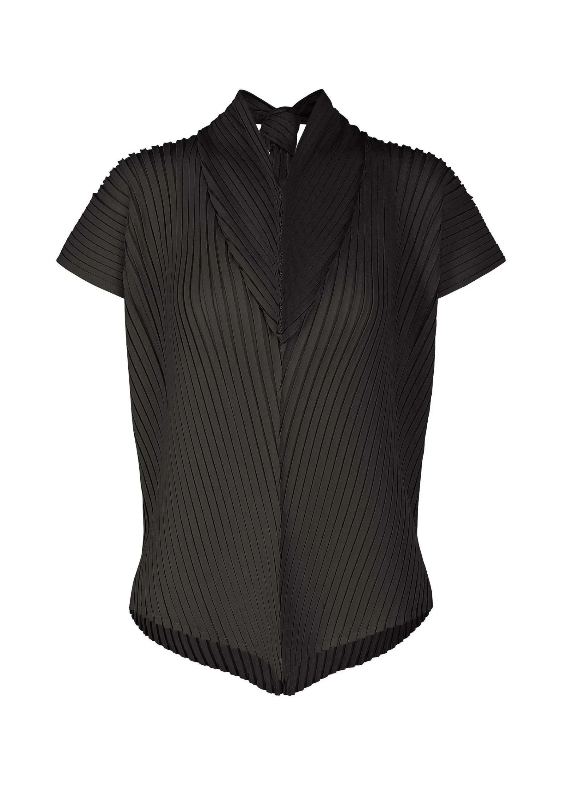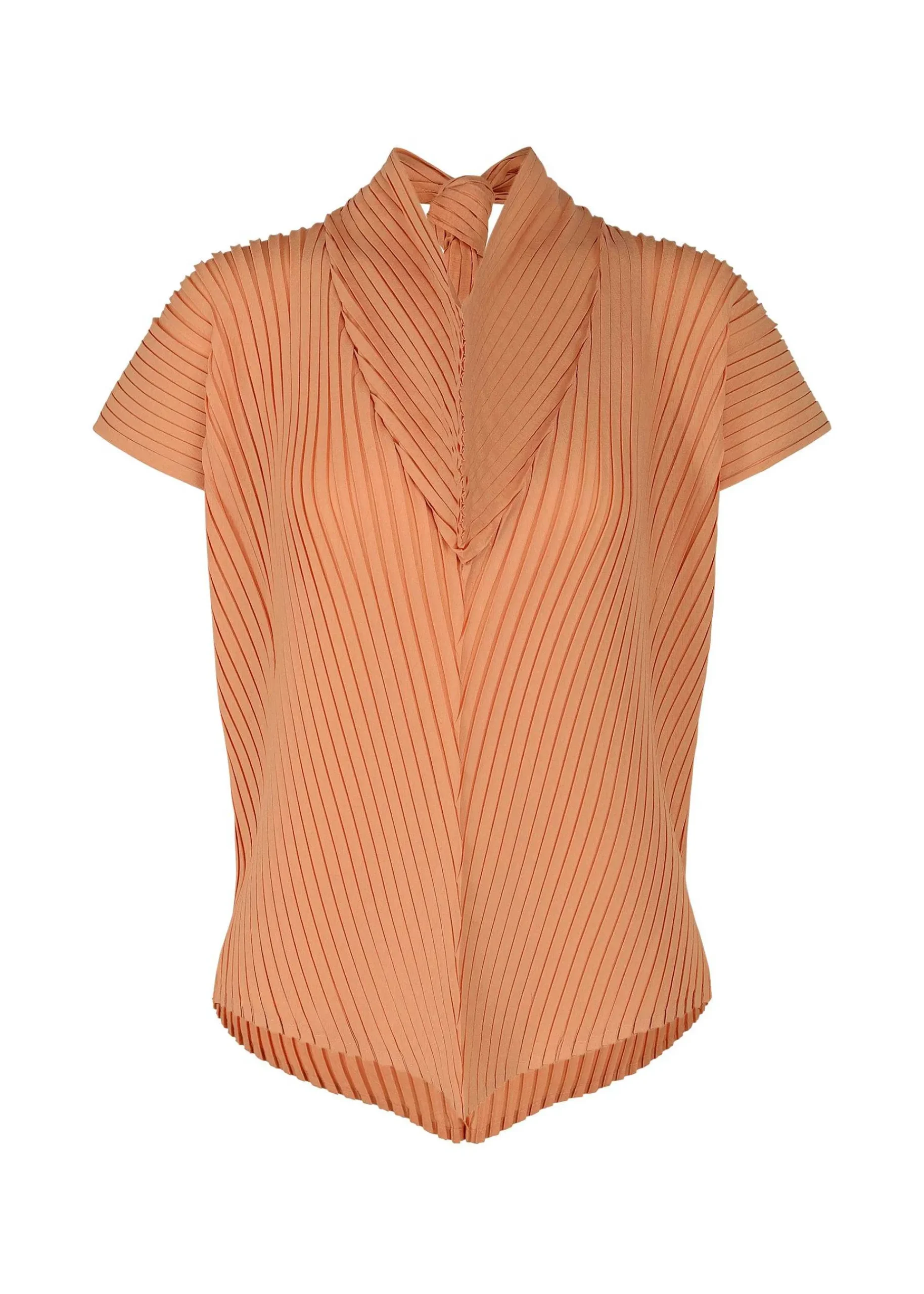 Pleated Short-Sleeved Top With A Paper-Like Texture. It Features A Folded Design That Highlights The Beauty Of The Pattern. Although It Is 100% Polyester, It Is Thin And Has A Firm Feel, Similar To A Natural Material, And Has A Simple Box Pleat Finish. It Is Designed To Be Worn By Tying It Around The Neck. This Product Has Different Sizes One By One. Please Note.