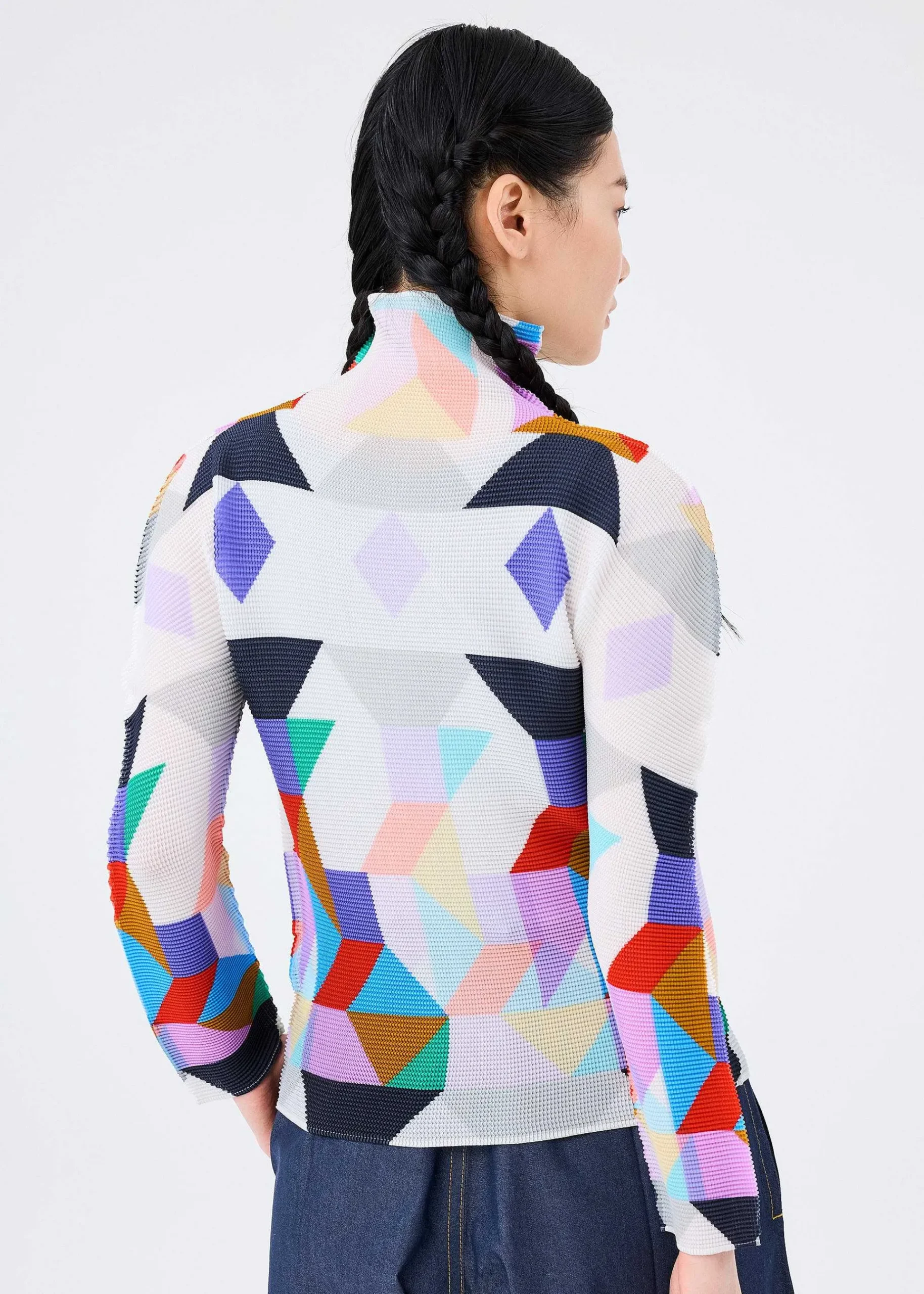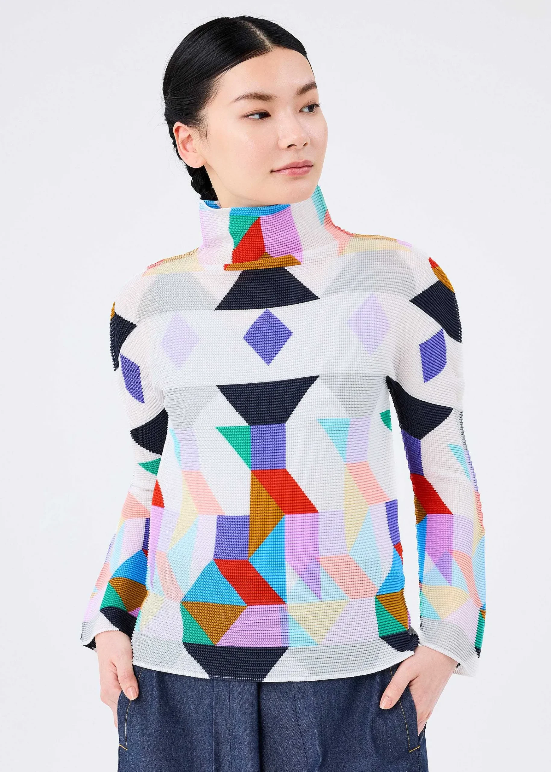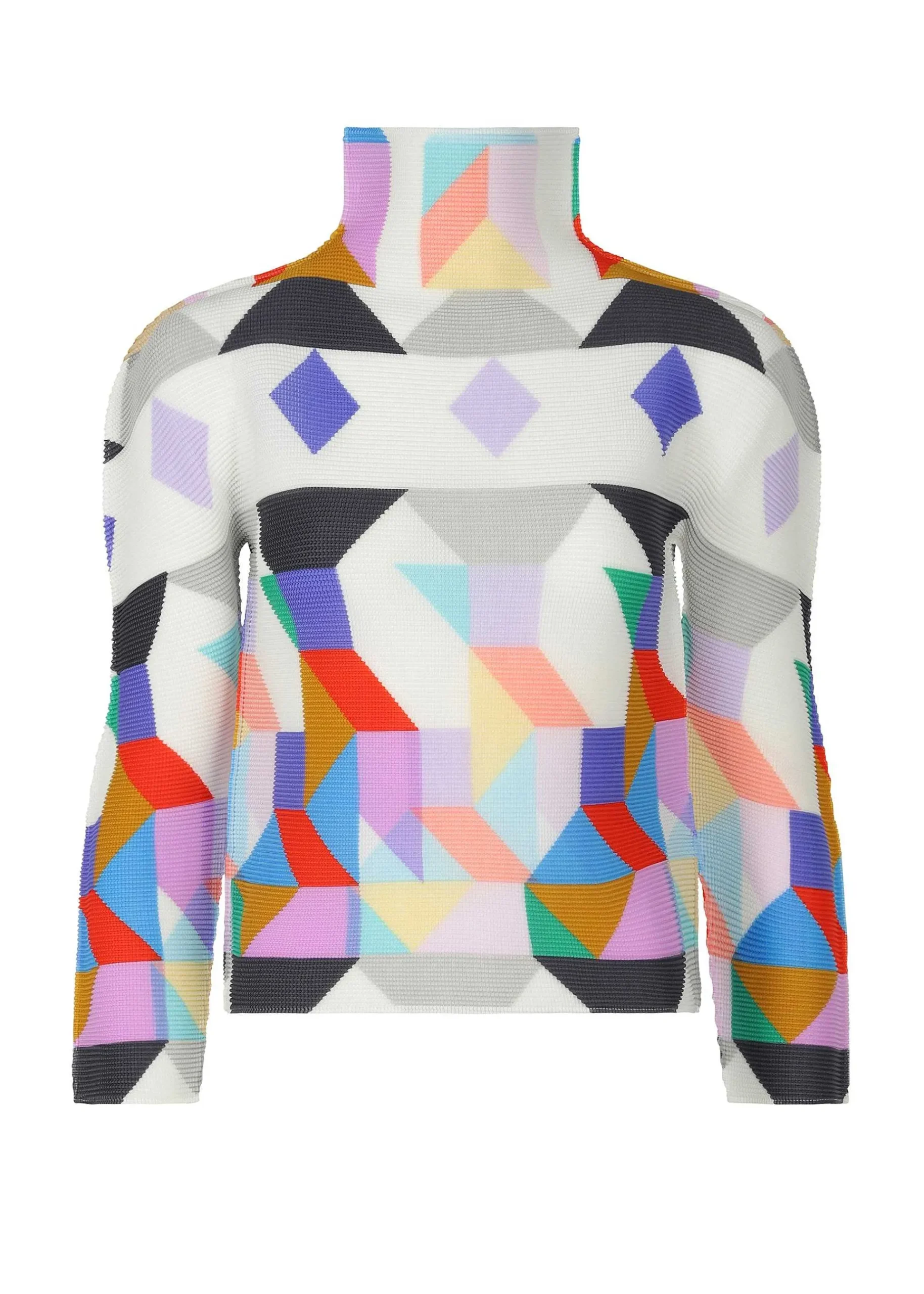 High-Neck, Long-Sleeved Top With Stretch Pleats That Are Pleated Vertically And Horizontally. The Pattern Is Inspired By A Rocket Taking Off Into Space, With Various Shapes Cut Out Of A Square Reconstructed And Arranged. Please Note That The Pattern On This Product May Vary From Piece To Piece.