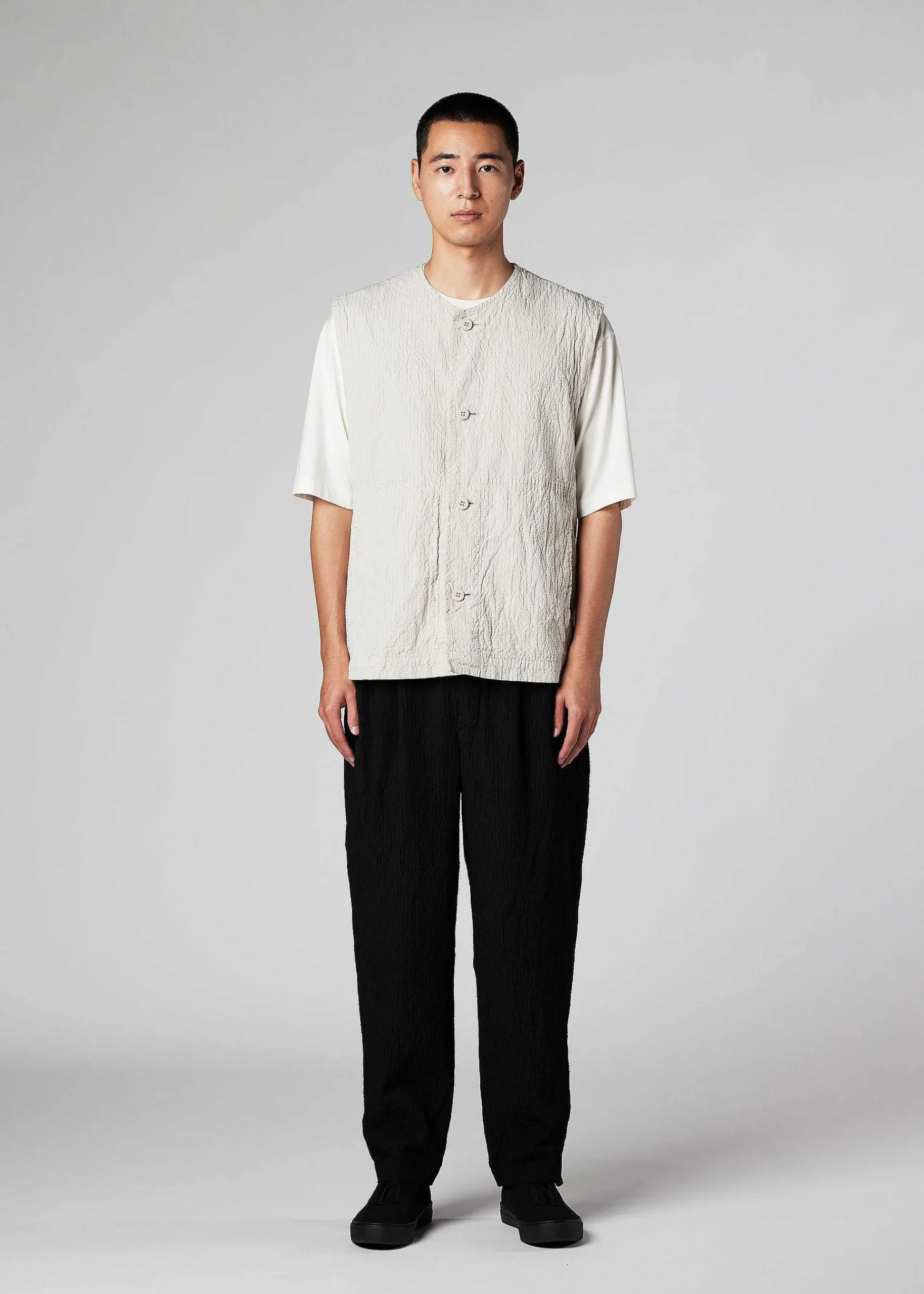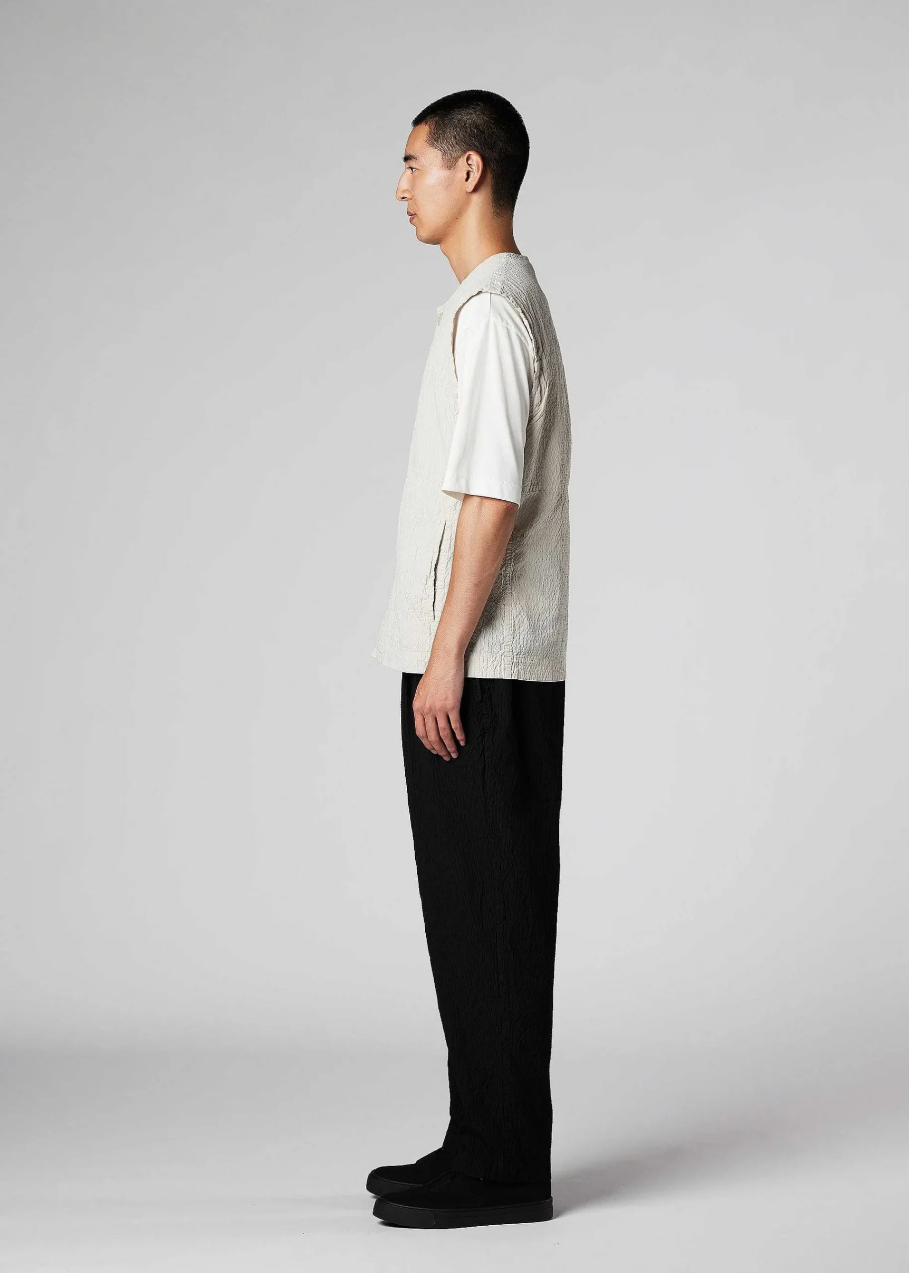 This Vest Features A Textured Textile. The Tightly Twisted Yarn Gives The Yarn Elasticity During The Garment Dyeing Process, Creating A Unique Look.