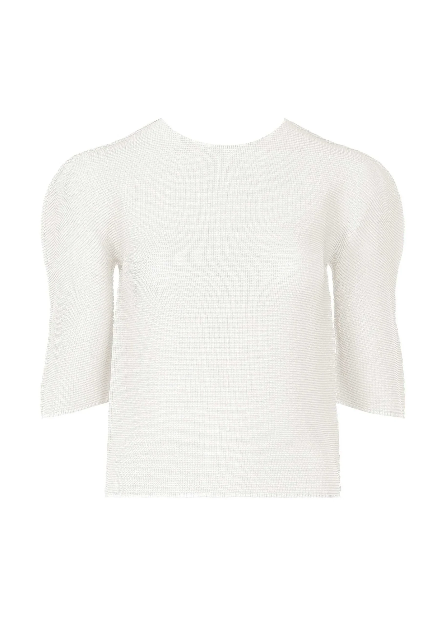 This Is A Stretch Pleated Round Neck, Three-Quarter Sleeve Top With Vertical And Horizontal Pleats.