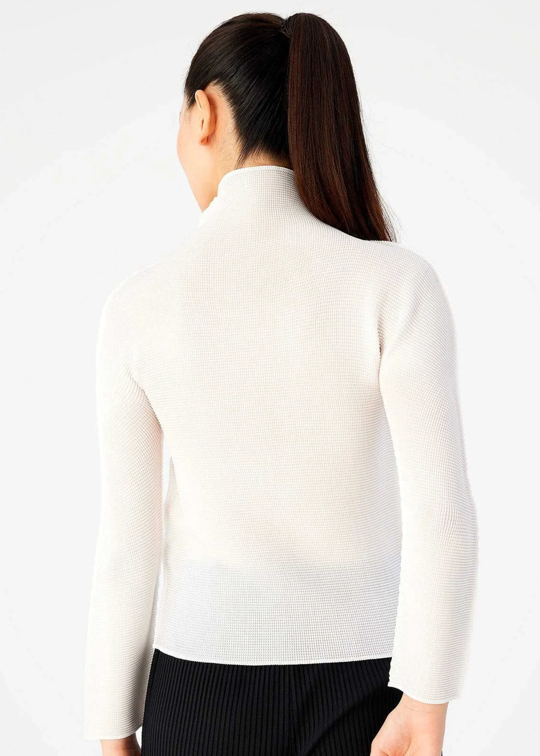 This Is A High Neck, Long Sleeve Top With Stretch Pleats That Are Pleated Vertically And Horizontally.