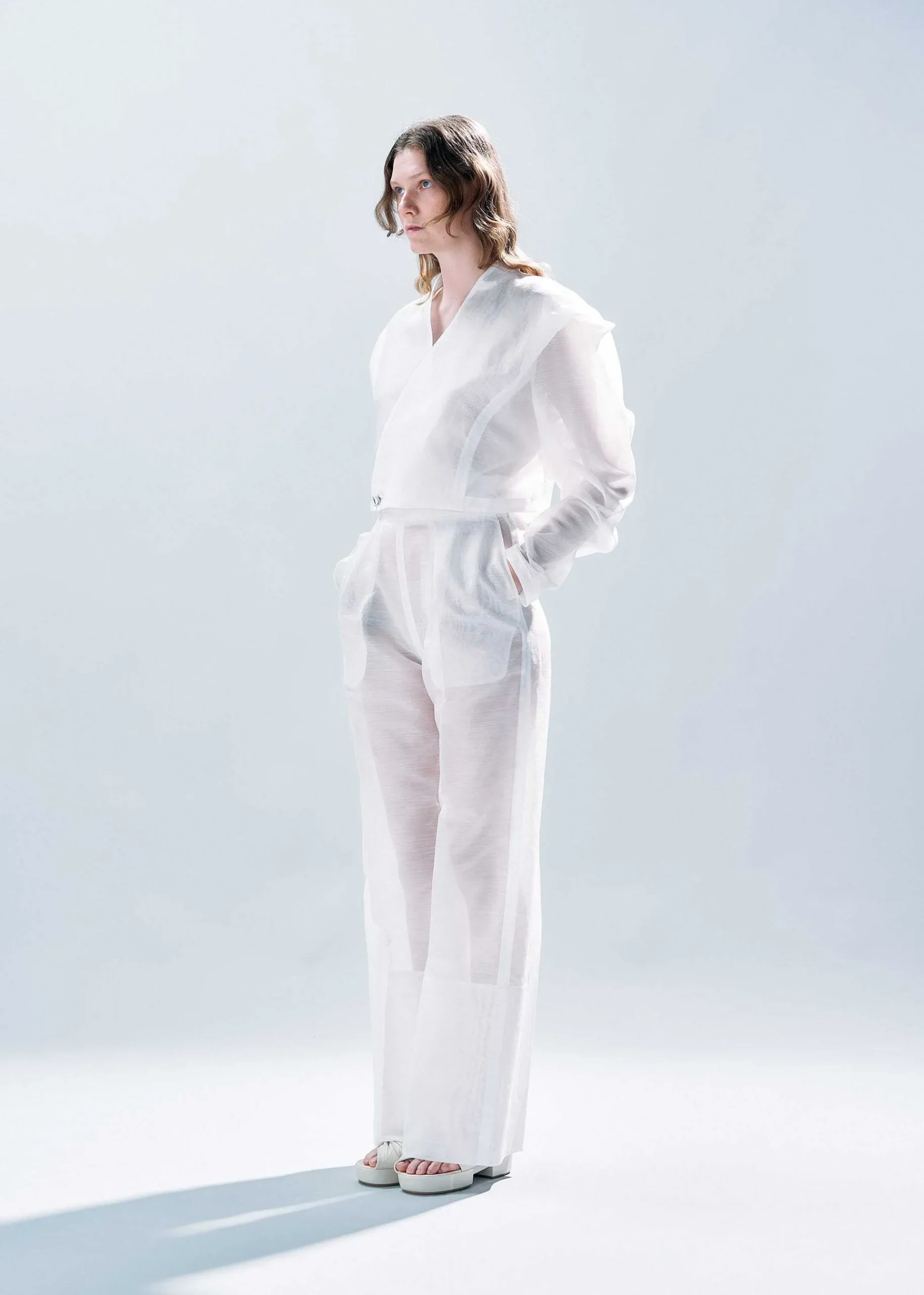 Short-Length Jacket With A Design That Makes Use Of Transparent Materials. The Fabric Is Made By Alternating Thin, Transparent Nylon Threads And Linen, Giving It A Mysterious Texture That Has The Feel Of Linen, But Is Firm And Translucent. We Have Taken Advantage Of The Transparency To Make The Folds And Overlaps Look Beautiful. We Also Created A Transparent Glass Button To Go With The Transparent Fabric. Please Remove The Button When Cleaning.