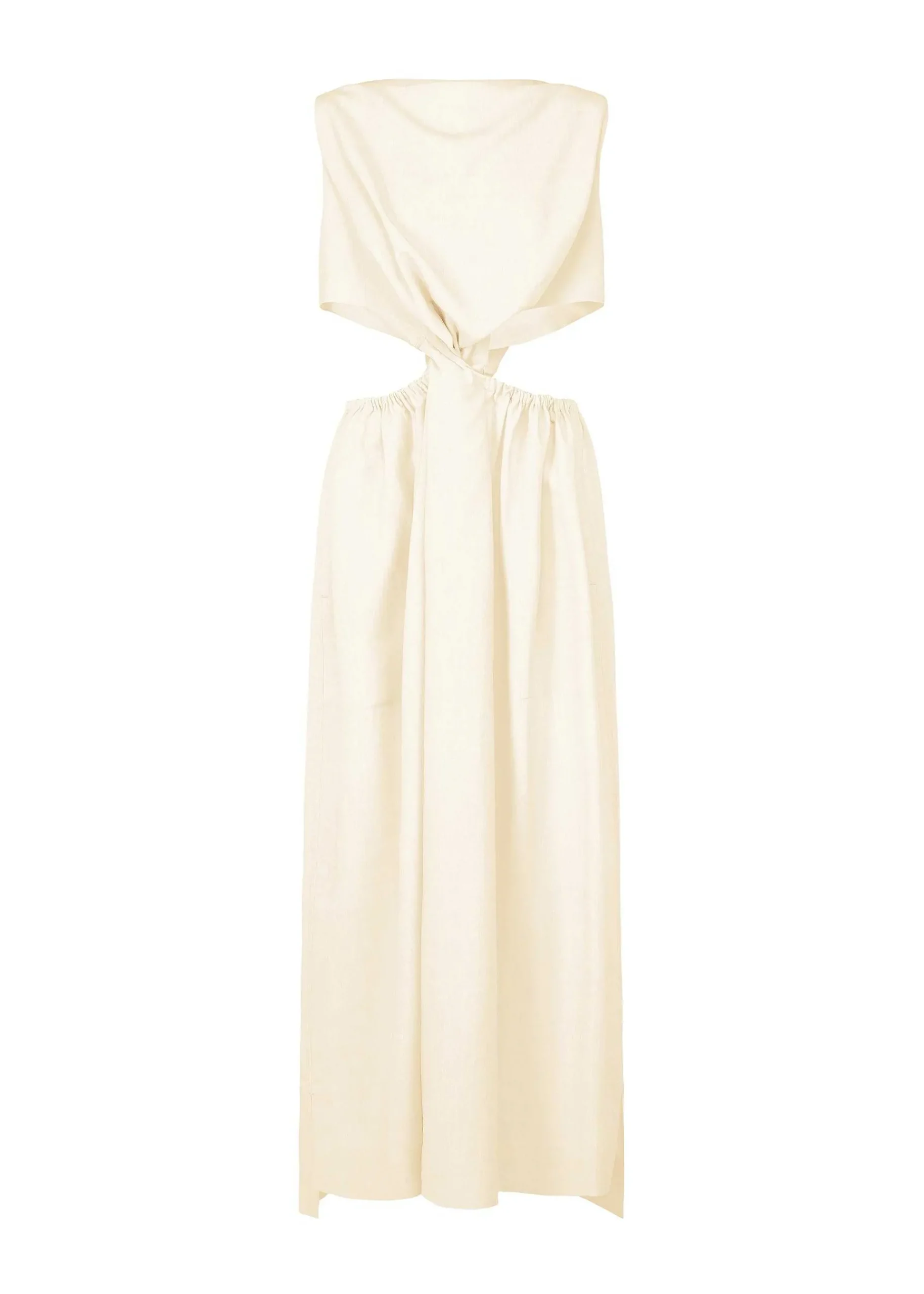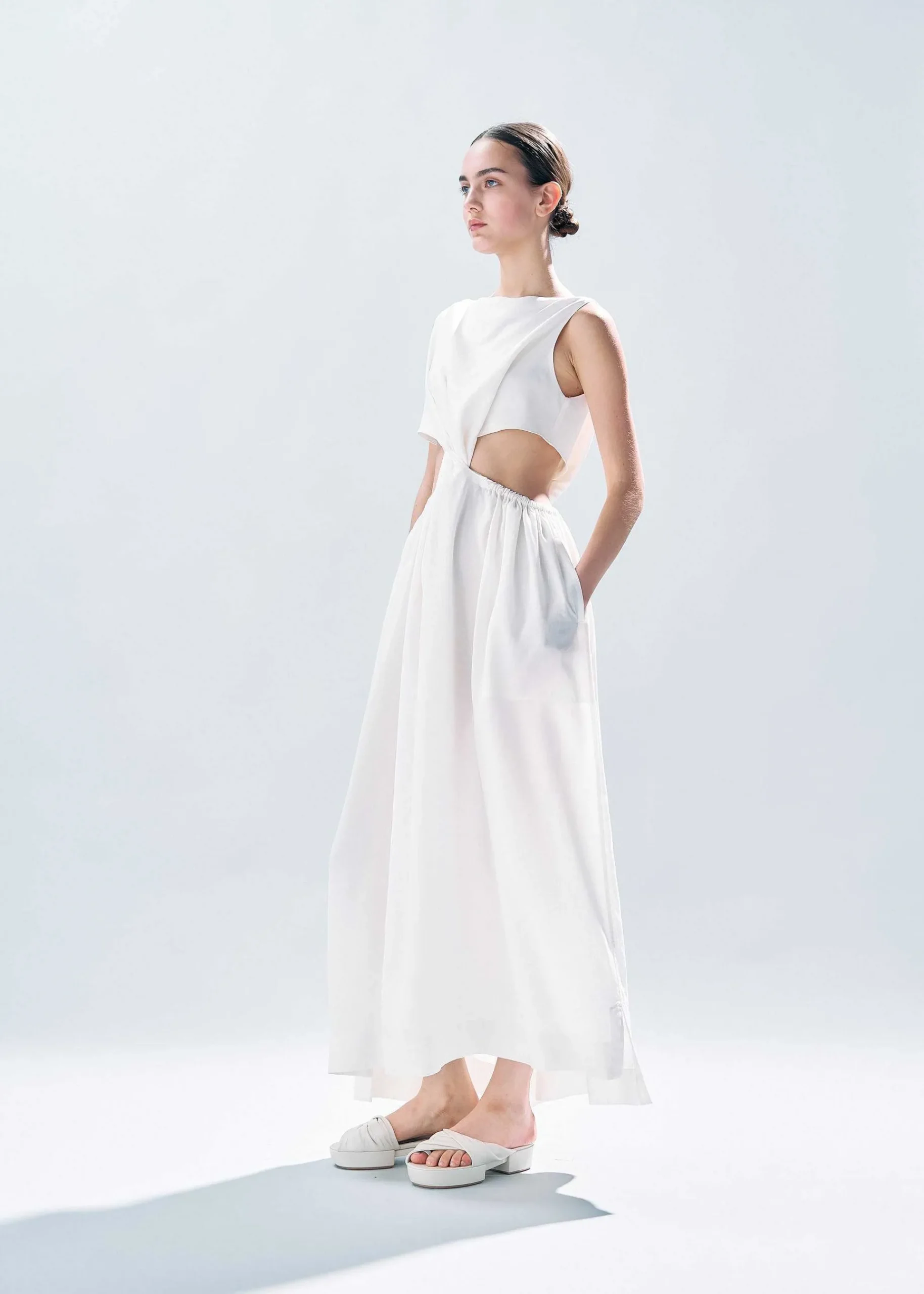 Sleeveless Dress Designed To Combine Two Items. The Twist At The Waist Is A Distinctive Feature. The Warp Threads Are Made Of Cupra Spun Yarn, While The Weft Threads Are Made Of Washi Paper And Cupra In A 1:1 Ratio, Giving The Material A Soft Luster And The Feel Of Natural Materials. The Elaborate And Careful Yarn Making Has Resulted In A Soft And Supple Texture, Despite The Washi Paper Blend.