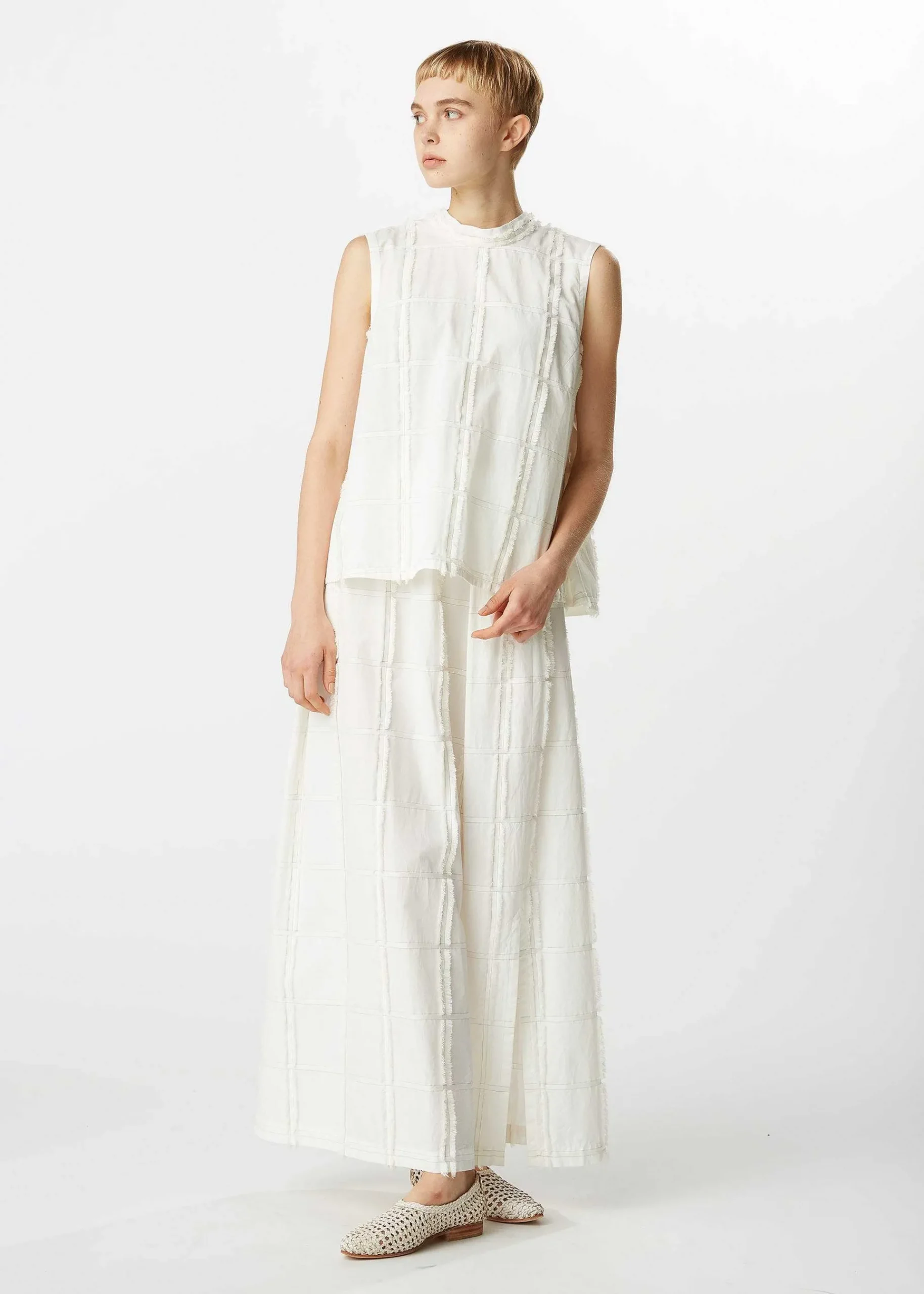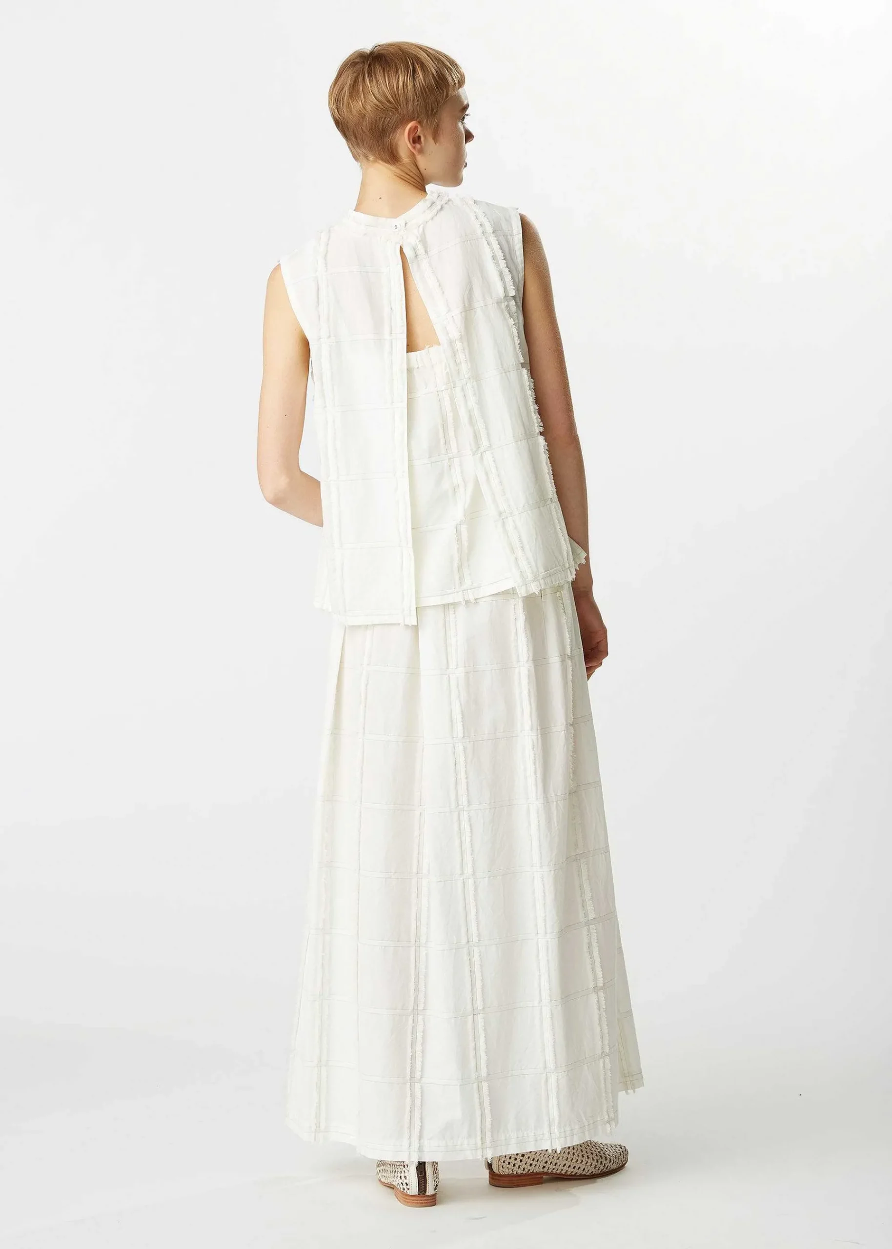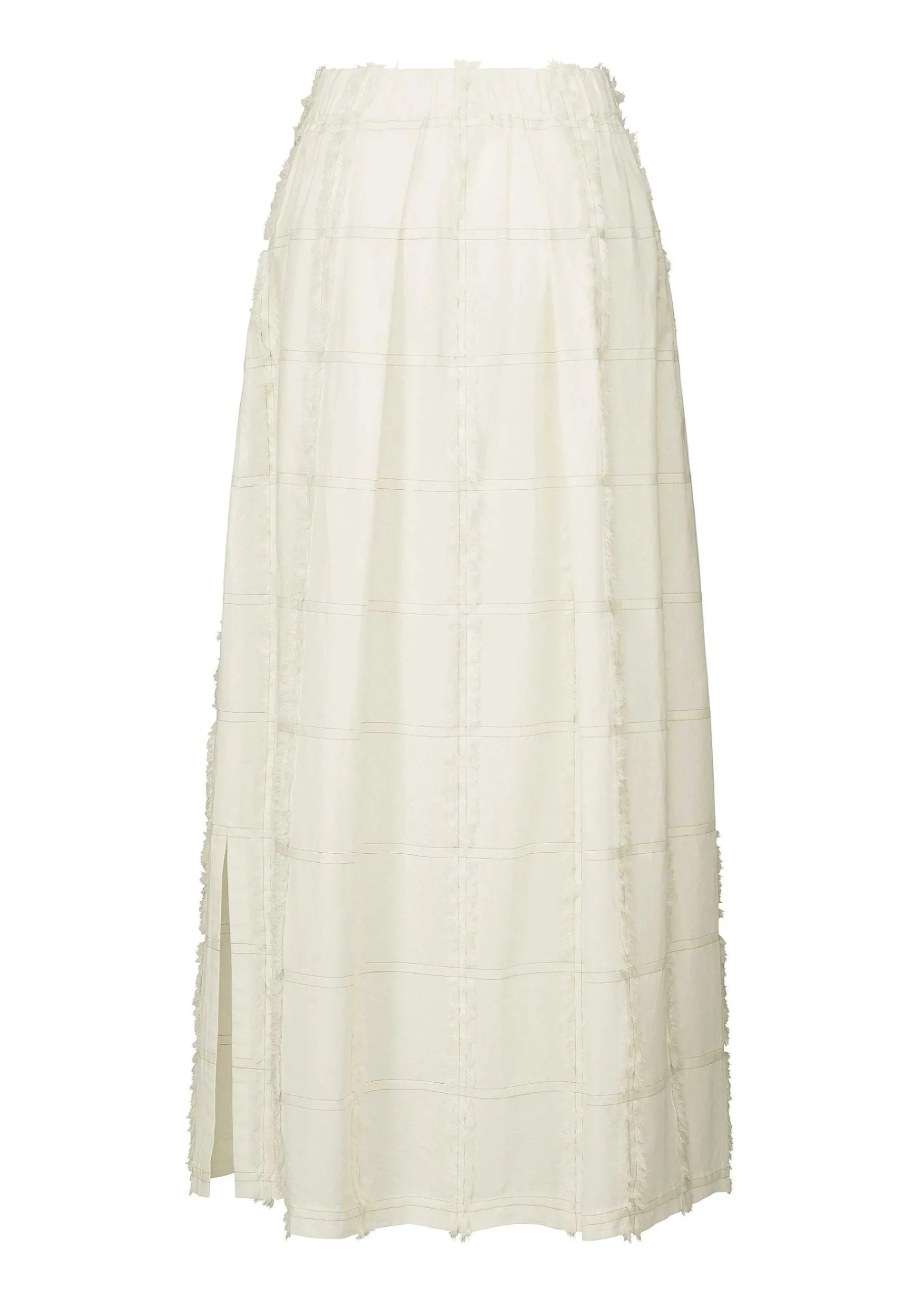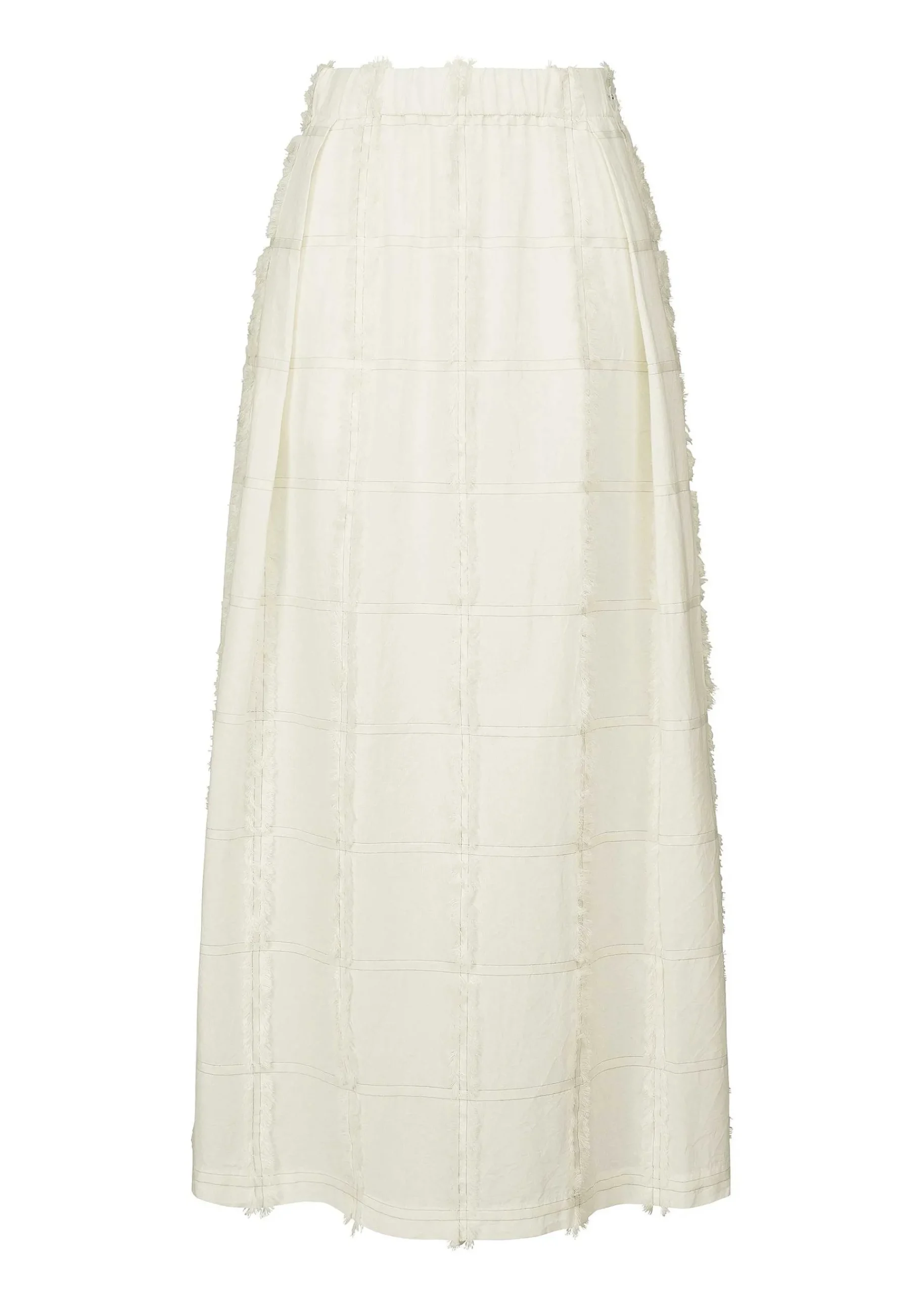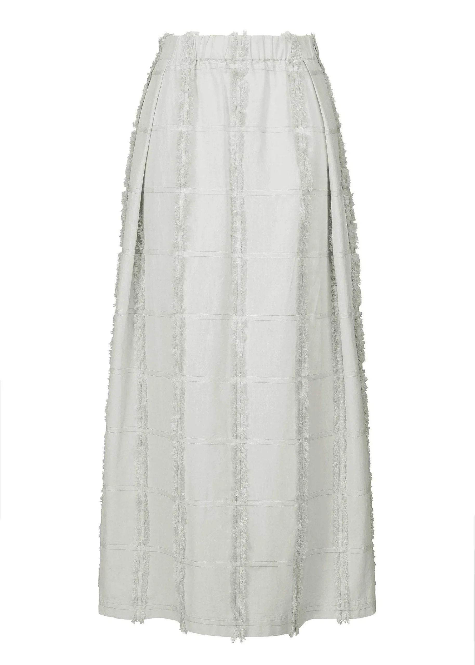 This Skirt Is Made Of 100% Organic Cotton And Has A Cool, Natural Light Color. The Lattice Pattern Is Woven With Weft Threads Cut To Create Fringes, Giving The Fabric A Unique Look. The Light Design Seems To Fill The Air As You Walk.