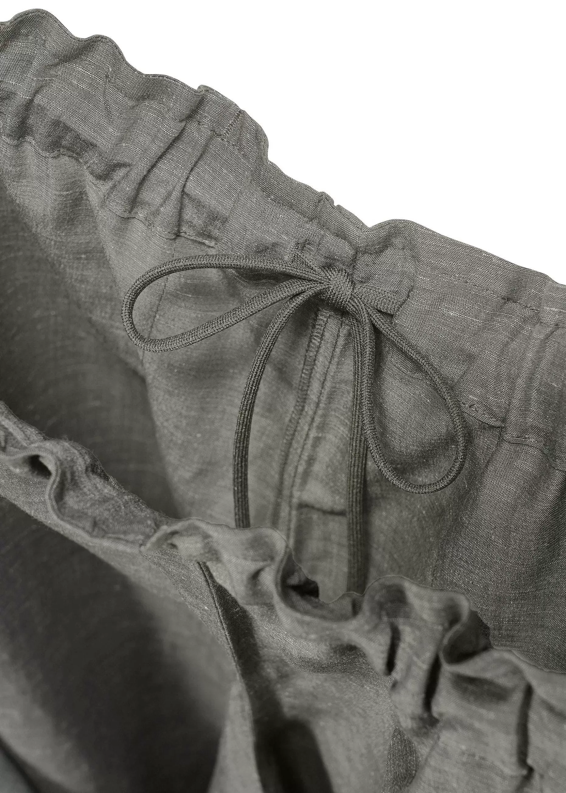 These Pants Are Characterized By A Design In Which The Fabric Turns Up Diagonally. Made From A Blend Of Recycled Polyester And Linen, The Fabric Is Textured And Wrinkle-Resistant. The Waist Is Made Of Elastic, And The Size Can Be Adjusted Using The Inner String.