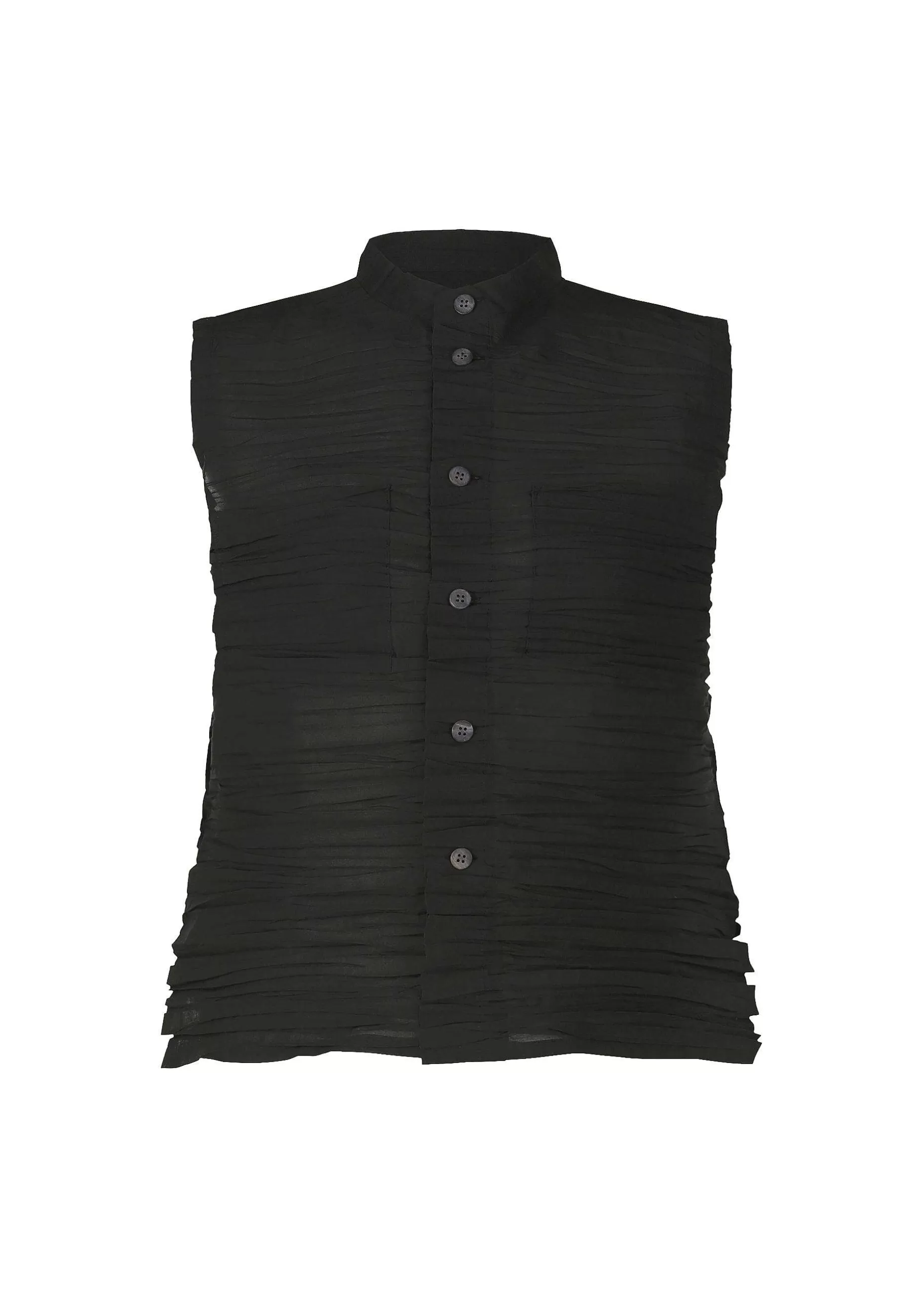 A Stand Collar Sleeveless Shirt Made Of Cotton And Polyester Voile Fabric With A Tie Finish (*). It Is Characterized By Its Moderate Thickness And Crispness. *This Is A Technique In Which The Fabric Is Folded By Hand In A Small, Random Manner, And Then Treated With Heat And High Pressure To Fix Wrinkles.
